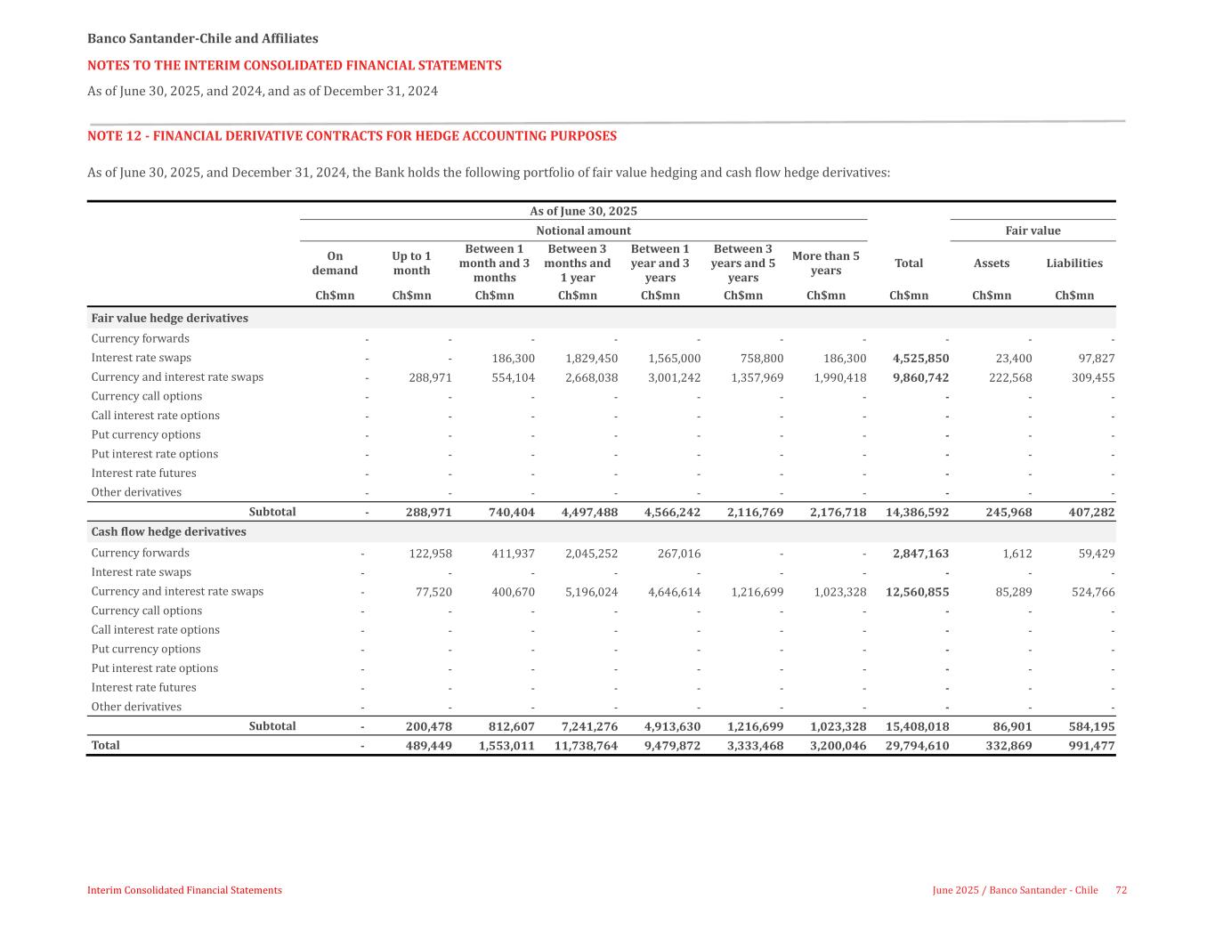 Banco Santander-Chile and Affiliates NOTES TO THE INTERIM CONSOLIDATED FINANCIAL STATEMENTS As of June 30, 2025, and 2024, and as of December 31, 2024 Interim Consolidated Financial Statements June 2025 / Banco Santander - Chile 72 NOTE 12 - FINANCIAL DERIVATIVE CONTRACTS FOR HEDGE ACCOUNTING PURPOSES As of June 30, 2025, and December 31, 2024, the Bank holds the following portfolio of fair value hedging and cash flow hedge derivatives: As of June 30, 2025 Notional amount Fair value On demand Up to 1 month Between 1 month and 3 months Between 3 months and 1 year Between 1 year and 3 years Between 3 years and 5 years More than 5 years Total Assets Liabilities Ch$mn Ch$mn Ch$mn Ch$mn Ch$mn Ch$mn Ch$mn Ch$mn Ch$mn Ch$mn Fair value hedge derivatives Currency forwards - - - - - - - - - - Interest rate swaps - - 186,300 1,829,450 1,565,000 758,800 186,300 4,525,850 23,400 97,827 Currency and interest rate swaps - 288,971 554,104 2,668,038 3,001,242 1,357,969 1,990,418 9,860,742 222,568 309,455 Currency call options - - - - - - - - - - Call interest rate options - - - - - - - - - - Put currency options - - - - - - - - - - Put interest rate options - - - - - - - - - - Interest rate futures - - - - - - - - - - Other derivatives - - - - - - - - - - Subtotal - 288,971 740,404 4,497,488 4,566,242 2,116,769 2,176,718 14,386,592 245,968 407,282 Cash flow hedge derivatives Currency forwards - 122,958 411,937 2,045,252 267,016 - - 2,847,163 1,612 59,429 Interest rate swaps - - - - - - - - - - Currency and interest rate swaps - 77,520 400,670 5,196,024 4,646,614 1,216,699 1,023,328 12,560,855 85,289 524,766 Currency call options - - - - - - - - - - Call interest rate options - - - - - - - - - - Put currency options - - - - - - - - - - Put interest rate options - - - - - - - - - - Interest rate futures - - - - - - - - - - Other derivatives - - - - - - - - - - Subtotal - 200,478 812,607 7,241,276 4,913,630 1,216,699 1,023,328 15,408,018 86,901 584,195 Total - 489,449 1,553,011 11,738,764 9,479,872 3,333,468 3,200,046 29,794,610 332,869 991,477