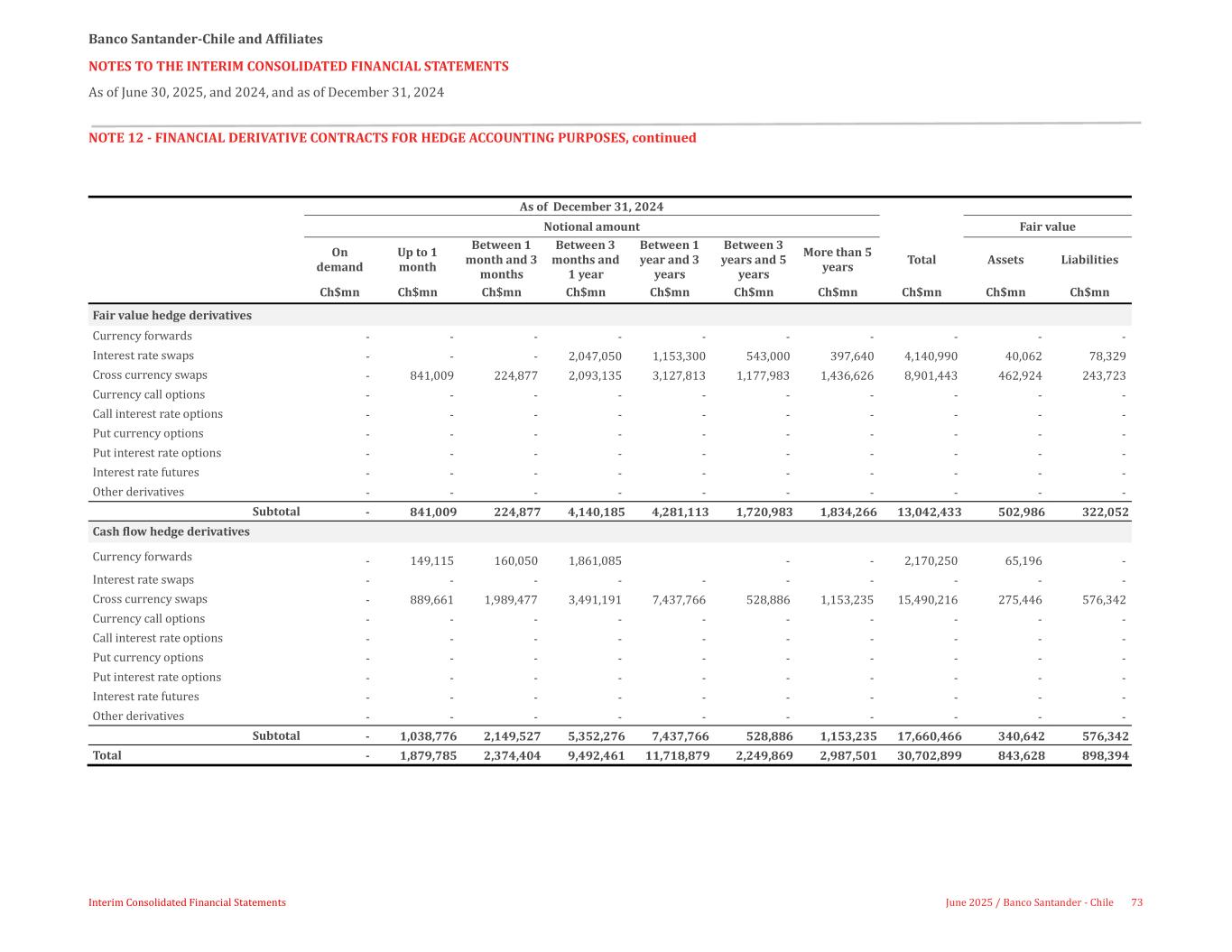 Banco Santander-Chile and Affiliates NOTES TO THE INTERIM CONSOLIDATED FINANCIAL STATEMENTS As of June 30, 2025, and 2024, and as of December 31, 2024 Interim Consolidated Financial Statements June 2025 / Banco Santander - Chile 73 NOTE 12 - FINANCIAL DERIVATIVE CONTRACTS FOR HEDGE ACCOUNTING PURPOSES, continued As of December 31, 2024 Notional amount Fair value On demand Up to 1 month Between 1 month and 3 months Between 3 months and 1 year Between 1 year and 3 years Between 3 years and 5 years More than 5 years Total Assets Liabilities Ch$mn Ch$mn Ch$mn Ch$mn Ch$mn Ch$mn Ch$mn Ch$mn Ch$mn Ch$mn Fair value hedge derivatives Currency forwards - - - - - - - - - - Interest rate swaps - - - 2,047,050 1,153,300 543,000 397,640 4,140,990 40,062 78,329 Cross currency swaps - 841,009 224,877 2,093,135 3,127,813 1,177,983 1,436,626 8,901,443 462,924 243,723 Currency call options - - - - - - - - - - Call interest rate options - - - - - - - - - - Put currency options - - - - - - - - - - Put interest rate options - - - - - - - - - - Interest rate futures - - - - - - - - - - Other derivatives - - - - - - - - - - Subtotal - 841,009 224,877 4,140,185 4,281,113 1,720,983 1,834,266 13,042,433 502,986 322,052 Cash flow hedge derivatives Currency forwards - 149,115 160,050 1,861,085 - - 2,170,250 65,196 - Interest rate swaps - - - - - - - - - - Cross currency swaps - 889,661 1,989,477 3,491,191 7,437,766 528,886 1,153,235 15,490,216 275,446 576,342 Currency call options - - - - - - - - - - Call interest rate options - - - - - - - - - - Put currency options - - - - - - - - - - Put interest rate options - - - - - - - - - - Interest rate futures - - - - - - - - - - Other derivatives - - - - - - - - - - Subtotal - 1,038,776 2,149,527 5,352,276 7,437,766 528,886 1,153,235 17,660,466 340,642 576,342 Total - 1,879,785 2,374,404 9,492,461 11,718,879 2,249,869 2,987,501 30,702,899 843,628 898,394