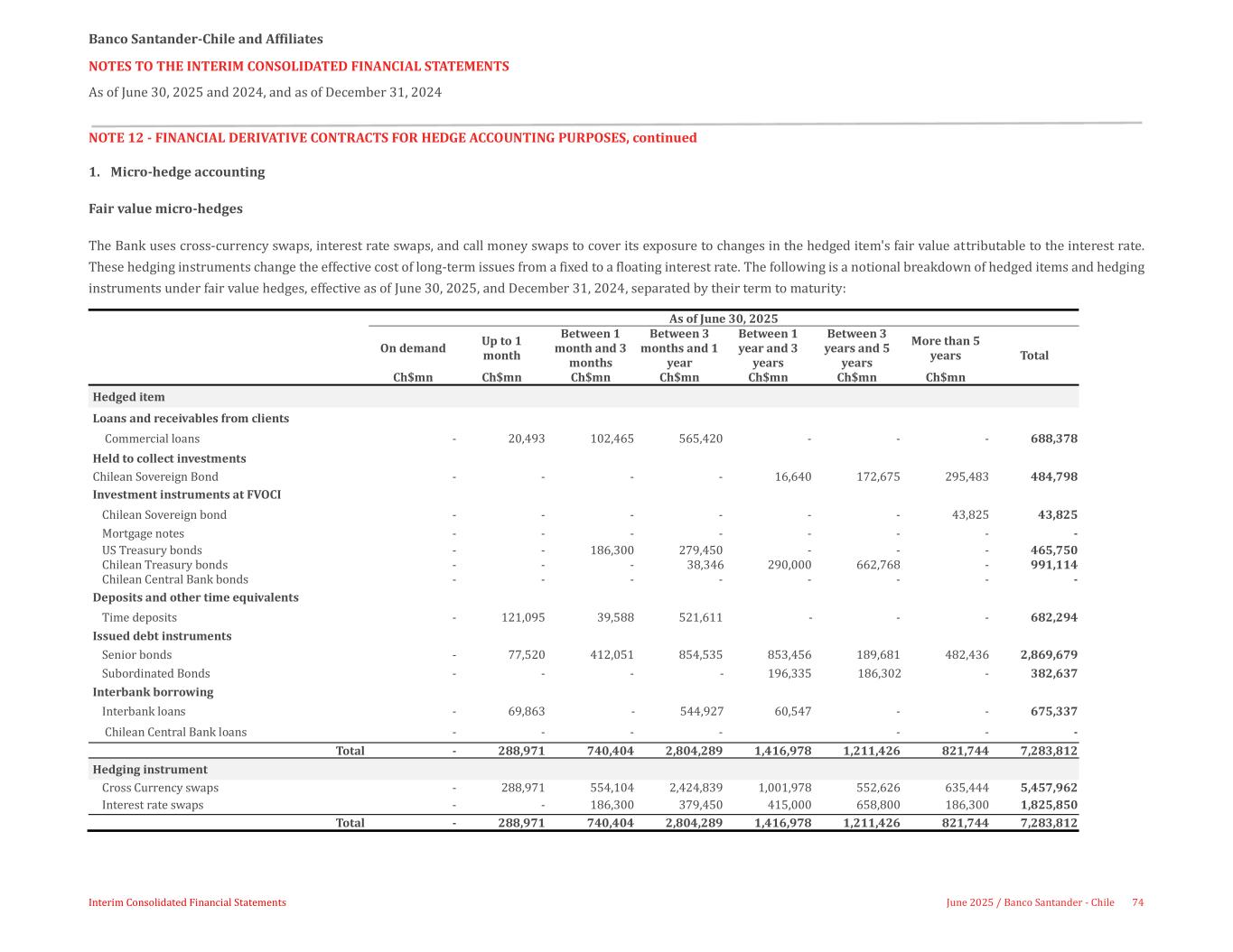 Banco Santander-Chile and Affiliates NOTES TO THE INTERIM CONSOLIDATED FINANCIAL STATEMENTS As of June 30, 2025 and 2024, and as of December 31, 2024 Interim Consolidated Financial Statements June 2025 / Banco Santander - Chile 74 NOTE 12 - FINANCIAL DERIVATIVE CONTRACTS FOR HEDGE ACCOUNTING PURPOSES, continued 1. Micro-hedge accounting Fair value micro-hedges The Bank uses cross-currency swaps, interest rate swaps, and call money swaps to cover its exposure to changes in the hedged item's fair value attributable to the interest rate. These hedging instruments change the effective cost of long-term issues from a fixed to a floating interest rate. The following is a notional breakdown of hedged items and hedging instruments under fair value hedges, effective as of June 30, 2025, and December 31, 2024, separated by their term to maturity: As of June 30, 2025 On demand Up to 1 month Between 1 month and 3 months Between 3 months and 1 year Between 1 year and 3 years Between 3 years and 5 years More than 5 years Total Ch$mn Ch$mn Ch$mn Ch$mn Ch$mn Ch$mn Ch$mn Hedged item Loans and receivables from clients Commercial loans - 20,493 102,465 565,420 - - - 688,378 Held to collect investments Chilean Sovereign Bond - - - - 16,640 172,675 295,483 484,798 Investment instruments at FVOCI Chilean Sovereign bond - - - - - - 43,825 43,825 Mortgage notes - - - - - - - - US Treasury bonds - - 186,300 279,450 - - - 465,750 Chilean Treasury bonds - - - 38,346 290,000 662,768 - 991,114 Chilean Central Bank bonds - - - - - - - - Deposits and other time equivalents Time deposits - 121,095 39,588 521,611 - - - 682,294 Issued debt instruments Senior bonds - 77,520 412,051 854,535 853,456 189,681 482,436 2,869,679 Subordinated Bonds - - - - 196,335 186,302 - 382,637 Interbank borrowing Interbank loans - 69,863 - 544,927 60,547 - - 675,337 Chilean Central Bank loans - - - - - - - Total - 288,971 740,404 2,804,289 1,416,978 1,211,426 821,744 7,283,812 Hedging instrument Cross Currency swaps - 288,971 554,104 2,424,839 1,001,978 552,626 635,444 5,457,962 Interest rate swaps - - 186,300 379,450 415,000 658,800 186,300 1,825,850 Total - 288,971 740,404 2,804,289 1,416,978 1,211,426 821,744 7,283,812