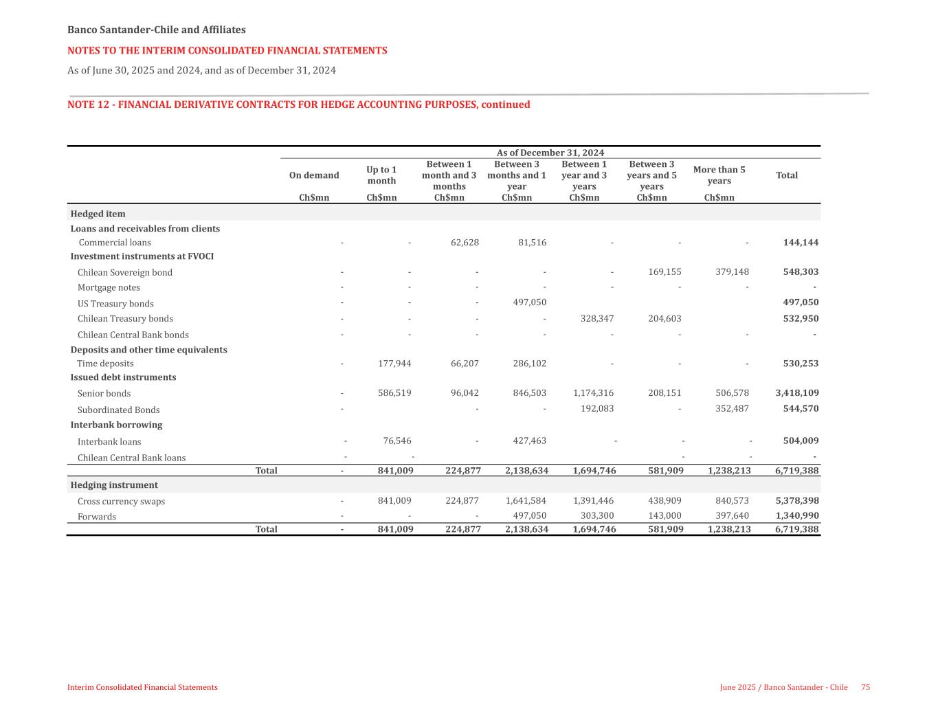 Banco Santander-Chile and Affiliates NOTES TO THE INTERIM CONSOLIDATED FINANCIAL STATEMENTS As of June 30, 2025 and 2024, and as of December 31, 2024 Interim Consolidated Financial Statements June 2025 / Banco Santander - Chile 75 NOTE 12 - FINANCIAL DERIVATIVE CONTRACTS FOR HEDGE ACCOUNTING PURPOSES, continued As of December 31, 2024 On demand Up to 1 month Between 1 month and 3 months Between 3 months and 1 year Between 1 year and 3 years Between 3 years and 5 years More than 5 years Total Ch$mn Ch$mn Ch$mn Ch$mn Ch$mn Ch$mn Ch$mn Hedged item Loans and receivables from clients Commercial loans - - 62,628 81,516 - - - 144,144 Investment instruments at FVOCI Chilean Sovereign bond - - - - - 169,155 379,148 548,303 Mortgage notes - - - - - - - - US Treasury bonds - - - 497,050 497,050 Chilean Treasury bonds - - - - 328,347 204,603 532,950 Chilean Central Bank bonds - - - - - - - - Deposits and other time equivalents Time deposits - 177,944 66,207 286,102 - - - 530,253 Issued debt instruments Senior bonds - 586,519 96,042 846,503 1,174,316 208,151 506,578 3,418,109 Subordinated Bonds - - - 192,083 - 352,487 544,570 Interbank borrowing Interbank loans - 76,546 - 427,463 - - - 504,009 Chilean Central Bank loans - - - - - Total - 841,009 224,877 2,138,634 1,694,746 581,909 1,238,213 6,719,388 Hedging instrument Cross currency swaps - 841,009 224,877 1,641,584 1,391,446 438,909 840,573 5,378,398 Forwards - - - 497,050 303,300 143,000 397,640 1,340,990 Total - 841,009 224,877 2,138,634 1,694,746 581,909 1,238,213 6,719,388