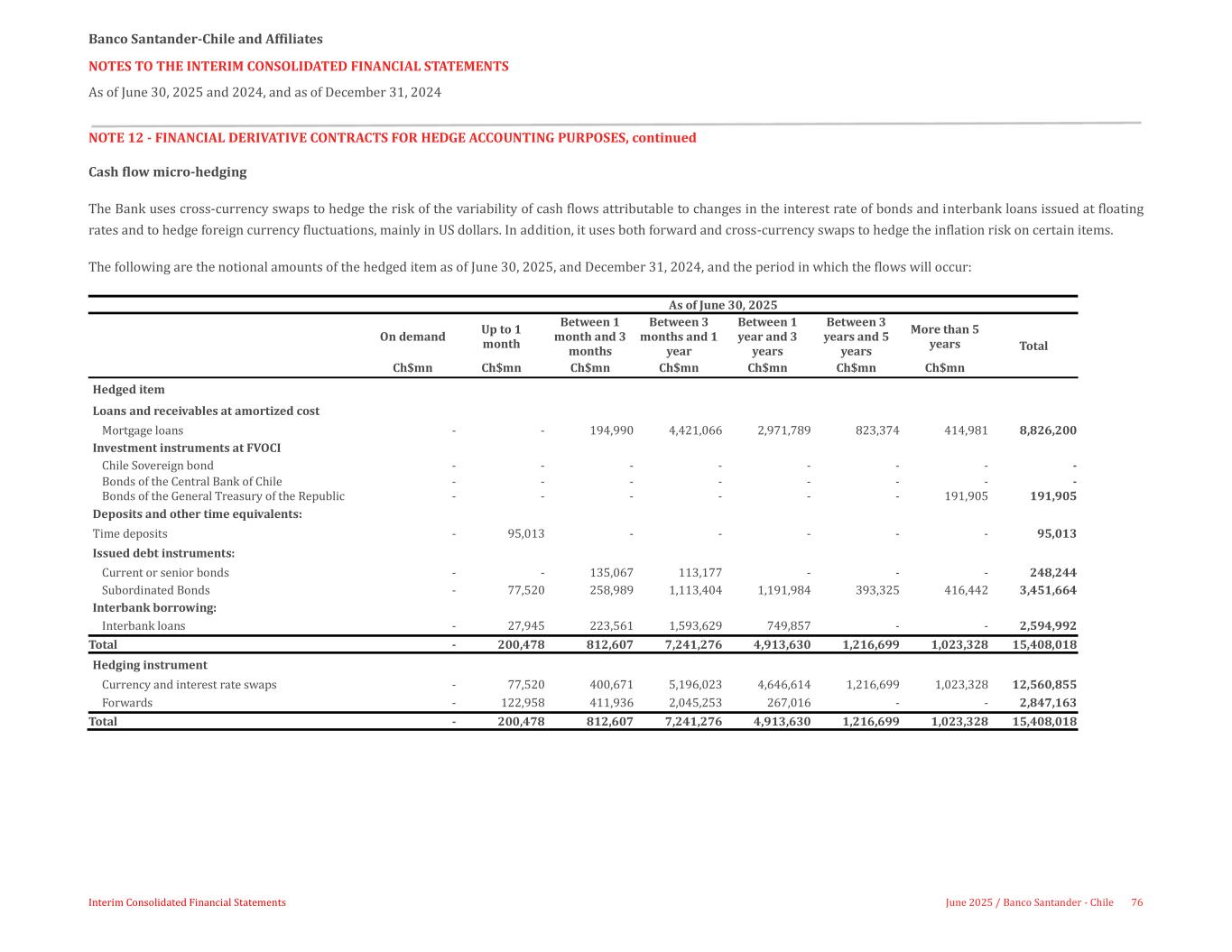 Banco Santander-Chile and Affiliates NOTES TO THE INTERIM CONSOLIDATED FINANCIAL STATEMENTS As of June 30, 2025 and 2024, and as of December 31, 2024 Interim Consolidated Financial Statements June 2025 / Banco Santander - Chile 76 NOTE 12 - FINANCIAL DERIVATIVE CONTRACTS FOR HEDGE ACCOUNTING PURPOSES, continued Cash flow micro-hedging The Bank uses cross-currency swaps to hedge the risk of the variability of cash flows attributable to changes in the interest rate of bonds and interbank loans issued at floating rates and to hedge foreign currency fluctuations, mainly in US dollars. In addition, it uses both forward and cross-currency swaps to hedge the inflation risk on certain items. The following are the notional amounts of the hedged item as of June 30, 2025, and December 31, 2024, and the period in which the flows will occur: As of June 30, 2025 On demand Up to 1 month Between 1 month and 3 months Between 3 months and 1 year Between 1 year and 3 years Between 3 years and 5 years More than 5 years Total Ch$mn Ch$mn Ch$mn Ch$mn Ch$mn Ch$mn Ch$mn Hedged item Loans and receivables at amortized cost Mortgage loans - - 194,990 4,421,066 2,971,789 823,374 414,981 8,826,200 Investment instruments at FVOCI Chile Sovereign bond - - - - - - - - Bonds of the Central Bank of Chile - - - - - - - - Bonds of the General Treasury of the Republic - - - - - - 191,905 191,905 Deposits and other time equivalents: Time deposits - 95,013 - - - - - 95,013 Issued debt instruments: Current or senior bonds - - 135,067 113,177 - - - 248,244 Subordinated Bonds - 77,520 258,989 1,113,404 1,191,984 393,325 416,442 3,451,664 Interbank borrowing: Interbank loans - 27,945 223,561 1,593,629 749,857 - - 2,594,992 Total - 200,478 812,607 7,241,276 4,913,630 1,216,699 1,023,328 15,408,018 Hedging instrument Currency and interest rate swaps - 77,520 400,671 5,196,023 4,646,614 1,216,699 1,023,328 12,560,855 Forwards - 122,958 411,936 2,045,253 267,016 - - 2,847,163 Total - 200,478 812,607 7,241,276 4,913,630 1,216,699 1,023,328 15,408,018