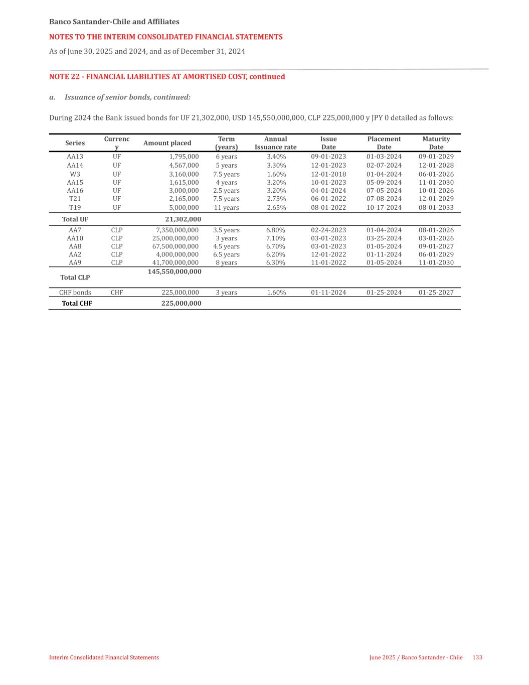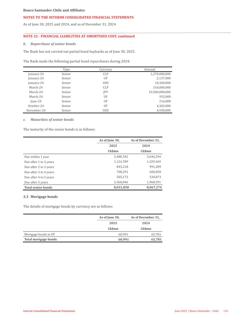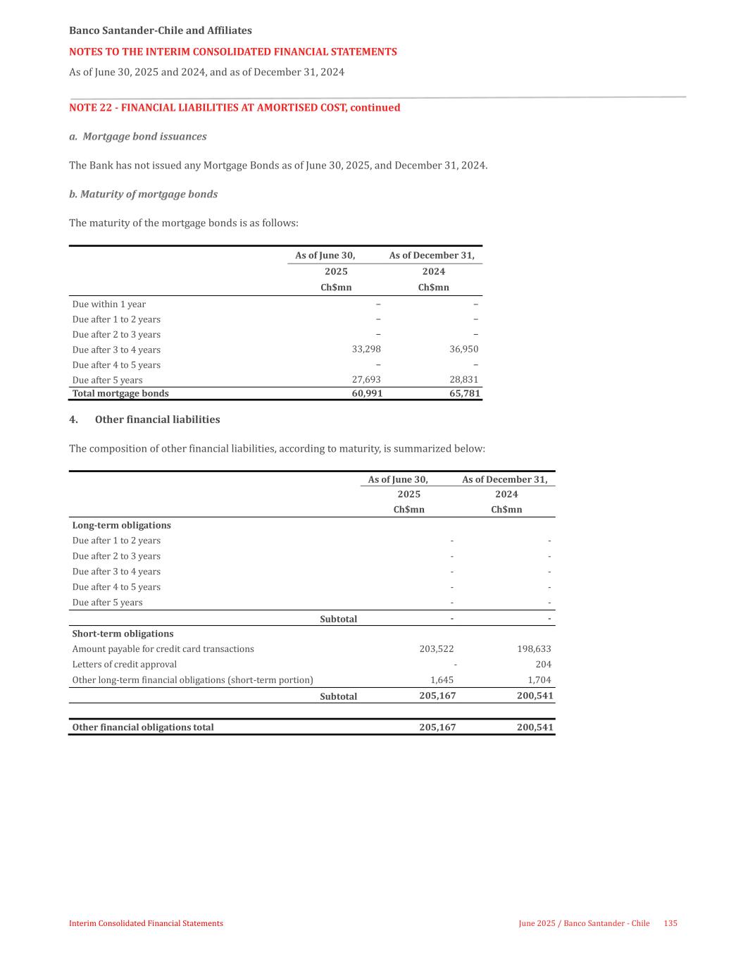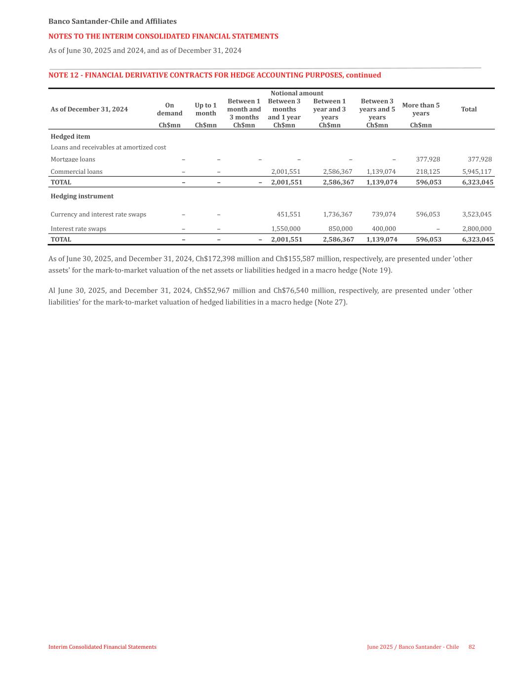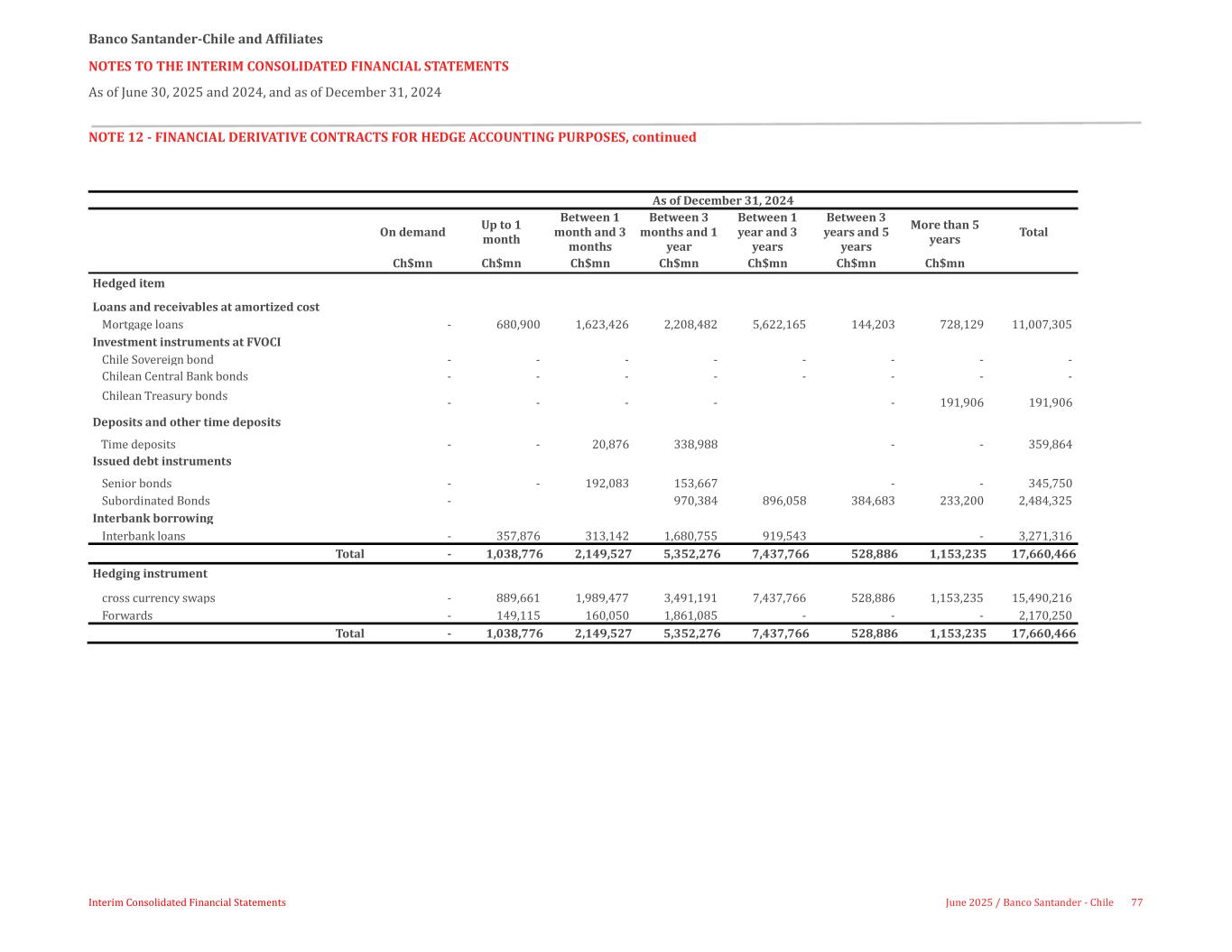 Banco Santander-Chile and Affiliates NOTES TO THE INTERIM CONSOLIDATED FINANCIAL STATEMENTS As of June 30, 2025 and 2024, and as of December 31, 2024 Interim Consolidated Financial Statements June 2025 / Banco Santander - Chile 77 NOTE 12 - FINANCIAL DERIVATIVE CONTRACTS FOR HEDGE ACCOUNTING PURPOSES, continued As of December 31, 2024 On demand Up to 1 month Between 1 month and 3 months Between 3 months and 1 year Between 1 year and 3 years Between 3 years and 5 years More than 5 years Total Ch$mn Ch$mn Ch$mn Ch$mn Ch$mn Ch$mn Ch$mn Hedged item Loans and receivables at amortized cost Mortgage loans - 680,900 1,623,426 2,208,482 5,622,165 144,203 728,129 11,007,305 Investment instruments at FVOCI Chile Sovereign bond - - - - - - - - Chilean Central Bank bonds - - - - - - - - Chilean Treasury bonds - - - - - 191,906 191,906 Deposits and other time deposits Time deposits - - 20,876 338,988 - - 359,864 Issued debt instruments Senior bonds - - 192,083 153,667 - - 345,750 Subordinated Bonds - 970,384 896,058 384,683 233,200 2,484,325 Interbank borrowing Interbank loans - 357,876 313,142 1,680,755 919,543 - 3,271,316 Total - 1,038,776 2,149,527 5,352,276 7,437,766 528,886 1,153,235 17,660,466 Hedging instrument cross currency swaps - 889,661 1,989,477 3,491,191 7,437,766 528,886 1,153,235 15,490,216 Forwards - 149,115 160,050 1,861,085 - - - 2,170,250 Total - 1,038,776 2,149,527 5,352,276 7,437,766 528,886 1,153,235 17,660,466