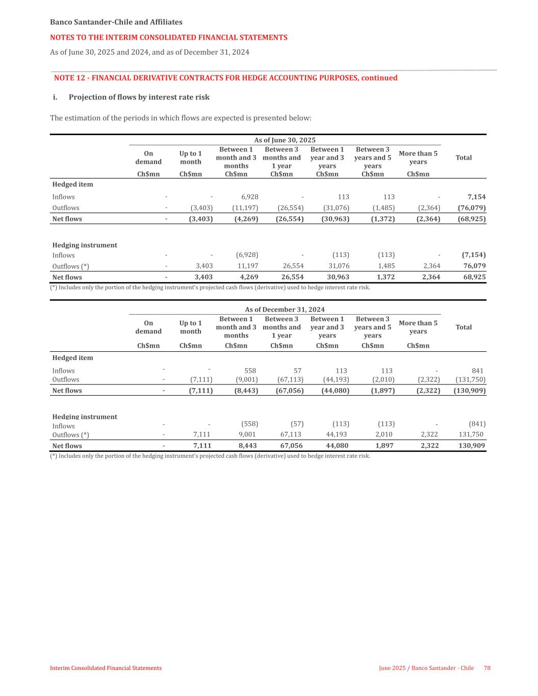 Banco Santander-Chile and Affiliates NOTES TO THE INTERIM CONSOLIDATED FINANCIAL STATEMENTS As of June 30, 2025 and 2024, and as of December 31, 2024 Interim Consolidated Financial Statements June 2025 / Banco Santander - Chile 78 NOTE 12 - FINANCIAL DERIVATIVE CONTRACTS FOR HEDGE ACCOUNTING PURPOSES, continued i. Projection of flows by interest rate risk The estimation of the periods in which flows are expected is presented below: As of June 30, 2025 On demand Up to 1 month Between 1 month and 3 months Between 3 months and 1 year Between 1 year and 3 years Between 3 years and 5 years More than 5 years Total Ch$mn Ch$mn Ch$mn Ch$mn Ch$mn Ch$mn Ch$mn Hedged item Inflows - - 6,928 - 113 113 - 7,154 Outflows - (3,403) (11,197) (26,554) (31,076) (1,485) (2,364) (76,079) Net flows - (3,403) (4,269) (26,554) (30,963) (1,372) (2,364) (68,925) Hedging instrument Inflows - - (6,928) - (113) (113) - (7,154) Outflows (*) - 3,403 11,197 26,554 31,076 1,485 2,364 76,079 Net flows - 3,403 4,269 26,554 30,963 1,372 2,364 68,925 (*) Includes only the portion of the hedging instrument's projected cash flows (derivative) used to hedge interest rate risk. As of December 31, 2024 On demand Up to 1 month Between 1 month and 3 months Between 3 months and 1 year Between 1 year and 3 years Between 3 years and 5 years More than 5 years Total Ch$mn Ch$mn Ch$mn Ch$mn Ch$mn Ch$mn Ch$mn Hedged item Inflows - - 558 57 113 113 - 841 Outflows - (7,111) (9,001) (67,113) (44,193) (2,010) (2,322) (131,750) Net flows - (7,111) (8,443) (67,056) (44,080) (1,897) (2,322) (130,909) Hedging instrument Inflows - - (558) (57) (113) (113) - (841) Outflows (*) - 7,111 9,001 67,113 44,193 2,010 2,322 131,750 Net flows - 7,111 8,443 67,056 44,080 1,897 2,322 130,909 (*) Includes only the portion of the hedging instrument's projected cash flows (derivative) used to hedge interest rate risk.
