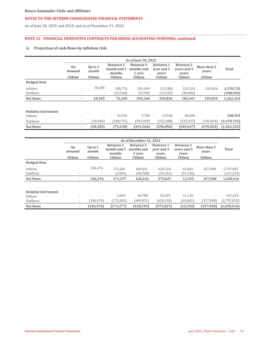 Banco Santander-Chile and Affiliates NOTES TO THE INTERIM CONSOLIDATED FINANCIAL STATEMENTS As of June 30, 2025 and 2024, and as of December 31, 2024 Interim Consolidated Financial Statements June 2025 / Banco Santander - Chile 79 NOTE 12 - FINANCIAL DERIVATIVE CONTRACTS FOR HEDGE ACCOUNTING PURPOSES, continued ii. Projection of cash flows by inflation risk: As of June 30, 2025 On demand Up to 1 month Between 1 month and 3 months Between 3 months and 1 year Between 1 year and 3 years Between 3 years and 5 years More than 5 years Total Ch$mn Ch$mn Ch$mn Ch$mn Ch$mn Ch$mn Ch$mn Hedged item Inflows - 18,185 108,776 501,069 312,388 235,253 195,054 1,370,725 Outflows - - (33,546) (9,709) (15,532) (49,606) - (108,393) Net flows - 18,185 75,230 491,360 296,856 185,647 195,054 1,262,332 Hedging instrument Inflows - - 33,546 9,709 15,532 49,606 - 108,393 Outflows - (18,185) (108,776) (501,069) (312,388) (235,253) (195,054) (1,370,725) Net flows - (18,185) (75,230) (491,360) (296,856) (185,647) (195,054) (1,262,332) As of December 31, 2024 On demand Up to 1 month Between 1 month and 3 months Between 3 months and 1 year Between 1 year and 3 years Between 3 years and 5 years More than 5 years Total Ch$mn Ch$mn Ch$mn Ch$mn Ch$mn Ch$mn Ch$mn Hedged item Inflows - 106,476 173,281 469,031 628,318 63,681 357,048 1,797,835 Outflows - - (2,004) (40,788) (53,291) (51,136) - (147,219) Net flows - 106,476 171,277 428,243 575,027 12,545 357,048 1,650,616 Hedging instrument Inflows - - 2,004 40,788 53,291 51,136 - 147,219 Outflows - (106,476) (173,281) (469,031) (628,318) (63,681) (357,048) (1,797,835) Net flows - (106,476) (171,277) (428,243) (575,027) (12,545) (357,048) (1,650,616)
