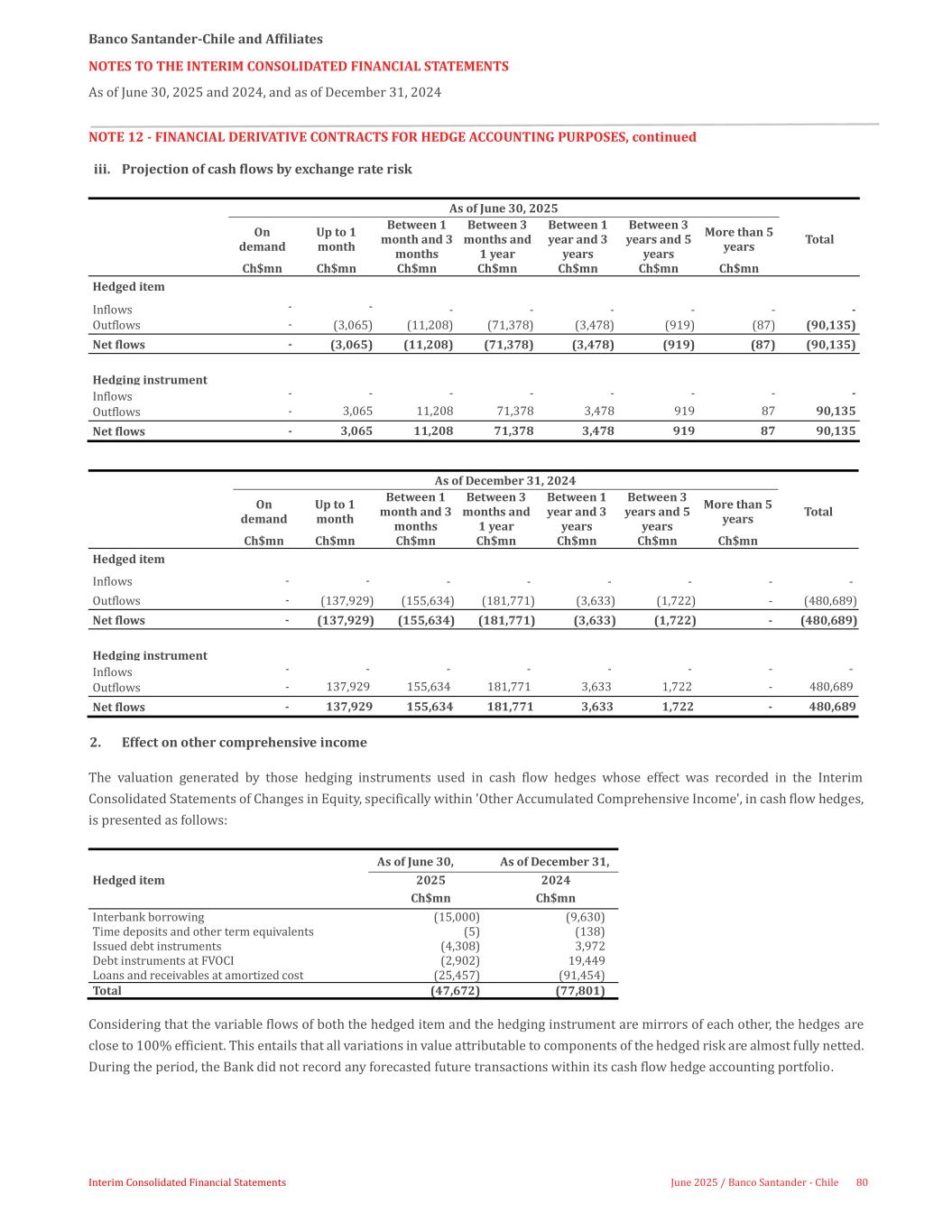 Banco Santander-Chile and Affiliates NOTES TO THE INTERIM CONSOLIDATED FINANCIAL STATEMENTS As of June 30, 2025 and 2024, and as of December 31, 2024 Interim Consolidated Financial Statements June 2025 / Banco Santander - Chile 80 NOTE 12 - FINANCIAL DERIVATIVE CONTRACTS FOR HEDGE ACCOUNTING PURPOSES, continued iii. Projection of cash flows by exchange rate risk As of June 30, 2025 On demand Up to 1 month Between 1 month and 3 months Between 3 months and 1 year Between 1 year and 3 years Between 3 years and 5 years More than 5 years Total Ch$mn Ch$mn Ch$mn Ch$mn Ch$mn Ch$mn Ch$mn Hedged item Inflows - - - - - - - - Outflows - (3,065) (11,208) (71,378) (3,478) (919) (87) (90,135) Net flows - (3,065) (11,208) (71,378) (3,478) (919) (87) (90,135) Hedging instrument Inflows - - - - - - - - Outflows - 3,065 11,208 71,378 3,478 919 87 90,135 Net flows - 3,065 11,208 71,378 3,478 919 87 90,135 As of December 31, 2024 On demand Up to 1 month Between 1 month and 3 months Between 3 months and 1 year Between 1 year and 3 years Between 3 years and 5 years More than 5 years Total Ch$mn Ch$mn Ch$mn Ch$mn Ch$mn Ch$mn Ch$mn Hedged item Inflows - - - - - - - - Outflows - (137,929) (155,634) (181,771) (3,633) (1,722) - (480,689) Net flows - (137,929) (155,634) (181,771) (3,633) (1,722) - (480,689) Hedging instrument Inflows - - - - - - - - Outflows - 137,929 155,634 181,771 3,633 1,722 - 480,689 Net flows - 137,929 155,634 181,771 3,633 1,722 - 480,689 2. Effect on other comprehensive income The valuation generated by those hedging instruments used in cash flow hedges whose effect was recorded in the Interim Consolidated Statements of Changes in Equity, specifically within 'Other Accumulated Comprehensive Income', in cash flow hedges, is presented as follows: As of June 30, As of December 31, Hedged item 2025 2024 Ch$mn Ch$mn Interbank borrowing (15,000) (9,630) Time deposits and other term equivalents (5) (138) Issued debt instruments (4,308) 3,972 Debt instruments at FVOCI (2,902) 19,449 Loans and receivables at amortized cost (25,457) (91,454) Total (47,672) (77,801) Considering that the variable flows of both the hedged item and the hedging instrument are mirrors of each other, the hedges are close to 100% efficient. This entails that all variations in value attributable to components of the hedged risk are almost fully netted. During the period, the Bank did not record any forecasted future transactions within its cash flow hedge accounting portfolio.