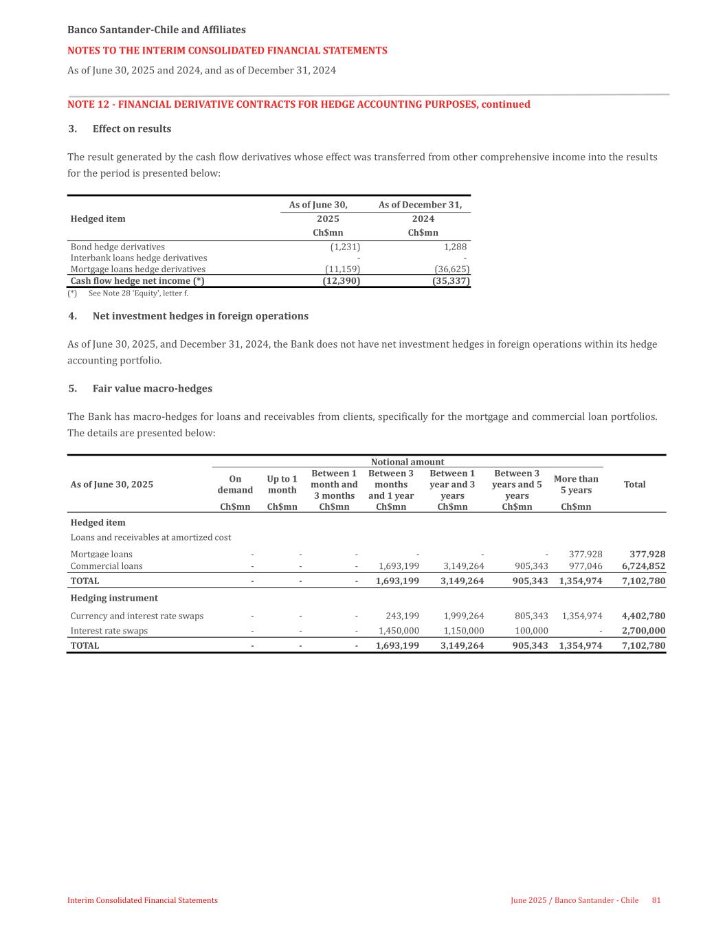 Banco Santander-Chile and Affiliates NOTES TO THE INTERIM CONSOLIDATED FINANCIAL STATEMENTS As of June 30, 2025 and 2024, and as of December 31, 2024 Interim Consolidated Financial Statements June 2025 / Banco Santander - Chile 81 NOTE 12 - FINANCIAL DERIVATIVE CONTRACTS FOR HEDGE ACCOUNTING PURPOSES, continued 3. Effect on results The result generated by the cash flow derivatives whose effect was transferred from other comprehensive income into the results for the period is presented below: As of June 30, As of December 31, Hedged item 2025 2024 Ch$mn Ch$mn Bond hedge derivatives (1,231) 1,288 Interbank loans hedge derivatives - - Mortgage loans hedge derivatives (11,159) (36,625) Cash flow hedge net income (*) (12,390) (35,337) (*) See Note 28 'Equity', letter f. 4. Net investment hedges in foreign operations As of June 30, 2025, and December 31, 2024, the Bank does not have net investment hedges in foreign operations within its hedge accounting portfolio. 5. Fair value macro-hedges The Bank has macro-hedges for loans and receivables from clients, specifically for the mortgage and commercial loan portfolios. The details are presented below: Notional amount As of June 30, 2025 On demand Up to 1 month Between 1 month and 3 months Between 3 months and 1 year Between 1 year and 3 years Between 3 years and 5 years More than 5 years Total Ch$mn Ch$mn Ch$mn Ch$mn Ch$mn Ch$mn Ch$mn Hedged item Loans and receivables at amortized cost Mortgage loans - - - - - - 377,928 377,928 Commercial loans - - - 1,693,199 3,149,264 905,343 977,046 6,724,852 TOTAL - - - 1,693,199 3,149,264 905,343 1,354,974 7,102,780 Hedging instrument Currency and interest rate swaps - - - 243,199 1,999,264 805,343 1,354,974 4,402,780 Interest rate swaps - - - 1,450,000 1,150,000 100,000 - 2,700,000 TOTAL - - - 1,693,199 3,149,264 905,343 1,354,974 7,102,780