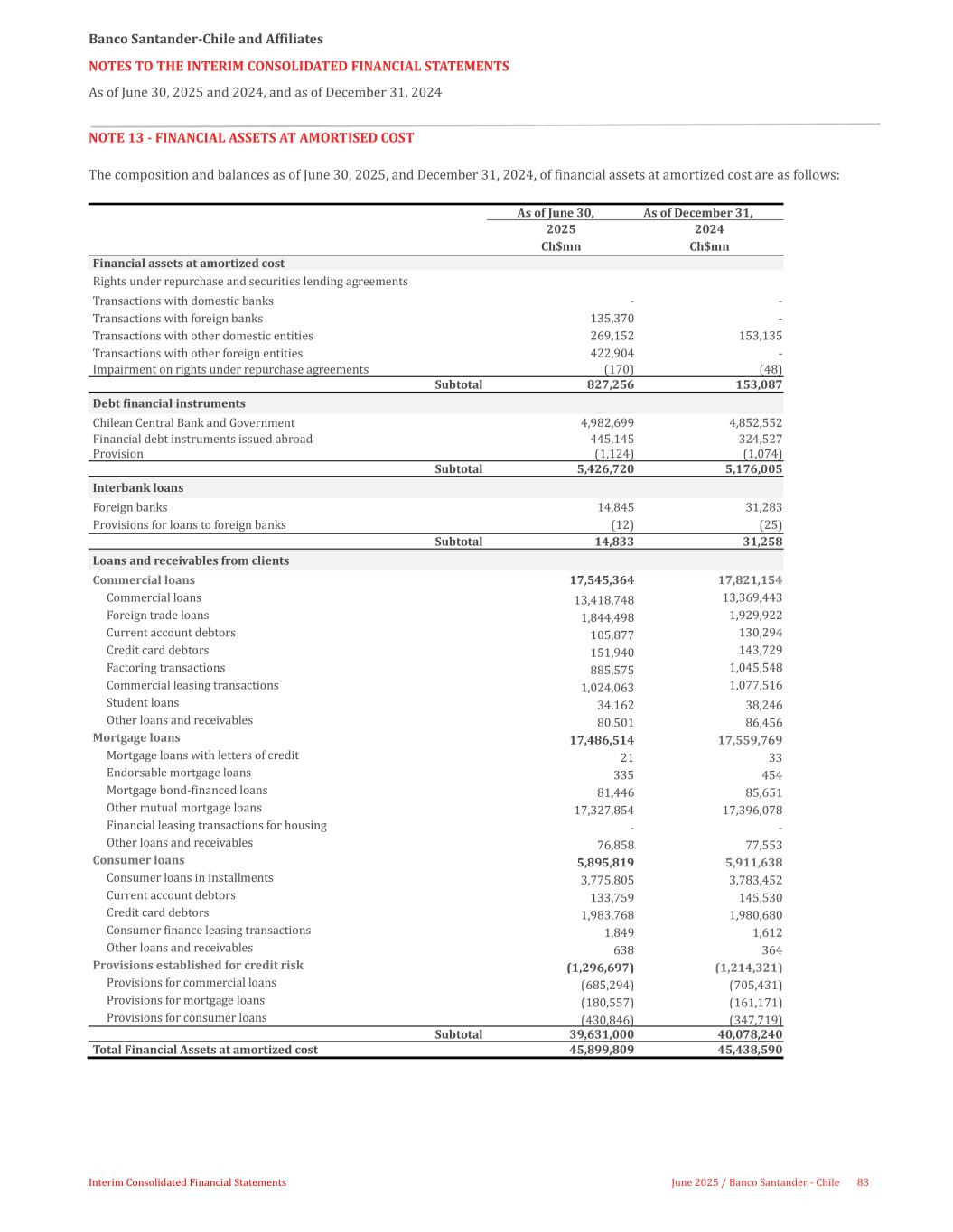 Banco Santander-Chile and Affiliates NOTES TO THE INTERIM CONSOLIDATED FINANCIAL STATEMENTS As of June 30, 2025 and 2024, and as of December 31, 2024 Interim Consolidated Financial Statements June 2025 / Banco Santander - Chile 83 NOTE 13 - FINANCIAL ASSETS AT AMORTISED COST The composition and balances as of June 30, 2025, and December 31, 2024, of financial assets at amortized cost are as follows: As of June 30, As of December 31, 2025 2024 Ch$mn Ch$mn Financial assets at amortized cost Rights under repurchase and securities lending agreements Transactions with domestic banks - - Transactions with foreign banks 135,370 - Transactions with other domestic entities 269,152 153,135 Transactions with other foreign entities 422,904 - Impairment on rights under repurchase agreements (170) (48) Subtotal 827,256 153,087 Debt financial instruments Chilean Central Bank and Government 4,982,699 4,852,552 Financial debt instruments issued abroad 445,145 324,527 Provision (1,124) (1,074) Subtotal 5,426,720 5,176,005 Interbank loans Foreign banks 14,845 31,283 Provisions for loans to foreign banks (12) (25) Subtotal 14,833 31,258 Loans and receivables from clients Commercial loans 17,545,364 17,821,154 Commercial loans 13,418,748 13,369,443 Foreign trade loans 1,844,498 1,929,922 Current account debtors 105,877 130,294 Credit card debtors 151,940 143,729 Factoring transactions 885,575 1,045,548 Commercial leasing transactions 1,024,063 1,077,516 Student loans 34,162 38,246 Other loans and receivables 80,501 86,456 Mortgage loans 17,486,514 17,559,769 Mortgage loans with letters of credit 21 33 Endorsable mortgage loans 335 454 Mortgage bond-financed loans 81,446 85,651 Other mutual mortgage loans 17,327,854 17,396,078 Financial leasing transactions for housing - - Other loans and receivables 76,858 77,553 Consumer loans 5,895,819 5,911,638 Consumer loans in installments 3,775,805 3,783,452 Current account debtors 133,759 145,530 Credit card debtors 1,983,768 1,980,680 Consumer finance leasing transactions 1,849 1,612 Other loans and receivables 638 364 Provisions established for credit risk (1,296,697) (1,214,321) Provisions for commercial loans (685,294) (705,431) Provisions for mortgage loans (180,557) (161,171) Provisions for consumer loans (430,846) (347,719) Subtotal 39,631,000 40,078,240 Total Financial Assets at amortized cost 45,899,809 45,438,590