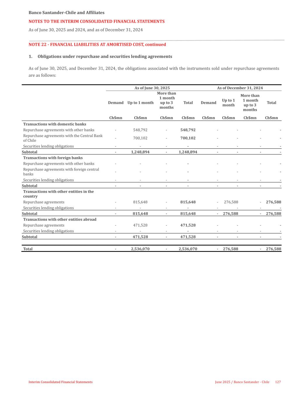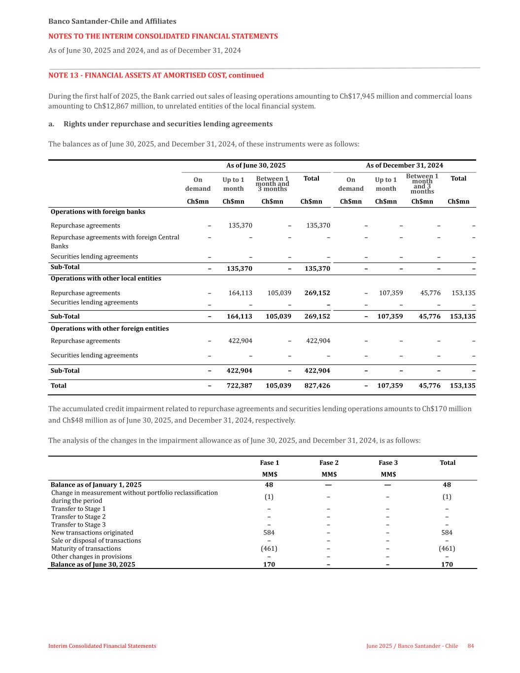 Banco Santander-Chile and Affiliates NOTES TO THE INTERIM CONSOLIDATED FINANCIAL STATEMENTS As of June 30, 2025 and 2024, and as of December 31, 2024 Interim Consolidated Financial Statements June 2025 / Banco Santander - Chile 84 NOTE 13 - FINANCIAL ASSETS AT AMORTISED COST, continued During the first half of 2025, the Bank carried out sales of leasing operations amounting to Ch$17,945 million and commercial loans amounting to Ch$12,867 million, to unrelated entities of the local financial system. a. Rights under repurchase and securities lending agreements The balances as of June 30, 2025, and December 31, 2024, of these instruments were as follows: As of June 30, 2025 As of December 31, 2024 On demand Up to 1 month Between 1 month and 3 months Total On demand Up to 1 month Between 1 month and 3 months Total Ch$mn Ch$mn Ch$mn Ch$mn Ch$mn Ch$mn Ch$mn Ch$mn Operations with foreign banks Repurchase agreements 135,370 135,370 Repurchase agreements with foreign Central Banks Securities lending agreements Sub-Total 135,370 135,370 Operations with other local entities Repurchase agreements 164,113 105,039 269,152 107,359 45,776 153,135 Securities lending agreements Sub-Total 164,113 105,039 269,152 107,359 45,776 153,135 Operations with other foreign entities Repurchase agreements 422,904 422,904 Securities lending agreements Sub-Total 422,904 422,904 Total 722,387 105,039 827,426 107,359 45,776 153,135 The accumulated credit impairment related to repurchase agreements and securities lending operations amounts to Ch$170 million and Ch$48 million as of June 30, 2025, and December 31, 2024, respectively. The analysis of the changes in the impairment allowance as of June 30, 2025, and December 31, 2024, is as follows: Fase 1 Fase 2 Fase 3 Total MM$ MM$ MM$ Balance as of January 1, 2025 48 48 Change in measurement without portfolio reclassification during the period (1) (1) Transfer to Stage 1 Transfer to Stage 2 Transfer to Stage 3 New transactions originated 584 584 Sale or disposal of transactions Maturity of transactions (461) (461) Other changes in provisions Balance as of June 30, 2025 170 170