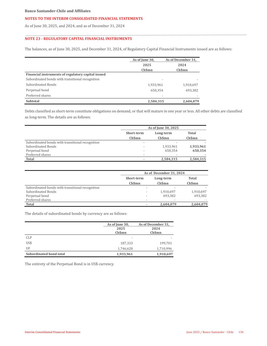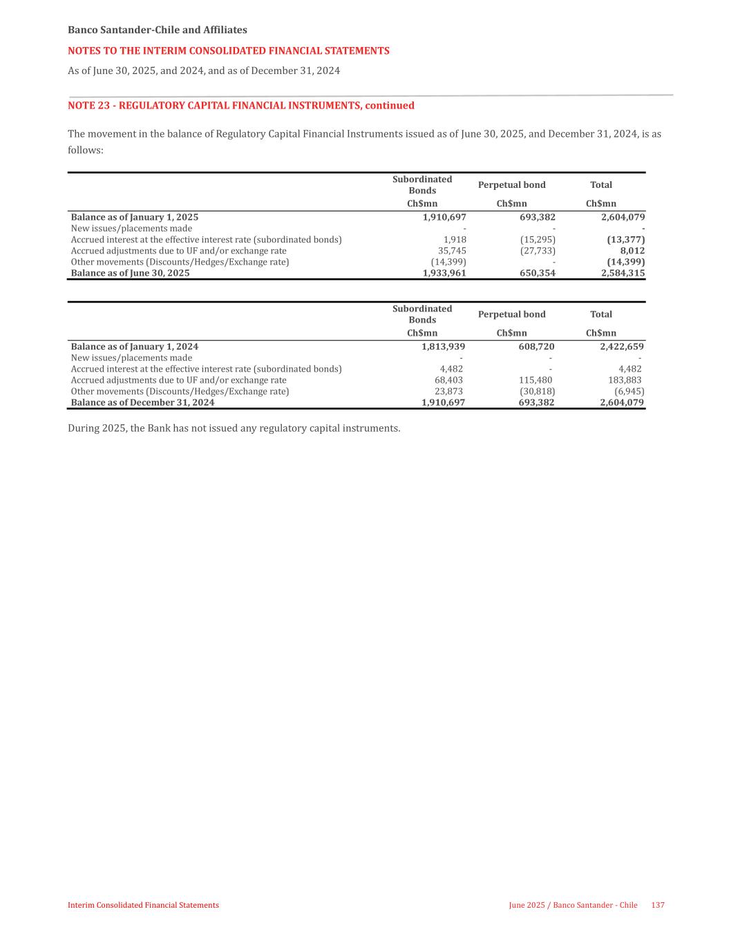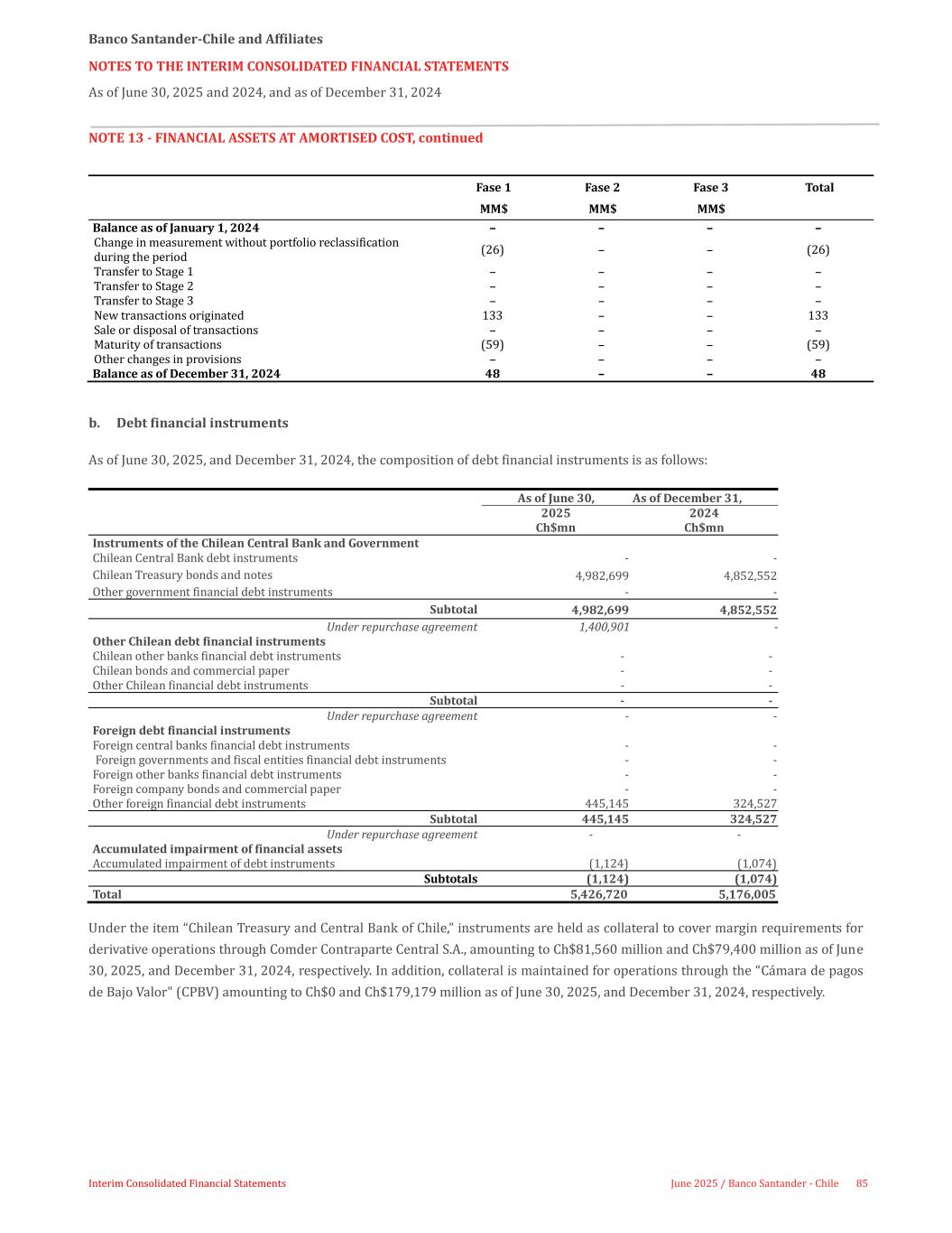 Banco Santander-Chile and Affiliates NOTES TO THE INTERIM CONSOLIDATED FINANCIAL STATEMENTS As of June 30, 2025 and 2024, and as of December 31, 2024 Interim Consolidated Financial Statements June 2025 / Banco Santander - Chile 85 NOTE 13 - FINANCIAL ASSETS AT AMORTISED COST, continued Fase 1 Fase 2 Fase 3 Total MM$ MM$ MM$ Balance as of January 1, 2024 Change in measurement without portfolio reclassification during the period (26) (26) Transfer to Stage 1 Transfer to Stage 2 Transfer to Stage 3 New transactions originated 133 133 Sale or disposal of transactions Maturity of transactions (59) (59) Other changes in provisions Balance as of December 31, 2024 48 48 b. Debt financial instruments As of June 30, 2025, and December 31, 2024, the composition of debt financial instruments is as follows: As of June 30, As of December 31, 2025 2024 Ch$mn Ch$mn Instruments of the Chilean Central Bank and Government Chilean Central Bank debt instruments - - Chilean Treasury bonds and notes 4,982,699 4,852,552 Other government financial debt instruments - - Subtotal 4,982,699 4,852,552 Under repurchase agreement 1,400,901 - Other Chilean debt financial instruments Chilean other banks financial debt instruments - - Chilean bonds and commercial paper - - Other Chilean financial debt instruments - - Subtotal - - Under repurchase agreement - - Foreign debt financial instruments Foreign central banks financial debt instruments - - Foreign governments and fiscal entities financial debt instruments - - Foreign other banks financial debt instruments - - Foreign company bonds and commercial paper - - Other foreign financial debt instruments 445,145 324,527 Subtotal 445,145 324,527 Under repurchase agreement - - Accumulated impairment of financial assets Accumulated impairment of debt instruments (1,124) (1,074) Subtotals (1,124) (1,074) Total 5,426,720 5,176,005 Chilean Treasury derivative operations through Comder Contraparte Central S.A., amounting to Ch$81,560 million and Ch$79,400 million as of June 30, 2025, and December 31, 2024, Cámara de pagos de Bajo Valor" (CPBV) amounting to Ch$0 and Ch$179,179 million as of June 30, 2025, and December 31, 2024, respectively.
