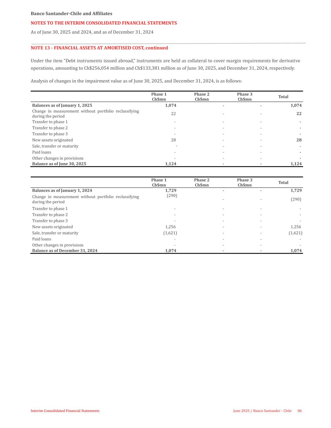 Banco Santander-Chile and Affiliates NOTES TO THE INTERIM CONSOLIDATED FINANCIAL STATEMENTS As of June 30, 2025 and 2024, and as of December 31, 2024 Interim Consolidated Financial Statements June 2025 / Banco Santander - Chile 86 NOTE 13 - FINANCIAL ASSETS AT AMORTISED COST, continued ve operations, amounting to Ch$256,054 million and Ch$133,381 million as of June 30, 2025, and December 31, 2024, respectively. Analysis of changes in the impairment value as of June 30, 2025, and December 31, 2024, is as follows: Phase 1 Phase 2 Phase 3 Total Ch$mn Ch$mn Ch$mn Balances as of January 1, 2025 1,074 - - 1,074 Change in measurement without portfolio reclassifying during the period 22 - - 22 Transfer to phase 1 - - - - Transfer to phase 2 - - - - Transfer to phase 3 - - - - New assets originated 28 - - 28 Sale, transfer or maturity - - - - Paid loans - - - - Other changes in provisions - - - - Balance as of June 30, 2025 1,124 - - 1,124 Phase 1 Phase 2 Phase 3 Total Ch$mn Ch$mn Ch$mn Balances as of January 1, 2024 1,729 - - 1,729 Change in measurement without portfolio reclassifying during the period (290) - - (290) Transfer to phase 1 - - - - Transfer to phase 2 - - - - Transfer to phase 3 - - - - New assets originated 1,256 - - 1,256 Sale, transfer or maturity (1,621) - - (1,621) Paid loans - - - - Other changes in provisions - - - - Balance as of December 31, 2024 1,074 - - 1,074