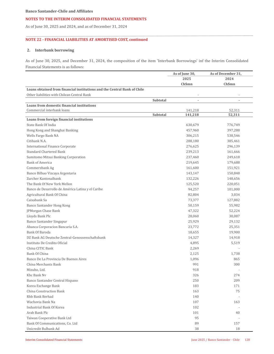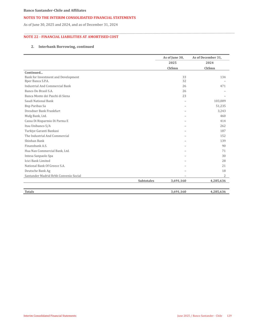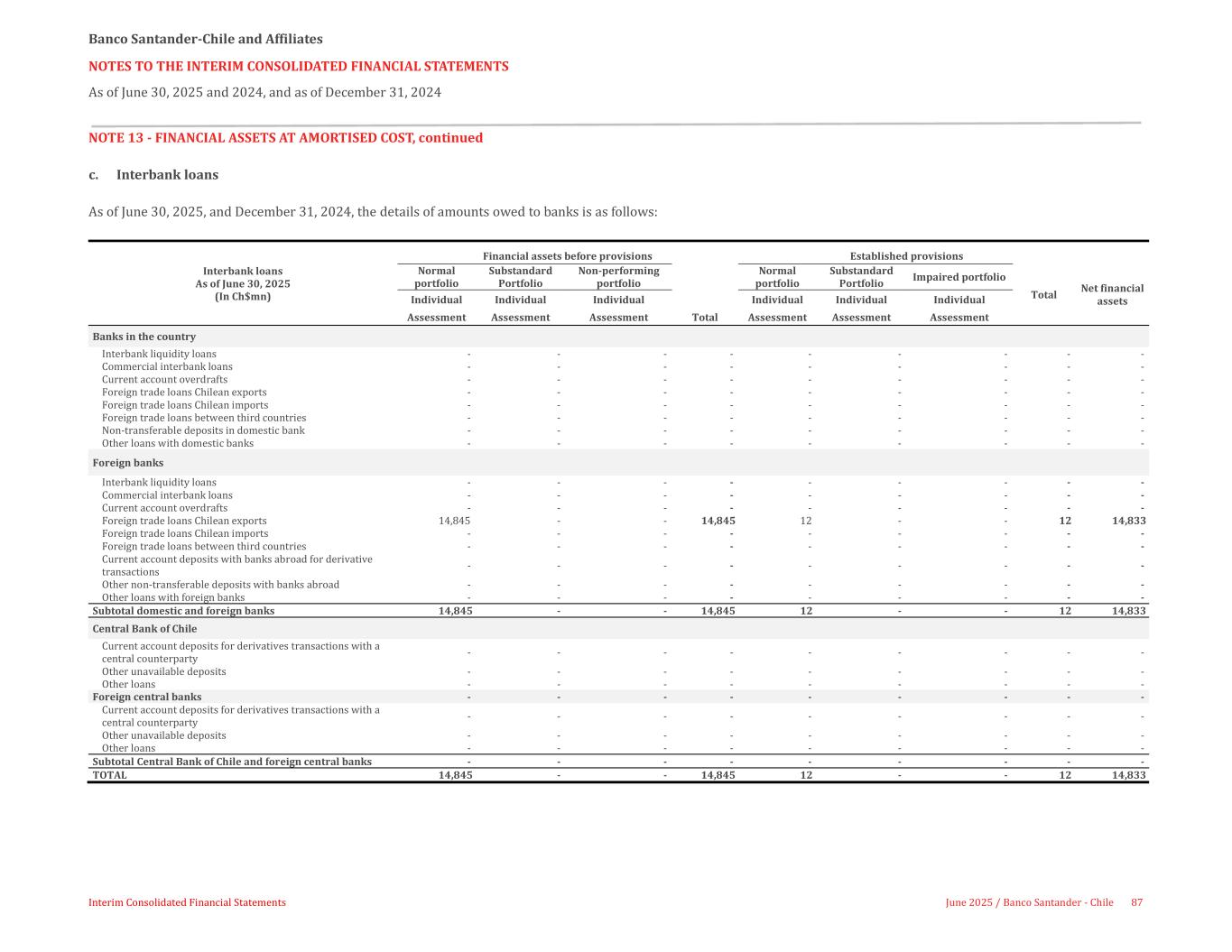 Banco Santander-Chile and Affiliates NOTES TO THE INTERIM CONSOLIDATED FINANCIAL STATEMENTS As of June 30, 2025 and 2024, and as of December 31, 2024 Interim Consolidated Financial Statements June 2025 / Banco Santander - Chile 87 NOTE 13 - FINANCIAL ASSETS AT AMORTISED COST, continued c. Interbank loans As of June 30, 2025, and December 31, 2024, the details of amounts owed to banks is as follows: Interbank loans As of June 30, 2025 (In Ch$mn) Financial assets before provisions Established provisions Normal portfolio Substandard Portfolio Non-performing portfolio Total Normal portfolio Substandard Portfolio Impaired portfolio Total Net financial assets Individual Individual Individual Individual Individual Individual Assessment Assessment Assessment Assessment Assessment Assessment Banks in the country Interbank liquidity loans - - - - - - - - - Commercial interbank loans - - - - - - - - - Current account overdrafts - - - - - - - - - Foreign trade loans Chilean exports - - - - - - - - - Foreign trade loans Chilean imports - - - - - - - - - Foreign trade loans between third countries - - - - - - - - - Non-transferable deposits in domestic bank - - - - - - - - - Other loans with domestic banks - - - - - - - - - Foreign banks Interbank liquidity loans - - - - - - - - - Commercial interbank loans - - - - - - - - - Current account overdrafts - - - - - - - - - Foreign trade loans Chilean exports 14,845 - - 14,845 12 - - 12 14,833 Foreign trade loans Chilean imports - - - - - - - - - Foreign trade loans between third countries - - - - - - - - - Current account deposits with banks abroad for derivative transactions - - - - - - - - - Other non-transferable deposits with banks abroad - - - - - - - - - Other loans with foreign banks - - - - - - - - - Subtotal domestic and foreign banks 14,845 - - 14,845 12 - - 12 14,833 Central Bank of Chile Current account deposits for derivatives transactions with a central counterparty - - - - - - - - - Other unavailable deposits - - - - - - - - - Other loans - - - - - - - - - Foreign central banks - - - - - - - - - Current account deposits for derivatives transactions with a central counterparty - - - - - - - - - Other unavailable deposits - - - - - - - - - Other loans - - - - - - - - - Subtotal Central Bank of Chile and foreign central banks - - - - - - - - - TOTAL 14,845 - - 14,845 12 - - 12 14,833