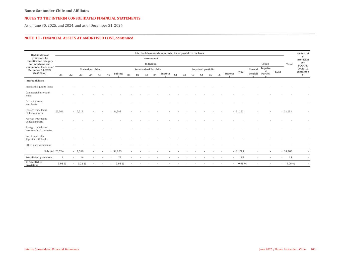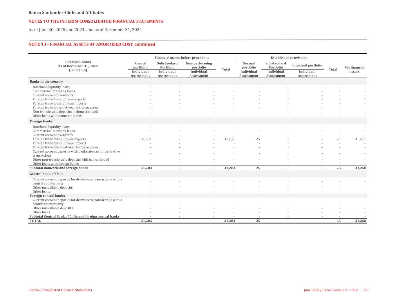 Banco Santander-Chile and Affiliates NOTES TO THE INTERIM CONSOLIDATED FINANCIAL STATEMENTS As of June 30, 2025 and 2024, and as of December 31, 2024 Interim Consolidated Financial Statements June 2025 / Banco Santander - Chile 88 NOTE 13 - FINANCIAL ASSETS AT AMORTISED COST, continued Interbank loans As of December 31, 2024 (In Ch$mn) Financial assets before provisions Established provisions Normal portfolio Substandard Portfolio Non-performing portfolio Total Normal portfolio Substandard Portfolio Impaired portfolio Total Net financial assets Individual Individual Individual Individual Individual Individual Assessment Assessment Assessment Assessment Assessment Assessment Banks in the country Interbank liquidity loans - - - - - - - - - Commercial interbank loans - - - - - - - - - Current account overdrafts - - - - - - - - - Foreign trade loans Chilean exports - - - - - - - - - Foreign trade loans Chilean imports - - - - - - - - - Foreign trade loans between third countries - - - - - - - - - Non-transferable deposits in domestic bank - - - - - - - - - Other loans with domestic banks - - - - - - - - - Foreign banks Interbank liquidity loans - - - - - - - - - Commercial interbank loans - - - - - - - - - Current account overdrafts - - - - - - - - - Foreign trade loans Chilean exports 31,283 - - 31,283 25 - - 25 31,258 Foreign trade loans Chilean imports - - - - - - - - - Foreign trade loans between third countries - - - - - - - - - Current account deposits with banks abroad for derivative transactions - - - - - - - - - Other non-transferable deposits with banks abroad - - - - - - - - - Other loans with foreign banks - - - - - - - - - Subtotal domestic and foreign banks 31,283 - - 31,283 25 - - 25 31,258 Central Bank of Chile Current account deposits for derivatives transactions with a central counterparty - - - - - - - - - Other unavailable deposits - - - - - - - - - Other loans - - - - - - - - - Foreign central banks - - - - - - - - - Current account deposits for derivatives transactions with a central counterparty - - - - - - - - - Other unavailable deposits - - - - - - - - - Other loans - - - - - - - - - Subtotal Central Bank of Chile and foreign central banks - - - - - - - - - TOTAL 31,283 - - 31,283 25 - - 25 31,258