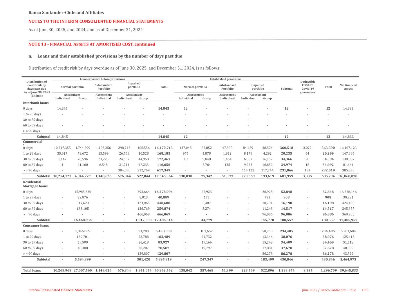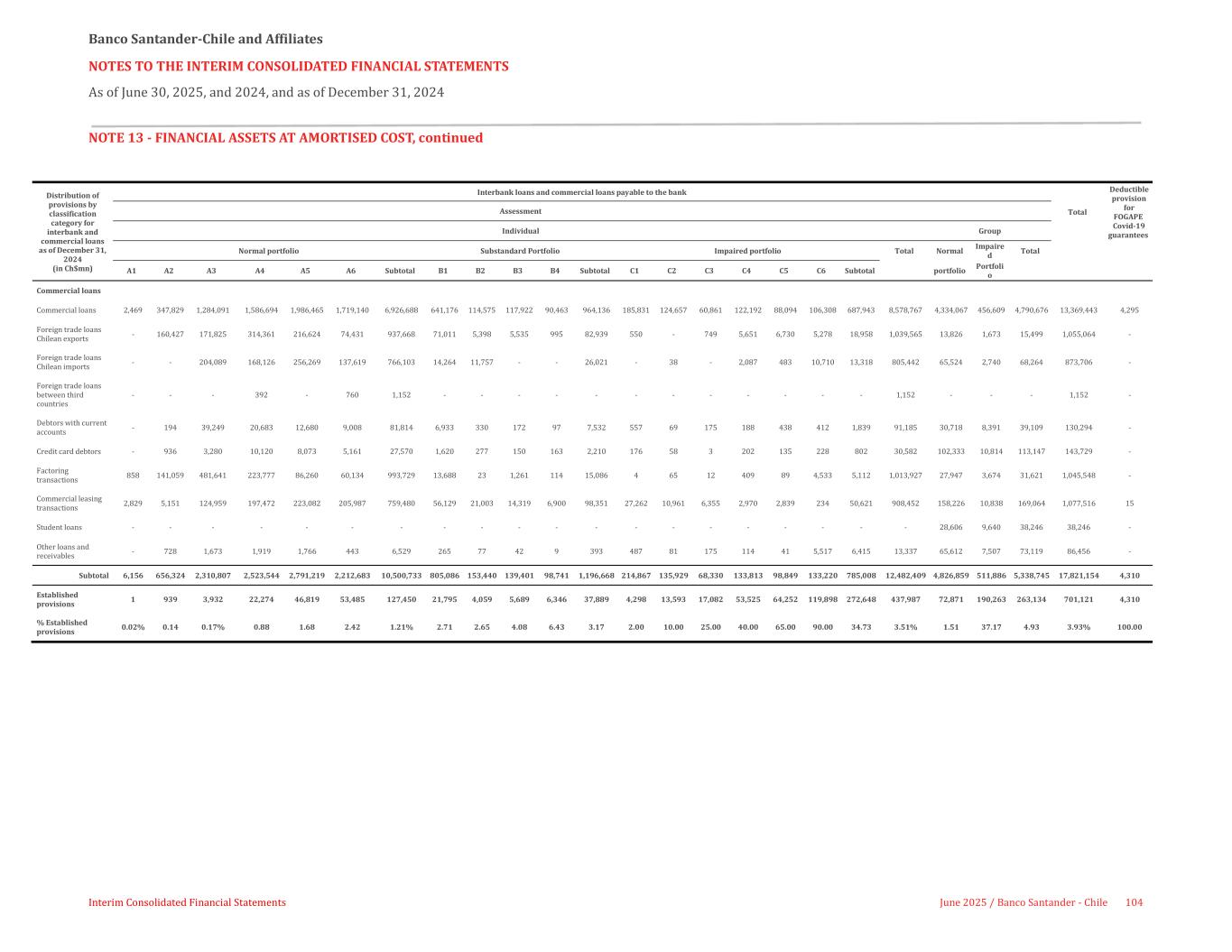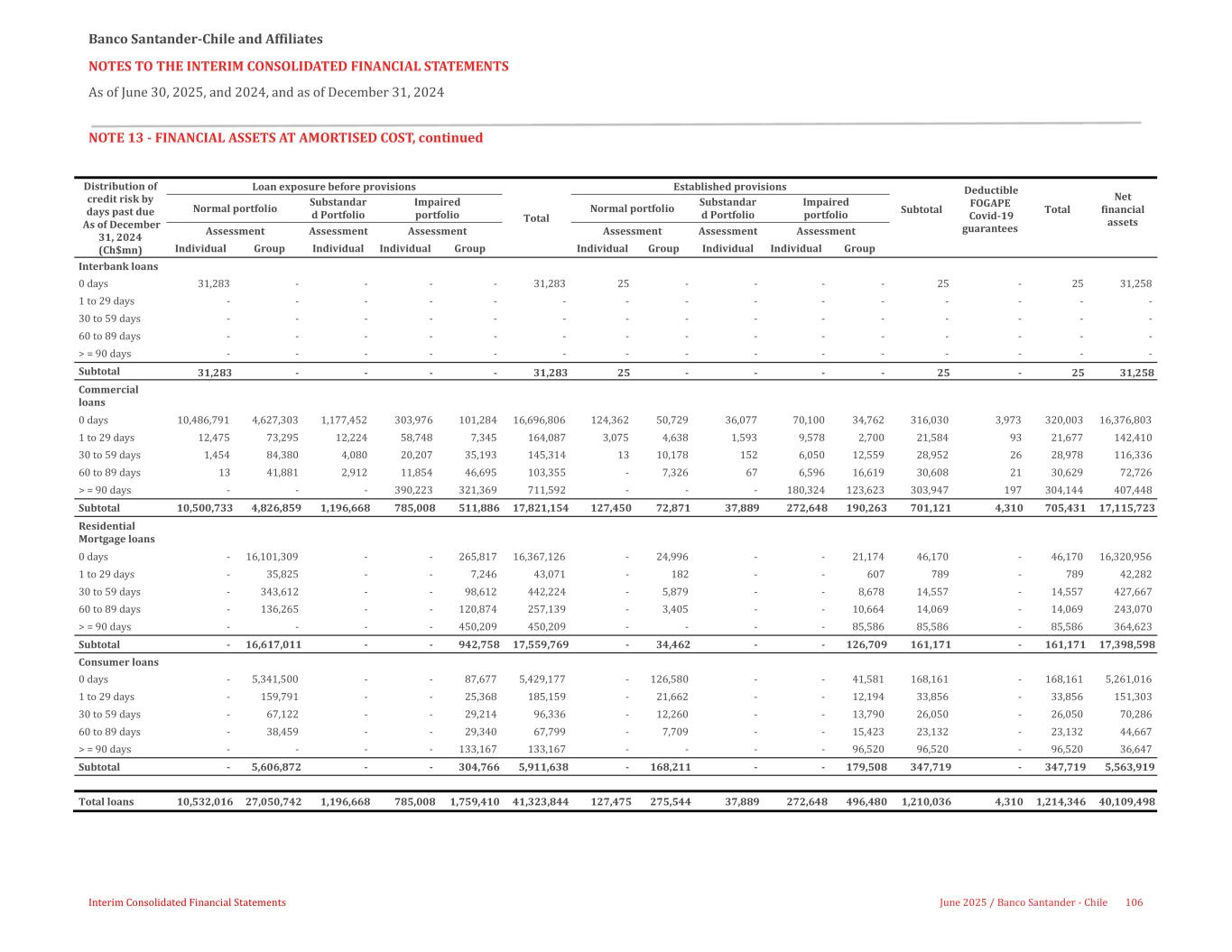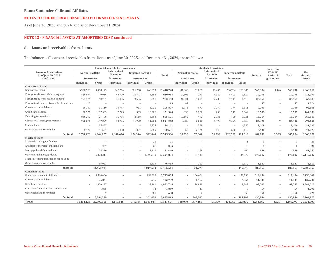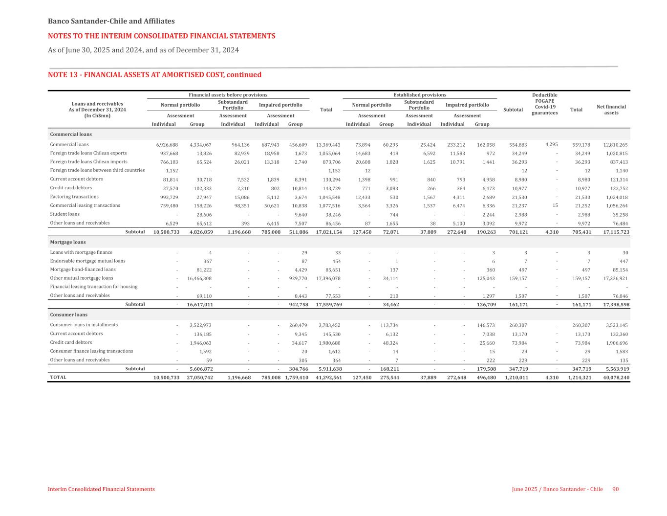 Banco Santander-Chile and Affiliates NOTES TO THE INTERIM CONSOLIDATED FINANCIAL STATEMENTS As of June 30, 2025 and 2024, and as of December 31, 2024 Interim Consolidated Financial Statements June 2025 / Banco Santander - Chile 90 NOTE 13 - FINANCIAL ASSETS AT AMORTISED COST, continued Loans and receivables As of December 31, 2024 (In Ch$mn) Financial assets before provisions Total Established provisions Subtotal Deductible FOGAPE Covid-19 guarantees Total Net financial assets Normal portfolio Substandard Portfolio Impaired portfolio Normal portfolio Substandard Portfolio Impaired portfolio Assessment Assessment Assessment Assessment Assessment Assessment Individual Group Individual Individual Group Individual Group Individual Individual Group Commercial loans Commercial loans 6,926,688 4,334,067 964,136 687,943 456,609 13,369,443 73,894 60,295 25,424 233,212 162,058 554,883 4,295 559,178 12,810,265 Foreign trade loans Chilean exports 937,668 13,826 82,939 18,958 1,673 1,055,064 14,683 419 6,592 11,583 972 34,249 - 34,249 1,020,815 Foreign trade loans Chilean imports 766,103 65,524 26,021 13,318 2,740 873,706 20,608 1,828 1,625 10,791 1,441 36,293 - 36,293 837,413 Foreign trade loans between third countries 1,152 - - - - 1,152 12 - - - - 12 - 12 1,140 Current account debtors 81,814 30,718 7,532 1,839 8,391 130,294 1,398 991 840 793 4,958 8,980 - 8,980 121,314 Credit card debtors 27,570 102,333 2,210 802 10,814 143,729 771 3,083 266 384 6,473 10,977 - 10,977 132,752 Factoring transactions 993,729 27,947 15,086 5,112 3,674 1,045,548 12,433 530 1,567 4,311 2,689 21,530 - 21,530 1,024,018 Commercial leasing transactions 759,480 158,226 98,351 50,621 10,838 1,077,516 3,564 3,326 1,537 6,474 6,336 21,237 15 21,252 1,056,264 Student loans - 28,606 - - 9,640 38,246 - 744 - - 2,244 2,988 - 2,988 35,258 Other loans and receivables 6,529 65,612 393 6,415 7,507 86,456 87 1,655 38 5,100 3,092 9,972 - 9,972 76,484 Subtotal 10,500,733 4,826,859 1,196,668 785,008 511,886 17,821,154 127,450 72,871 37,889 272,648 190,263 701,121 4,310 705,431 17,115,723 Mortgage loans Loans with mortgage finance - 4 - - 29 33 - - - - 3 3 - 3 30 Endorsable mortgage mutual loans - 367 - - 87 454 - 1 - - 6 7 - 7 447 Mortgage bond-financed loans - 81,222 - - 4,429 85,651 - 137 - - 360 497 - 497 85,154 Other mutual mortgage loans - 16,466,308 - - 929,770 17,396,078 - 34,114 - - 125,043 159,157 - 159,157 17,236,921 Financial leasing transaction for housing - - - - - - - - - - - - - - - Other loans and receivables - 69,110 - - 8,443 77,553 - 210 - - 1,297 1,507 - 1,507 76,046 Subtotal - 16,617,011 - - 942,758 17,559,769 - 34,462 - - 126,709 161,171 - 161,171 17,398,598 Consumer loans Consumer loans in installments - 3,522,973 - - 260,479 3,783,452 - 113,734 - - 146,573 260,307 - 260,307 3,523,145 Current account debtors - 136,185 - - 9,345 145,530 - 6,132 - - 7,038 13,170 - 13,170 132,360 Credit card debtors - 1,946,063 - - 34,617 1,980,680 - 48,324 - - 25,660 73,984 - 73,984 1,906,696 Consumer finance leasing transactions - 1,592 - - 20 1,612 - 14 - - 15 29 - 29 1,583 Other loans and receivables - 59 - - 305 364 - 7 - - 222 229 - 229 135 Subtotal - 5,606,872 - - 304,766 5,911,638 - 168,211 - - 179,508 347,719 - 347,719 5,563,919 TOTAL 10,500,733 27,050,742 1,196,668 785,008 1,759,410 41,292,561 127,450 275,544 37,889 272,648 496,480 1,210,011 4,310 1,214,321 40,078,240