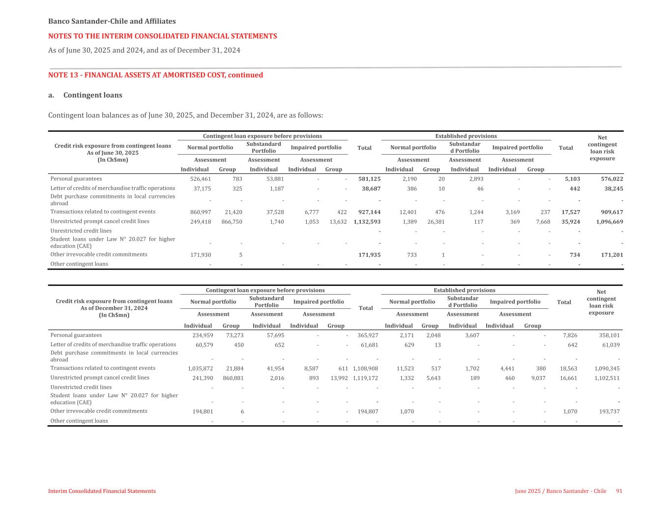 Banco Santander-Chile and Affiliates NOTES TO THE INTERIM CONSOLIDATED FINANCIAL STATEMENTS As of June 30, 2025 and 2024, and as of December 31, 2024 Interim Consolidated Financial Statements June 2025 / Banco Santander - Chile 91 NOTE 13 - FINANCIAL ASSETS AT AMORTISED COST, continued a. Contingent loans Contingent loan balances as of June 30, 2025, and December 31, 2024, are as follows: Credit risk exposure from contingent loans As of June 30, 2025 (In Ch$mn) Contingent loan exposure before provisions Total Established provisions Total Net contingent loan risk exposure Normal portfolio Substandard Portfolio Impaired portfolio Normal portfolio Substandar d Portfolio Impaired portfolio Assessment Assessment Assessment Assessment Assessment Assessment Individual Group Individual Individual Group Individual Group Individual Individual Group Personal guarantees 526,461 783 53,881 - - 581,125 2,190 20 2,893 - - 5,103 576,022 Letter of credits of merchandise traffic operations 37,175 325 1,187 - - 38,687 386 10 46 - - 442 38,245 Debt purchase commitments in local currencies abroad - - - - - - - - - - - - - Transactions related to contingent events 860,997 21,420 37,528 6,777 422 927,144 12,401 476 1,244 3,169 237 17,527 909,617 Unrestricted prompt cancel credit lines 249,418 866,750 1,740 1,053 13,632 1,132,593 1,389 26,381 117 369 7,668 35,924 1,096,669 Unrestricted credit lines - - - - - - - - Student loans under Law N° 20.027 for higher education (CAE) - - - - - - - - - - - - - Other irrevocable credit commitments 171,930 5 171,935 733 1 - - - 734 171,201 Other contingent loans - - - - - - - - - - - - - Credit risk exposure from contingent loans As of December 31, 2024 (In Ch$mn) Contingent loan exposure before provisions Total Established provisions Total Net contingent loan risk exposure Normal portfolio Substandard Portfolio Impaired portfolio Normal portfolio Substandar d Portfolio Impaired portfolio Assessment Assessment Assessment Assessment Assessment Assessment Individual Group Individual Individual Group Individual Group Individual Individual Group Personal guarantees 234,959 73,273 57,695 - - 365,927 2,171 2,048 3,607 - - 7,826 358,101 Letter of credits of merchandise traffic operations 60,579 450 652 - - 61,681 629 13 - - - 642 61,039 Debt purchase commitments in local currencies abroad - - - - - - - - - - - - - Transactions related to contingent events 1,035,872 21,884 41,954 8,587 611 1,108,908 11,523 517 1,702 4,441 380 18,563 1,090,345 Unrestricted prompt cancel credit lines 241,390 860,881 2,016 893 13,992 1,119,172 1,332 5,643 189 460 9,037 16,661 1,102,511 Unrestricted credit lines - - - - - - - - - - - - - Student loans under Law N° 20.027 for higher education (CAE) - - - - - - - - - - - - - Other irrevocable credit commitments 194,801 6 - - - 194,807 1,070 - - - - 1,070 193,737 Other contingent loans - - - - - - - - - - - - -