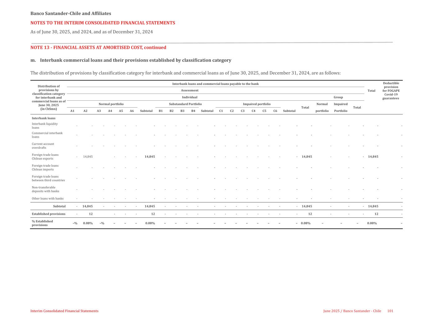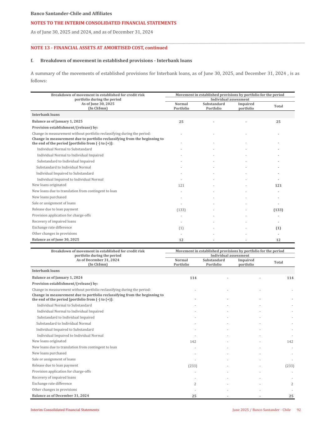 Banco Santander-Chile and Affiliates NOTES TO THE INTERIM CONSOLIDATED FINANCIAL STATEMENTS As of June 30, 2025 and 2024, and as of December 31, 2024 Interim Consolidated Financial Statements June 2025 / Banco Santander - Chile 92 NOTE 13 - FINANCIAL ASSETS AT AMORTISED COST, continued f. Breakdown of movement in established provisions - Interbank loans A summary of the movements of established provisions for Interbank loans, as of June 30, 2025, and December 31, 2024 , is as follows: Breakdown of movement in established for credit risk portfolio during the period As of June 30, 2025 (In Ch$mn) Movement in established provisions by portfolio for the period Individual assessment Normal Substandard Impaired Total Portfolio Portfolio portfolio Interbank loans Balance as of January 1, 2025 25 - - 25 Provision establishment/(release) by: Change in measurement without portfolio reclassifying during the period: - - - - Change in measurement due to portfolio reclassifying from the beginning to the end of the period [portfolio from (-) to (+)]: - - - - Individual Normal to Substandard - - - - Individual Normal to Individual Impaired - - - - Substandard to Individual Impaired - - - - Substandard to Individual Normal - - - - Individual Impaired to Substandard - - - - Individual Impaired to Individual Normal - - - - New loans originated 121 - - 121 New loans due to translation from contingent to loan - - - - New loans purchased - - - - Sale or assignment of loans - - - - Release due to loan payment (133) - - (133) Provision application for charge-offs - - - - Recovery of impaired loans - - - - Exchange rate difference (1) - - (1) Other changes in provisions - - - - Balance as of June 30, 2025 12 - - 12 Breakdown of movement in established for credit risk portfolio during the period As of December 31, 2024 (In Ch$mn) Movement in established provisions by portfolio for the period Individual assessment Normal Substandard Impaired Total Portfolio Portfolio portfolio Interbank loans Balance as of January 1, 2024 114 - - 114 Provision establishment/(release) by: Change in measurement without portfolio reclassifying during the period: - - - - Change in measurement due to portfolio reclassifying from the beginning to the end of the period [portfolio from (-) to (+)]: - - - - Individual Normal to Substandard - - - - Individual Normal to Individual Impaired - - - - Substandard to Individual Impaired - - - - Substandard to Individual Normal - - - - Individual Impaired to Substandard - - - - Individual Impaired to Individual Normal - - - - New loans originated 142 - - 142 New loans due to translation from contingent to loan - - - - New loans purchased - - - - Sale or assignment of loans - - - - Release due to loan payment (233) - - (233) Provision application for charge-offs - - - - Recovery of impaired loans - - - - Exchange rate difference 2 - - 2 Other changes in provisions - - - - Balance as of December 31, 2024 25 - - 25