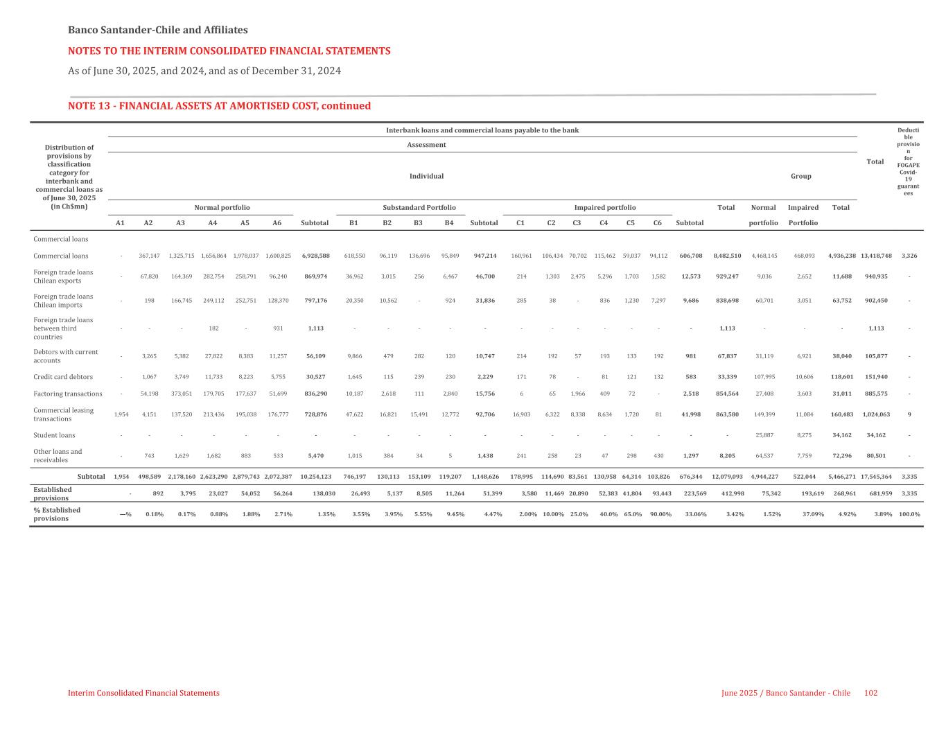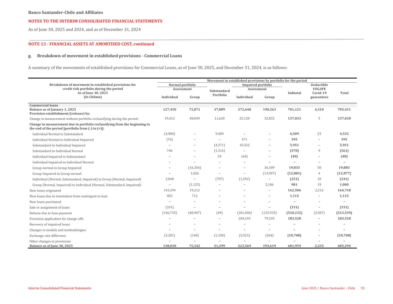 Banco Santander-Chile and Affiliates NOTES TO THE INTERIM CONSOLIDATED FINANCIAL STATEMENTS As of June 30, 2025 and 2024, and as of December 31, 2024 Interim Consolidated Financial Statements June 2025 / Banco Santander - Chile 93 NOTE 13 - FINANCIAL ASSETS AT AMORTISED COST, continued g. Breakdown of movement in established provisions - Commercial Loans A summary of the movements of established provisions for Commercial Loans, as of June 30, 2025, and December 31, 2024, is as follows: Breakdown of movement in established provisions for credit risk portfolio during the period As of June 30, 2025 (In Ch$mn) Movement in established provisions by portfolio for the period Normal portfolio Substandard Portfolio Impaired portfolio Subtotal Deductible FOGAPE Covid-19 guarantees Total Assessment Assessment Individual Group Individual Group Commercial loans Balance as of January 1, 2025 127,450 72,871 37,889 272,648 190,263 701,121 4,310 705,431 Provision establishment/(release) by: Change in measurement without portfolio reclassifying during the period: 19,412 48,049 11,620 25,120 32,832 137,033 5 137,038 Change in measurement due to portfolio reclassifying from the beginning to the end of the period [portfolio from (-) to (+)]: Individual Normal to Substandard (4,900) 9,409 4,509 23 4,532 Individual Normal to Individual Impaired (76) 471 395 395 Substandard to Individual Impaired (4,371) 10,322 5,951 5,951 Substandard to Individual Normal 746 (1,316) (570) 9 (561) Individual Impaired to Substandard 24 (64) (40) (40) Individual Impaired to Individual Normal Group normal to Group Impaired (16,356) 36,189 19,833 50 19,883 Group Impaired to Group normal 1,026 (13,907) (12,881) 4 (12,877) Individual (Normal, Substandard, Impaired) to Group (Normal, Impaired) 2,048 (707) (1,592) (251) 10 (241) Group (Normal, Impaired) to Individual (Normal, Substandard, Impaired) (1,125) 2,106 981 19 1,000 New loans originated 143,294 19,212 162,506 2,212 164,718 New loans due to translation from contingent to loan 403 712 1,115 1,115 New loans purchased Sale or assignment of loans (331) (331) (331) Release due to loan payment (146,735) (48,907) (49) (181,606) (132,935) (510,232) (3,307) (513,539) Provision application for charge-offs 104,193 79,335 183,528 183,528 Recovery of impaired loans Changes in models and methodologies Exchange rate difference (3,281) (140) (1,100) (5,923) (264) (10,708) (10,708) Other changes in provisions Balance as of June 30, 2025 138,030 75,342 51,399 223,569 193,619 681,959 3,335 685,294