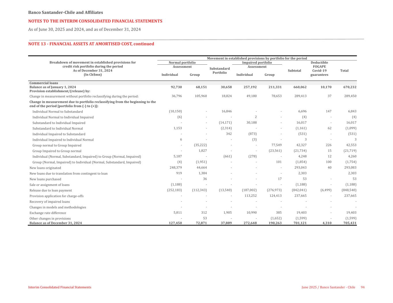 Banco Santander-Chile and Affiliates NOTES TO THE INTERIM CONSOLIDATED FINANCIAL STATEMENTS As of June 30, 2025 and 2024, and as of December 31, 2024 Interim Consolidated Financial Statements June 2025 / Banco Santander - Chile 94 NOTE 13 - FINANCIAL ASSETS AT AMORTISED COST, continued Breakdown of movement in established provisions for credit risk portfolio during the period As of December 31, 2024 (In Ch$mn) Movement in established provisions by portfolio for the period Normal portfolio Substandard Portfolio Impaired portfolio Subtotal Deductible FOGAPE Covid-19 guarantees Total Assessment Assessment Individual Group Individual Group Commercial loans Balance as of January 1, 2024 92,730 68,151 30,658 257,192 211,331 660,062 10,170 670,232 Provision establishment/(release) by: Change in measurement without portfolio reclassifying during the period: 36,796 105,960 18,824 49,180 78,653 289,413 37 289,450 Change in measurement due to portfolio reclassifying from the beginning to the end of the period [portfolio from (-) to (+)]: Individual Normal to Substandard (10,150) - 16,846 - - 6,696 147 6,843 Individual Normal to Individual Impaired (6) - - 2 - (4) - (4) Substandard to Individual Impaired - - (14,171) 30,188 - 16,017 - 16,017 Substandard to Individual Normal 1,153 - (2,314) - - (1,161) 62 (1,099) Individual Impaired to Substandard - - 342 (873) - (531) - (531) Individual Impaired to Individual Normal 6 - - (3) - 3 - 3 Group normal to Group Impaired - (35,222) - - 77,549 42,327 226 42,553 Group Impaired to Group normal - 1,827 - - (23,561) (21,734) 15 (21,719) Individual (Normal, Substandard, Impaired) to Group (Normal, Impaired) 5,187 - (661) (278) - 4,248 12 4,260 Group (Normal, Impaired) to Individual (Normal, Substandard, Impaired) (4) (1,951) - - 101 (1,854) 100 (1,754) New loans originated 248,379 44,664 - - - 293,043 40 293,083 New loans due to translation from contingent to loan 919 1,384 - - - 2,303 2,303 New loans purchased - 36 - - 17 53 - 53 Sale or assignment of loans (1,188) - - - - (1,188) - (1,188) Release due to loan payment (252,183) (112,343) (13,540) (187,002) (276,973) (842,041) (6,499) (848,540) Provision application for charge-offs - - - 113,252 124,413 237,665 - 237,665 Recovery of impaired loans - - - - - - - - Changes in models and methodologies - - - - - - - - Exchange rate difference 5,811 312 1,905 10,990 385 19,403 - 19,403 Other changes in provisions - 53 - - (1,652) (1,599) - (1,599) Balance as of December 31, 2024 127,450 72,871 37,889 272,648 190,263 701,121 4,310 705,431