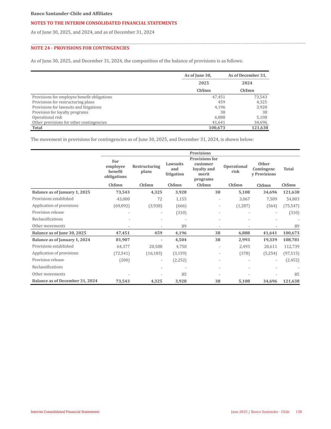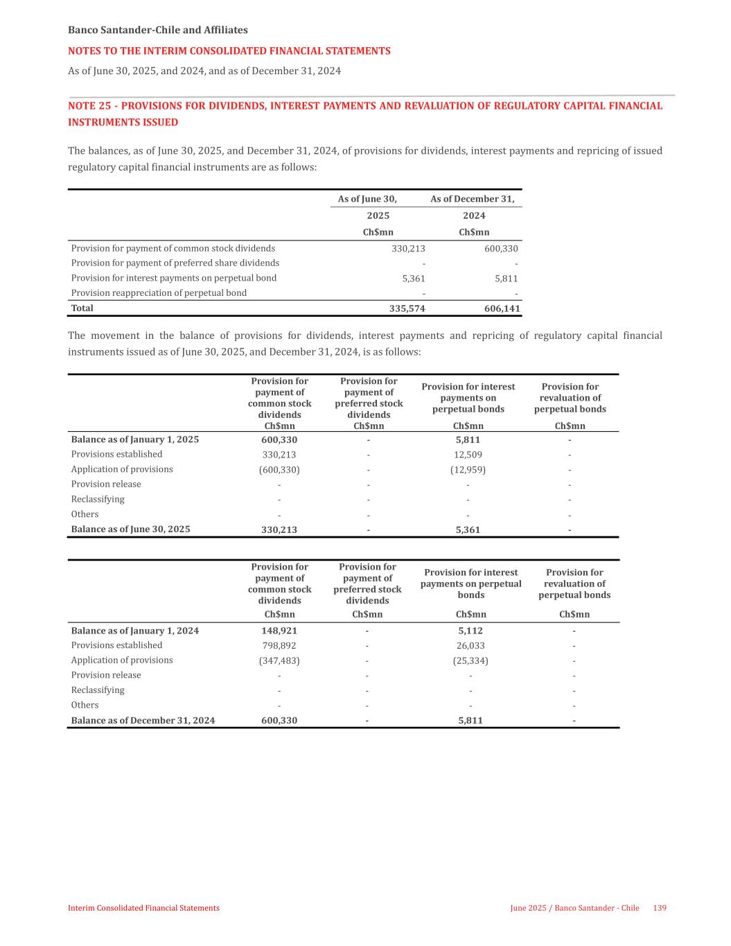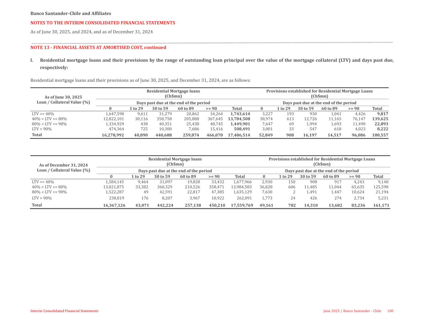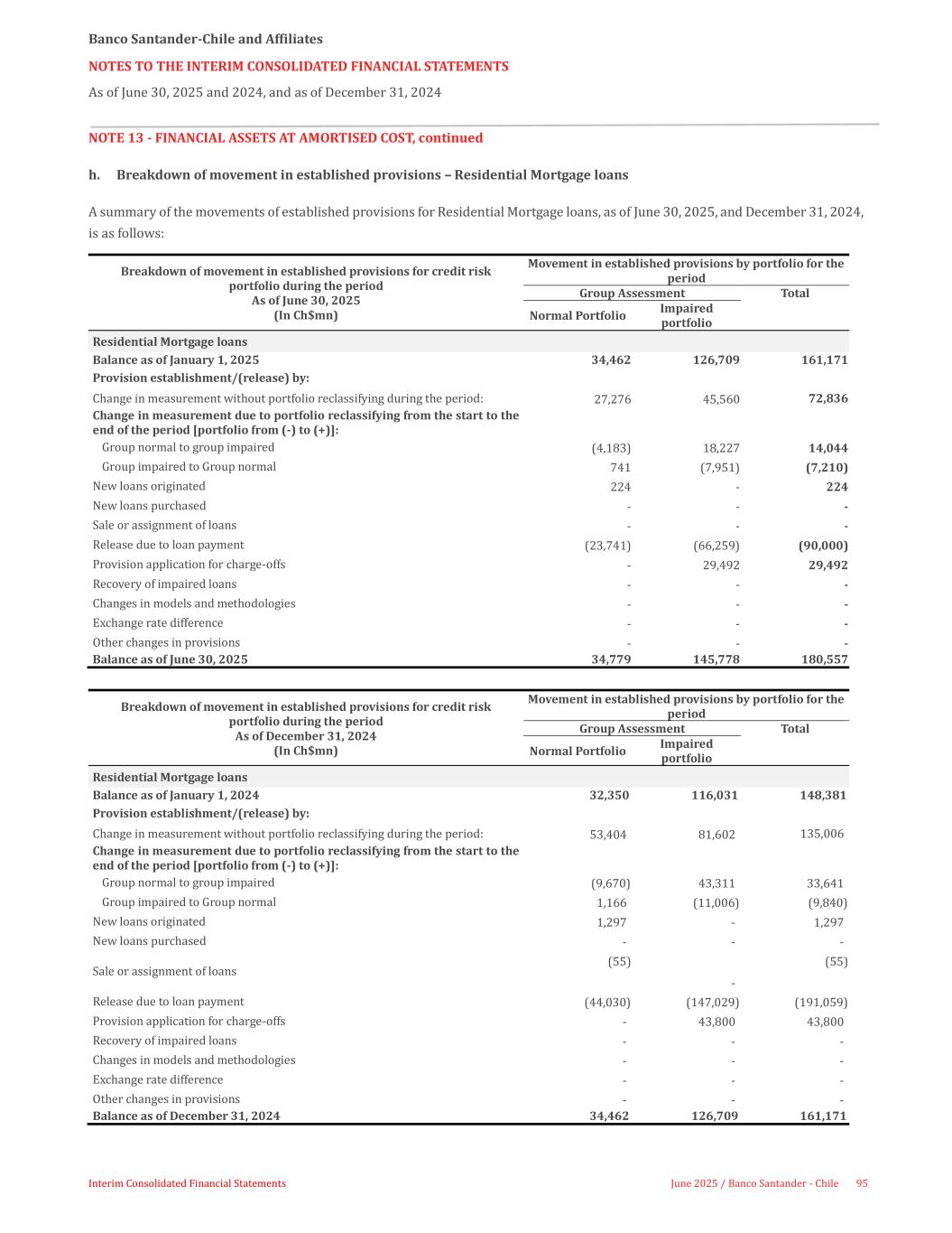 Banco Santander-Chile and Affiliates NOTES TO THE INTERIM CONSOLIDATED FINANCIAL STATEMENTS As of June 30, 2025 and 2024, and as of December 31, 2024 Interim Consolidated Financial Statements June 2025 / Banco Santander - Chile 95 NOTE 13 - FINANCIAL ASSETS AT AMORTISED COST, continued h. Breakdown of movement in established provisions Residential Mortgage loans A summary of the movements of established provisions for Residential Mortgage loans, as of June 30, 2025, and December 31, 2024, is as follows: Breakdown of movement in established provisions for credit risk portfolio during the period As of June 30, 2025 (In Ch$mn) Movement in established provisions by portfolio for the period Group Assessment Total Normal Portfolio Impaired portfolio Residential Mortgage loans Balance as of January 1, 2025 34,462 126,709 161,171 Provision establishment/(release) by: Change in measurement without portfolio reclassifying during the period: 27,276 45,560 72,836 Change in measurement due to portfolio reclassifying from the start to the end of the period [portfolio from (-) to (+)]: Group normal to group impaired (4,183) 18,227 14,044 Group impaired to Group normal 741 (7,951) (7,210) New loans originated 224 - 224 New loans purchased - - - Sale or assignment of loans - - - Release due to loan payment (23,741) (66,259) (90,000) Provision application for charge-offs - 29,492 29,492 Recovery of impaired loans - - - Changes in models and methodologies - - - Exchange rate difference - - - Other changes in provisions - - - Balance as of June 30, 2025 34,779 145,778 180,557 Breakdown of movement in established provisions for credit risk portfolio during the period As of December 31, 2024 (In Ch$mn) Movement in established provisions by portfolio for the period Group Assessment Total Normal Portfolio Impaired portfolio Residential Mortgage loans Balance as of January 1, 2024 32,350 116,031 148,381 Provision establishment/(release) by: Change in measurement without portfolio reclassifying during the period: 53,404 81,602 135,006 Change in measurement due to portfolio reclassifying from the start to the end of the period [portfolio from (-) to (+)]: Group normal to group impaired (9,670) 43,311 33,641 Group impaired to Group normal 1,166 (11,006) (9,840) New loans originated 1,297 - 1,297 New loans purchased - - - Sale or assignment of loans (55) - (55) Release due to loan payment (44,030) (147,029) (191,059) Provision application for charge-offs - 43,800 43,800 Recovery of impaired loans - - - Changes in models and methodologies - - - Exchange rate difference - - - Other changes in provisions - - - Balance as of December 31, 2024 34,462 126,709 161,171