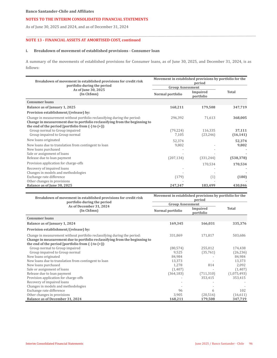 Banco Santander-Chile and Affiliates NOTES TO THE INTERIM CONSOLIDATED FINANCIAL STATEMENTS As of June 30, 2025 and 2024, and as of December 31, 2024 Interim Consolidated Financial Statements June 2025 / Banco Santander - Chile 96 NOTE 13 - FINANCIAL ASSETS AT AMORTISED COST, continued i. Breakdown of movement of established provisions - Consumer loan A summary of the movements of established provisions for Consumer loans, as of June 30, 2025, and December 31, 2024, is as follows: Breakdown of movement in established provisions for credit risk portfolio during the period As of June 30, 2025 (In Ch$mn) Movement in established provisions by portfolio for the period Group Assessment Total Normal portfolio Impaired portfolio Consumer loans Balance as of January 1, 2025 168,211 179,508 347,719 Provision establishment/(release) by: Change in measurement without portfolio reclassifying during the period: 296,392 71,613 368,005 Change in measurement due to portfolio reclassifying from the beginning to the end of the period [portfolio from (-) to (+)]: Group normal to Group impaired (79,224) 116,335 37,111 Group impaired to Group normal 7,105 (23,246) (16,141) New loans originated 52,374 52,374 New loans due to translation from contingent to loan 9,802 - 9,802 New loans purchased - - - Sale or assignment of loans - - - Release due to loan payment (207,134) (331,244) (538,378) Provision application for charge-offs 170,534 170,534 Recovery of impaired loans - - - Changes in models and methodologies - - - Exchange rate difference (179) (1) (180) Other changes in provisions - - - Balance as of June 30, 2025 247,347 183,499 430,846 Breakdown of movement in established provisions for credit risk portfolio during the period As of December 31, 2024 (In Ch$mn) Movement in established provisions by portfolio for the period Group Assessment Total Normal portfolio Impaired portfolio Consumer loans Balance as of January 1, 2024 169,345 166,031 335,376 Provision establishment/(release) by: Change in measurement without portfolio reclassifying during the period: 331,869 171,817 503,686 Change in measurement due to portfolio reclassifying from the beginning to the end of the period [portfolio from (-) to (+)]: Group normal to Group impaired (80,574) 255,012 174,438 Group impaired to Group normal 9,525 (35,761) (26,236) New loans originated 84,984 - 84,984 New loans due to translation from contingent to loan 13,373 - 13,373 New loans purchased 1,278 814 2,092 Sale or assignment of loans (1,407) - (1,407) Release due to loan payment (364,183) (711,310) (1,075,493) Provision application for charge-offs - 353,415 353,415 Recovery of impaired loans - - - Changes in models and methodologies - - - Exchange rate difference 96 6 102 Other changes in provisions 3,905 (20,516) (16,611) Balance as of December 31, 2024 168,211 179,508 347,719
