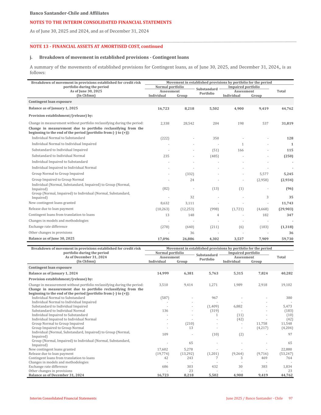 Banco Santander-Chile and Affiliates NOTES TO THE INTERIM CONSOLIDATED FINANCIAL STATEMENTS As of June 30, 2025 and 2024, and as of December 31, 2024 Interim Consolidated Financial Statements June 2025 / Banco Santander - Chile 97 NOTE 13 - FINANCIAL ASSETS AT AMORTISED COST, continued j. Breakdown of movement in established provisions - Contingent loans A summary of the movements of established provisions for Contingent loans, as of June 30, 2025, and December 31, 2024,, is as follows: Breakdown of movement in provisions established for credit risk portfolio during the period As of June 30, 2025 (In Ch$mn) Movement in established provisions by portfolio for the period Normal portfolio Substandard Portfolio Impaired portfolio Total Assessment Assessment Individual Group Individual Group Contingent loan exposure Balance as of January 1, 2025 16,723 8,218 5,502 4,900 9,419 44,762 Provision establishment/(release) by: Change in measurement without portfolio reclassifying during the period: 2,338 28,542 204 198 537 31,819 Change in measurement due to portfolio reclassifying from the beginning to the end of the period [portfolio from (-) to (+)]: Individual Normal to Substandard (222) - 350 - - 128 Individual Normal to Individual Impaired - - - 1 - 1 Substandard to Individual Impaired - - (51) 166 - 115 Substandard to Individual Normal 235 - (485) - - (250) Individual Impaired to Substandard - - - - - - Individual Impaired to Individual Normal - - - - - - Group Normal to Group Impaired - (332) - - 5,577 5,245 Group Impaired to Group Normal - 24 - - (2,958) (2,934) Individual (Normal, Substandard, Impaired) to Group (Normal, Impaired) (82) - (13) (1) - (96) Group (Normal, Impaired) to Individual (Normal, Substandard, Impaired) - 32 - - 3 35 New contingent loans granted 8,632 3,111 - - - 11,743 Release due to loan payment (10,263) (12,253) (998) (1,721) (4,668) (29,903) Contingent loans from translation to loans 13 148 4 - 182 347 Changes in models and methodologies - - - - - - Exchange rate difference (278) (640) (211) (6) (183) (1,318) Other changes in provisions - 36 - - - 36 Balance as of June 30, 2025 17,096 26,886 4,302 3,537 7,909 59,730 Breakdown of movement in provisions established for credit risk portfolio during the period As of December 31, 2024 (In Ch$mn) Movement in established provisions by portfolio for the period Normal portfolio Substandard Portfolio Impaired portfolio Total Assessment Assessment Individual Group Individual Group Contingent loan exposure Balance as of January 1, 2024 14,999 6,381 5,763 5,315 7,824 40,282 Provision establishment/(release) by: Change in measurement without portfolio reclassifying during the period: 3,510 9,414 1,271 1,989 2,918 19,102 Change in measurement due to portfolio reclassifying from the beginning to the end of the period [portfolio from (-) to (+)]: Individual Normal to Substandard (587) - 967 - - 380 Individual Normal to Individual Impaired - - - - - - Substandard to Individual Impaired - - (1,409) 6,882 - 5,473 Substandard to Individual Normal 136 - (319) - - (183) Individual Impaired to Substandard - - 1 (11) - (10) Individual Impaired to Individual Normal - - - (42) - (42) Group Normal to Group Impaired - (210) - - 11,758 11,548 Group Impaired to Group Normal - 13 - - (4,217) (4,204) Individual (Normal, Substandard, Impaired) to Group (Normal, Impaired) 109 - (10) (2) - 97 Group (Normal, Impaired) to Individual (Normal, Substandard, Impaired) - 65 - - - 65 New contingent loans granted 17,602 5,278 - - - 22,880 Release due to loan payment (19,774) (13,292) (1,201) (9,264) (9,716) (53,247) Contingent loans from translation to loans 42 243 7 3 469 764 Changes in models and methodologies - - - - - - Exchange rate difference 686 303 432 30 383 1,834 Other changes in provisions - 23 - - - 23 Balance as of December 31, 2024 16,723 8,218 5,502 4,900 9,419 44,762