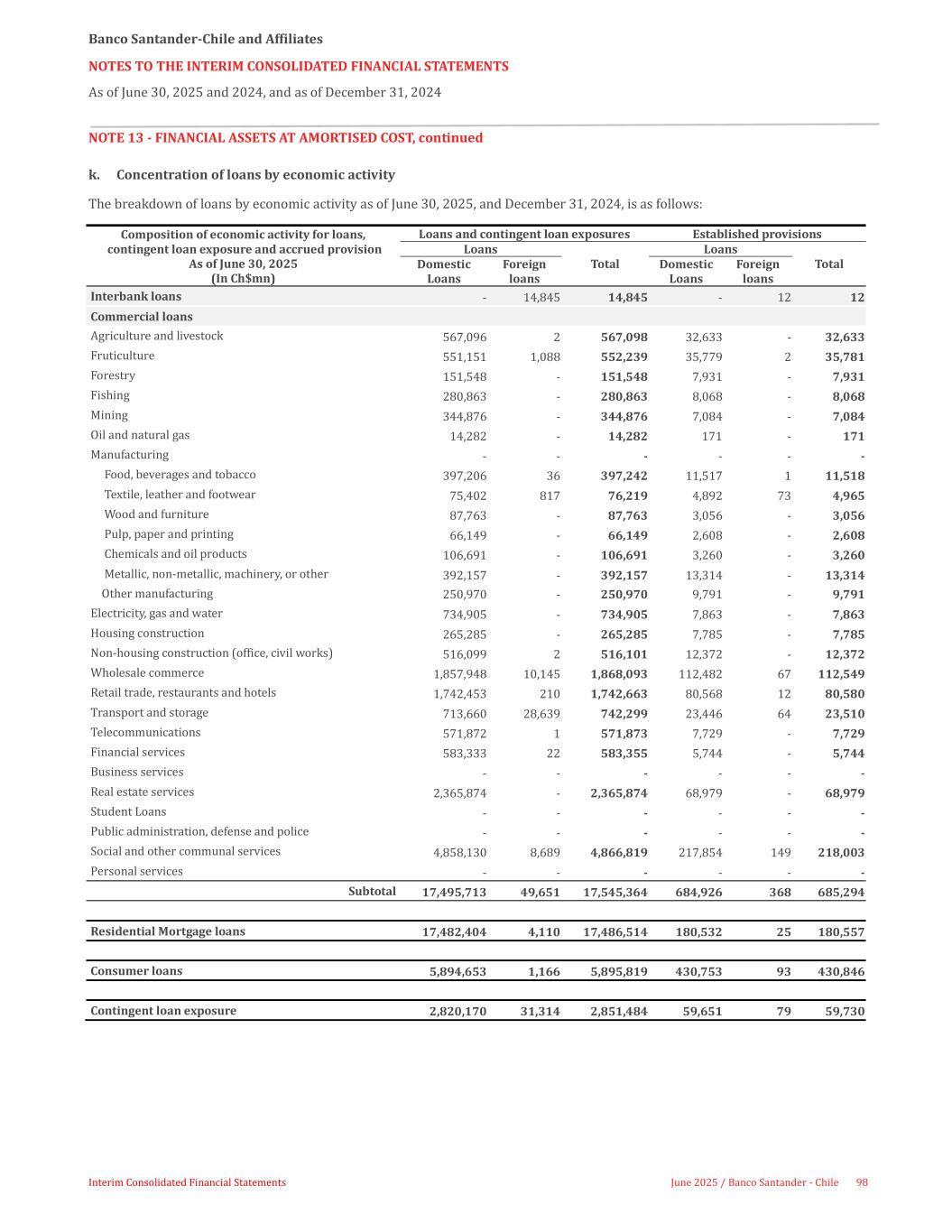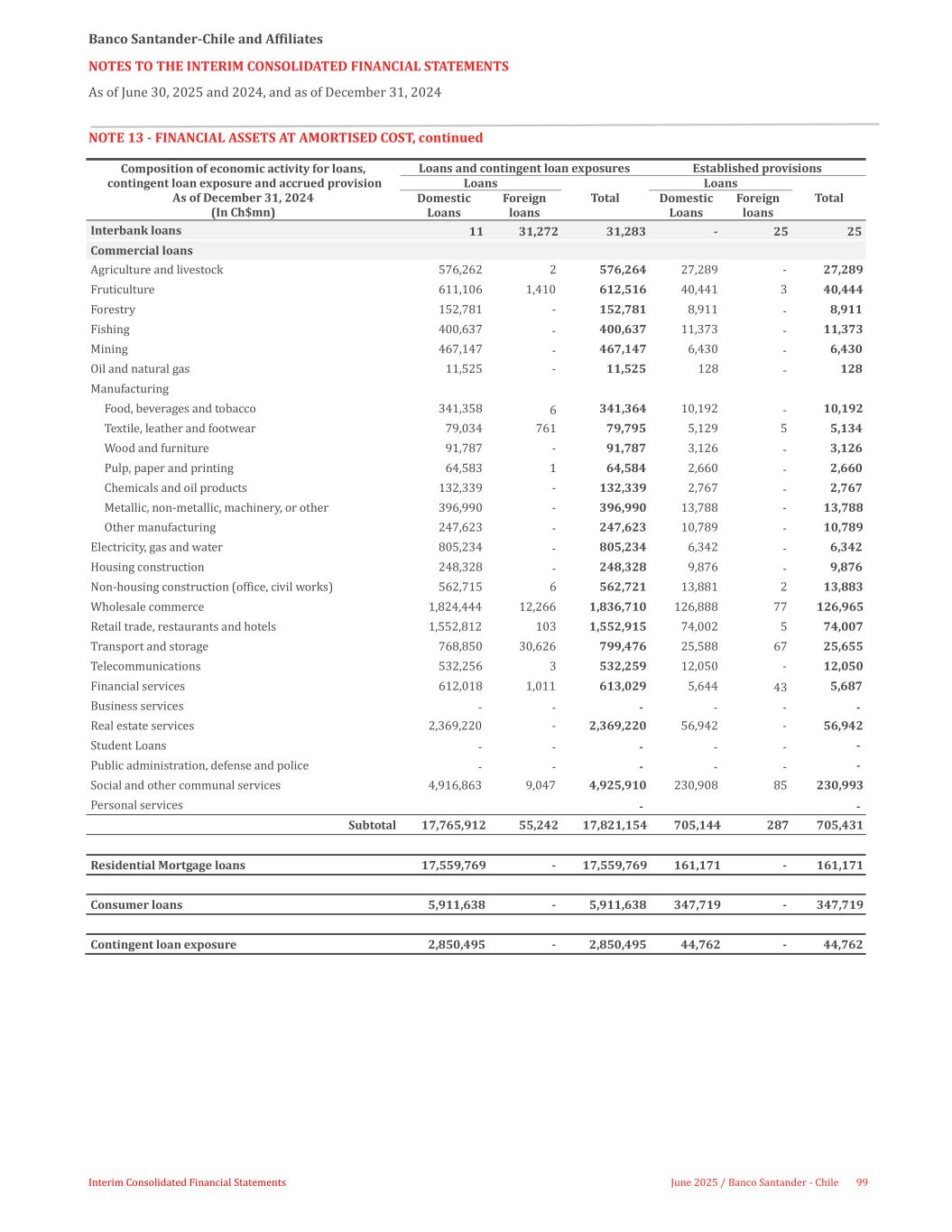 Banco Santander-Chile and Affiliates NOTES TO THE INTERIM CONSOLIDATED FINANCIAL STATEMENTS As of June 30, 2025 and 2024, and as of December 31, 2024 Interim Consolidated Financial Statements June 2025 / Banco Santander - Chile 98 NOTE 13 - FINANCIAL ASSETS AT AMORTISED COST, continued k. Concentration of loans by economic activity The breakdown of loans by economic activity as of June 30, 2025, and December 31, 2024, is as follows: Composition of economic activity for loans, contingent loan exposure and accrued provision As of June 30, 2025 (In Ch$mn) Loans and contingent loan exposures Established provisions Loans Total Loans Total Domestic Loans Foreign loans Domestic Loans Foreign loans Interbank loans - 14,845 14,845 - 12 12 Commercial loans Agriculture and livestock 567,096 2 567,098 32,633 - 32,633 Fruticulture 551,151 1,088 552,239 35,779 2 35,781 Forestry 151,548 - 151,548 7,931 - 7,931 Fishing 280,863 - 280,863 8,068 - 8,068 Mining 344,876 - 344,876 7,084 - 7,084 Oil and natural gas 14,282 - 14,282 171 - 171 Manufacturing - - - - - - Food, beverages and tobacco 397,206 36 397,242 11,517 1 11,518 Textile, leather and footwear 75,402 817 76,219 4,892 73 4,965 Wood and furniture 87,763 - 87,763 3,056 - 3,056 Pulp, paper and printing 66,149 - 66,149 2,608 - 2,608 Chemicals and oil products 106,691 - 106,691 3,260 - 3,260 Metallic, non-metallic, machinery, or other 392,157 - 392,157 13,314 - 13,314 Other manufacturing 250,970 - 250,970 9,791 - 9,791 Electricity, gas and water 734,905 - 734,905 7,863 - 7,863 Housing construction 265,285 - 265,285 7,785 - 7,785 Non-housing construction (office, civil works) 516,099 2 516,101 12,372 - 12,372 Wholesale commerce 1,857,948 10,145 1,868,093 112,482 67 112,549 Retail trade, restaurants and hotels 1,742,453 210 1,742,663 80,568 12 80,580 Transport and storage 713,660 28,639 742,299 23,446 64 23,510 Telecommunications 571,872 1 571,873 7,729 - 7,729 Financial services 583,333 22 583,355 5,744 - 5,744 Business services - - - - - - Real estate services 2,365,874 - 2,365,874 68,979 - 68,979 Student Loans - - - - - - Public administration, defense and police - - - - - - Social and other communal services 4,858,130 8,689 4,866,819 217,854 149 218,003 Personal services - - - - - - Subtotal 17,495,713 49,651 17,545,364 684,926 368 685,294 Residential Mortgage loans 17,482,404 4,110 17,486,514 180,532 25 180,557 Consumer loans 5,894,653 1,166 5,895,819 430,753 93 430,846 Contingent loan exposure 2,820,170 31,314 2,851,484 59,651 79 59,730
