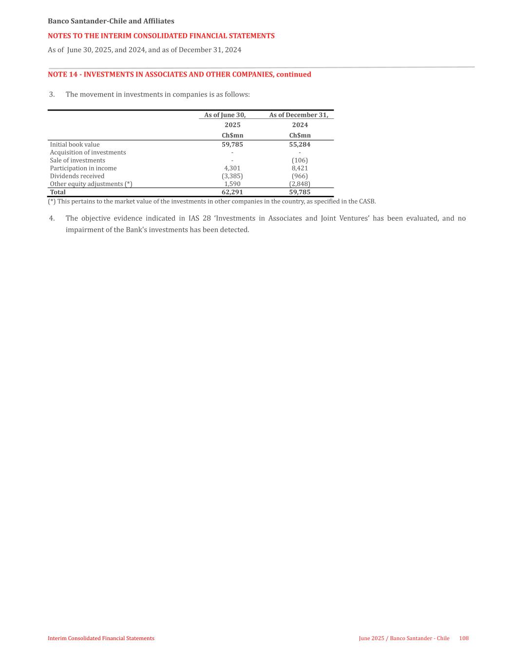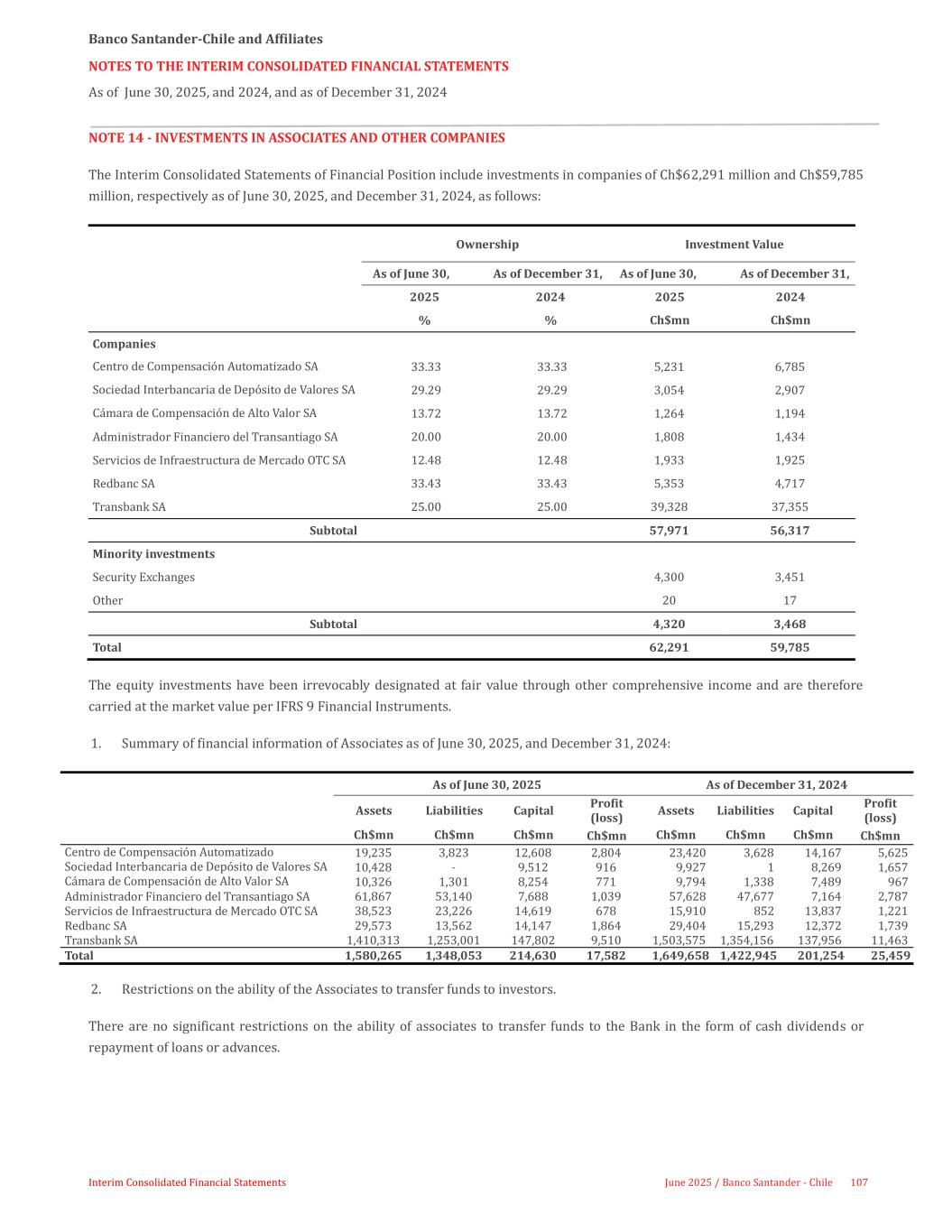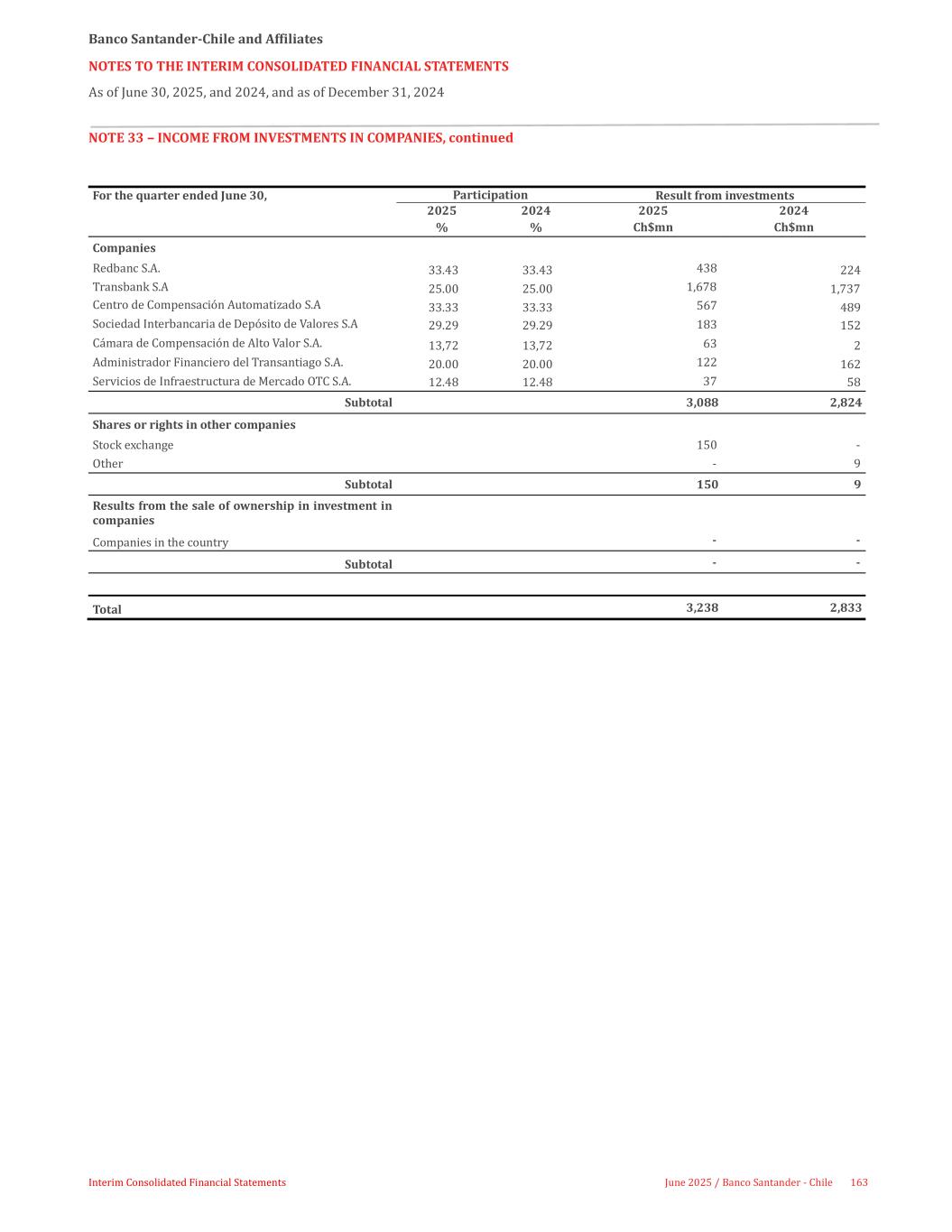 Banco Santander-Chile and Affiliates NOTES TO THE INTERIM CONSOLIDATED FINANCIAL STATEMENTS As of June 30, 2025, and 2024, and as of December 31, 2024 Interim Consolidated Financial Statements June 2025 / Banco Santander - Chile 163 NOTE 33 INCOME FROM INVESTMENTS IN COMPANIES, continued For the quarter ended June 30, Participation Result from investments 2025 2024 2025 2024 % % Ch$mn Ch$mn Companies Redbanc S.A. 33.43 33.43 438 224 Transbank S.A 25.00 25.00 1,678 1,737 Centro de Compensación Automatizado S.A 33.33 33.33 567 489 Sociedad Interbancaria de Depósito de Valores S.A 29.29 29.29 183 152 Cámara de Compensación de Alto Valor S.A. 13,72 13,72 63 2 Administrador Financiero del Transantiago S.A. 20.00 20.00 122 162 Servicios de Infraestructura de Mercado OTC S.A. 12.48 12.48 37 58 Subtotal 3,088 2,824 Shares or rights in other companies Stock exchange 150 - Other - 9 Subtotal 150 9 Results from the sale of ownership in investment in companies Companies in the country - - Subtotal - - Total 3,238 2,833