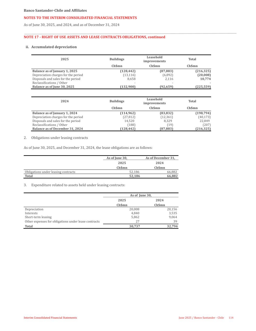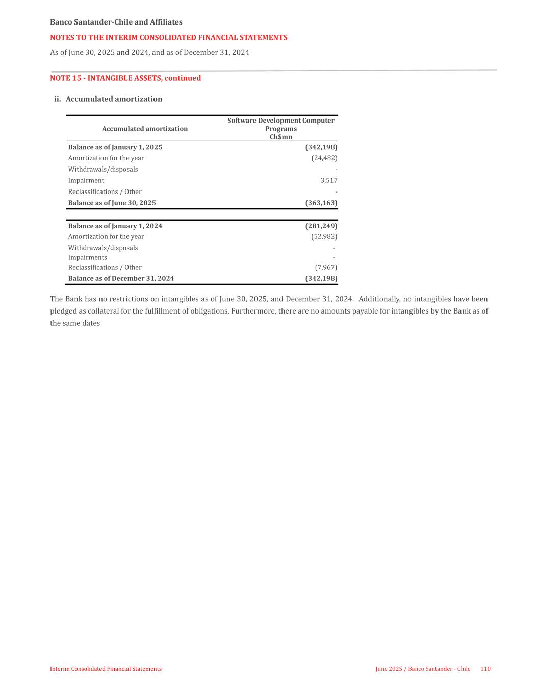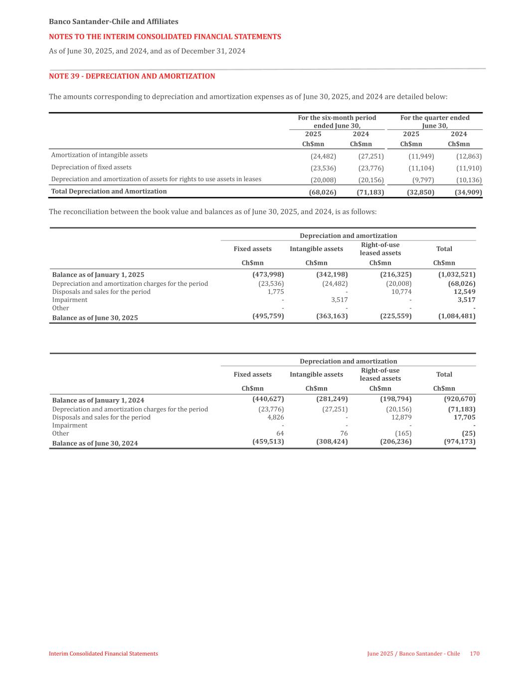 Banco Santander-Chile and Affiliates NOTES TO THE INTERIM CONSOLIDATED FINANCIAL STATEMENTS As of June 30, 2025, and 2024, and as of December 31, 2024 Interim Consolidated Financial Statements June 2025 / Banco Santander - Chile 170 NOTE 39 - DEPRECIATION AND AMORTIZATION The amounts corresponding to depreciation and amortization expenses as of June 30, 2025, and 2024 are detailed below: For the six-month period ended June 30, For the quarter ended June 30, 2025 2024 2025 2024 Ch$mn Ch$mn Ch$mn Ch$mn Amortization of intangible assets (24,482) (27,251) (11,949) (12,863) Depreciation of fixed assets (23,536) (23,776) (11,104) (11,910) Depreciation and amortization of assets for rights to use assets in leases (20,008) (20,156) (9,797) (10,136) Total Depreciation and Amortization (68,026) (71,183) (32,850) (34,909) The reconciliation between the book value and balances as of June 30, 2025, and 2024, is as follows: Depreciation and amortization Fixed assets Intangible assets Right-of-use leased assets Total Ch$mn Ch$mn Ch$mn Ch$mn Balance as of January 1, 2025 (473,998) (342,198) (216,325) (1,032,521) Depreciation and amortization charges for the period (23,536) (24,482) (20,008) (68,026) Disposals and sales for the period 1,775 - 10,774 12,549 Impairment - 3,517 - 3,517 Other - - - - Balance as of June 30, 2025 (495,759) (363,163) (225,559) (1,084,481) Depreciation and amortization Fixed assets Intangible assets Right-of-use leased assets Total Ch$mn Ch$mn Ch$mn Ch$mn Balance as of January 1, 2024 (440,627) (281,249) (198,794) (920,670) Depreciation and amortization charges for the period (23,776) (27,251) (20,156) (71,183) Disposals and sales for the period 4,826 - 12,879 17,705 Impairment - - - - Other 64 76 (165) (25) Balance as of June 30, 2024 (459,513) (308,424) (206,236) (974,173)