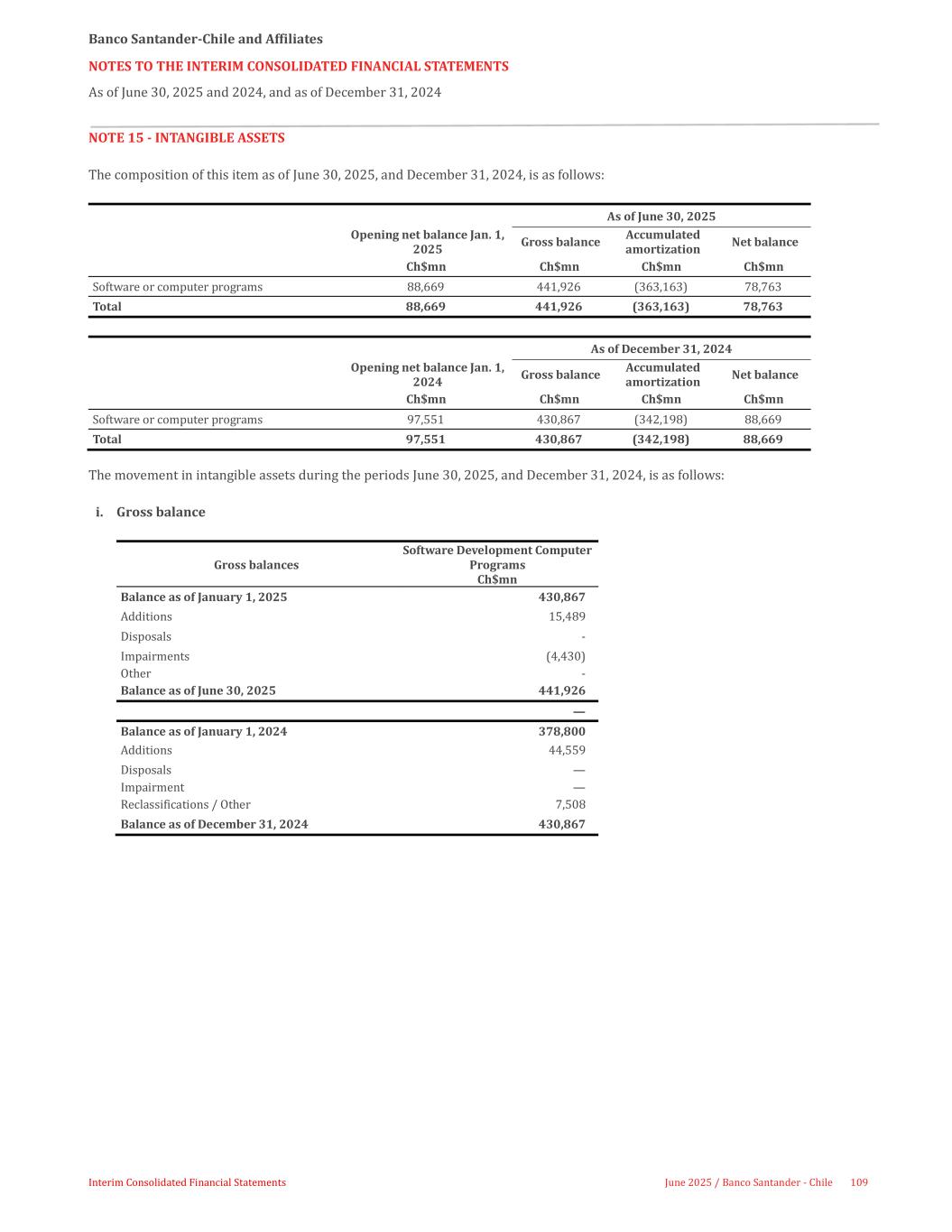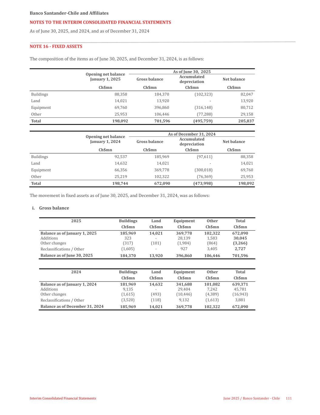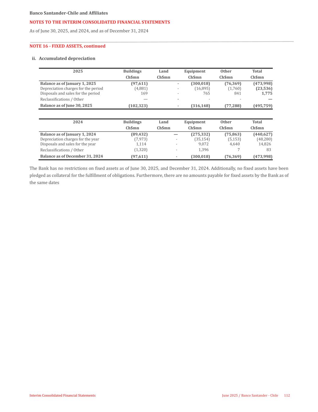 Banco Santander-Chile and Affiliates NOTES TO THE INTERIM CONSOLIDATED FINANCIAL STATEMENTS As of June 30, 2025, and 2024, and as of December 31, 2024 Interim Consolidated Financial Statements June 2025 / Banco Santander - Chile 170 NOTE 39 - DEPRECIATION AND AMORTIZATION The amounts corresponding to depreciation and amortization expenses as of June 30, 2025, and 2024 are detailed below: For the six-month period ended June 30, For the quarter ended June 30, 2025 2024 2025 2024 Ch$mn Ch$mn Ch$mn Ch$mn Amortization of intangible assets (24,482) (27,251) (11,949) (12,863) Depreciation of fixed assets (23,536) (23,776) (11,104) (11,910) Depreciation and amortization of assets for rights to use assets in leases (20,008) (20,156) (9,797) (10,136) Total Depreciation and Amortization (68,026) (71,183) (32,850) (34,909) The reconciliation between the book value and balances as of June 30, 2025, and 2024, is as follows: Depreciation and amortization Fixed assets Intangible assets Right-of-use leased assets Total Ch$mn Ch$mn Ch$mn Ch$mn Balance as of January 1, 2025 (473,998) (342,198) (216,325) (1,032,521) Depreciation and amortization charges for the period (23,536) (24,482) (20,008) (68,026) Disposals and sales for the period 1,775 - 10,774 12,549 Impairment - 3,517 - 3,517 Other - - - - Balance as of June 30, 2025 (495,759) (363,163) (225,559) (1,084,481) Depreciation and amortization Fixed assets Intangible assets Right-of-use leased assets Total Ch$mn Ch$mn Ch$mn Ch$mn Balance as of January 1, 2024 (440,627) (281,249) (198,794) (920,670) Depreciation and amortization charges for the period (23,776) (27,251) (20,156) (71,183) Disposals and sales for the period 4,826 - 12,879 17,705 Impairment - - - - Other 64 76 (165) (25) Balance as of June 30, 2024 (459,513) (308,424) (206,236) (974,173)