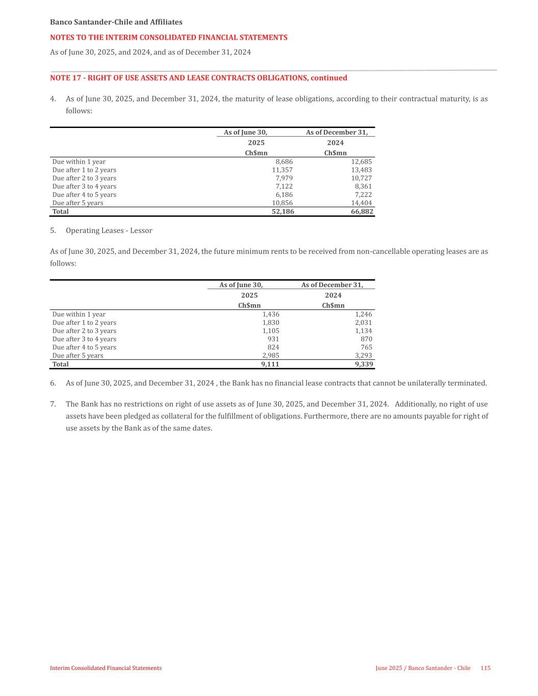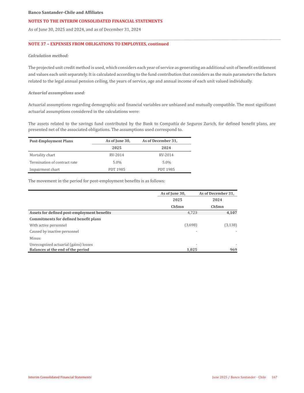 Banco Santander-Chile and Affiliates NOTES TO THE INTERIM CONSOLIDATED FINANCIAL STATEMENTS As of June 30, 2025 and 2024, and as of December 31, 2024 Interim Consolidated Financial Statements June 2025 / Banco Santander - Chile 167 NOTE 37 EXPENSES FROM OBLIGATIONS TO EMPLOYEES, continued Calculation method: The projected unit credit method is used, which considers each year of service as generating an additional unit of benefit entitlement and values each unit separately. It is calculated according to the fund contribution that considers as the main parameters the factors related to the legal annual pension ceiling, the years of service, age and annual income of each unit valued individually. Actuarial assumptions used: Actuarial assumptions regarding demographic and financial variables are unbiased and mutually compatible. The most significant actuarial assumptions considered in the calculations were: The assets related to the savings fund contributed by the Bank to Compañía de Seguros Zurich, for defined benefit plans, are presented net of the associated obligations. The assumptions used correspond to. Post-Employment Plans As of June 30, As of December 31, 2025 2024 Mortality chart RV-2014 RV-2014 Termination of contract rate 5.0% 5.0% Impairment chart PDT 1985 PDT 1985 The movement in the period for post-employment benefits is as follows: As of June 30, As of December 31, 2025 2024 Ch$mn Ch$mn Assets for defined post-employment benefits 4,723 4,107 Commitments for defined benefit plans With active personnel (3,698) (3,138) Caused by inactive personnel - - Minus: Unrecognized actuarial (gains) losses - - Balances at the end of the period 1,025 969