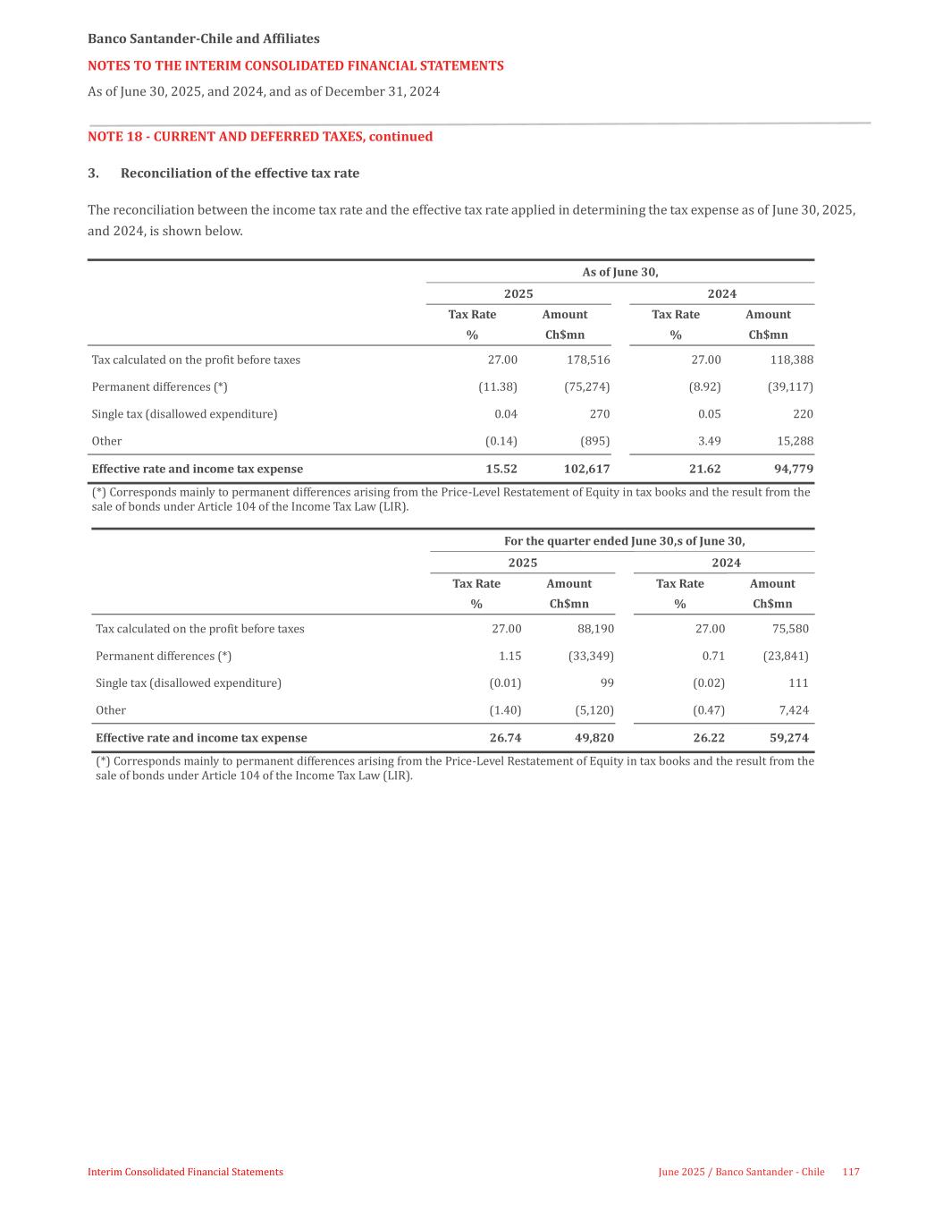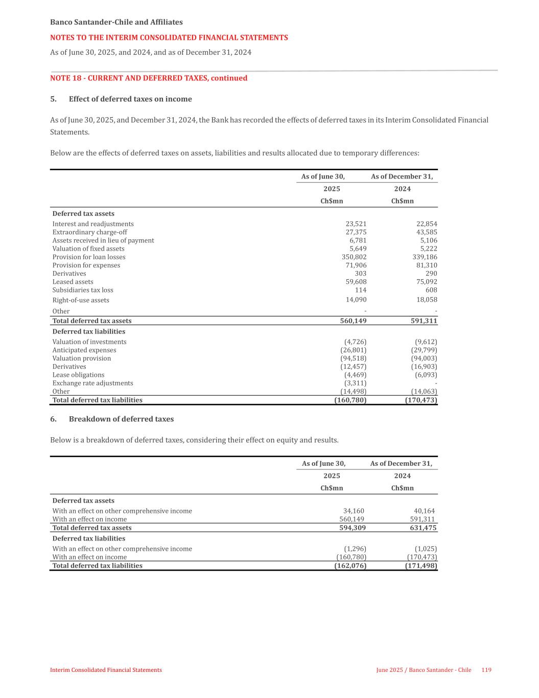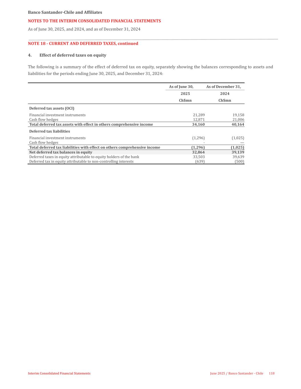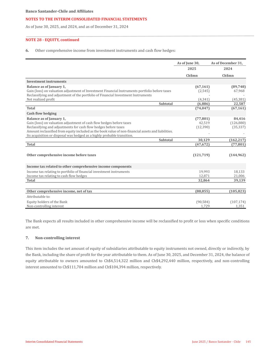 Banco Santander-Chile and Affiliates NOTES TO THE INTERIM CONSOLIDATED FINANCIAL STATEMENTS As of June 30, 2025, and 2024, and as of December 31, 2024 Interim Consolidated Financial Statements June 2025 / Banco Santander - Chile 145 NOTE 28 - EQUITY, continued 6. Other comprehensive income from investment instruments and cash flow hedges: As of June 30, As of December 31, 2025 2024 Ch$mn Ch$mn Investment instruments Balance as of January 1, (67,161) (89,748) Gain (loss) on valuation adjustment of Investment Financial Instruments portfolio before taxes (2,545) 67,968 Reclassifying and adjustment of the portfolio of Financial Investment Instruments - - Net realized profit (4,341) (45,381) Subtotal (6,886) 22,587 Total (74,047) (67,161) Cash flow hedging Balance as of January 1, (77,801) 84,416 Gain (loss) on valuation adjustment of cash flow hedges before taxes 42,519 (126,880) Reclassifying and adjustments for cash flow hedges before taxes (12,390) (35,337) Amount reclassified from equity included as the book value of non-financial assets and liabilities. Its acquisition or disposal was hedged as a highly probable transition. - - Subtotal 30,129 (162,217) Total (47,672) (77,801) Other comprehensive income before taxes (121,719) (144,962) Income tax related to other comprehensive income components Income tax relating to portfolio of financial investment instruments 19,993 18,133 Income tax relating to cash flow hedges 12,871 21,006 Total 32,864 39,139 Other comprehensive income, net of tax (88,855) (105,823) Attributable to: Equity holders of the Bank (90,584) (107,174) Non-controlling interest 1,729 1,351 The Bank expects all results included in other comprehensive income will be reclassified to profit or loss when specific conditions are met. 7. Non-controlling interest This item includes the net amount of equity of subsidiaries attributable to equity instruments not owned, directly or indirectly, by the Bank, including the share of profit for the year attributable to them. As of June 30, 2025, and December 31, 2024, the balance of equity attributable to owners amounted to Ch$4,514,322 million and Ch$4,292,440 million, respectively, and non-controlling interest amounted to Ch$111,704 million and Ch$104,394 million, respectively.