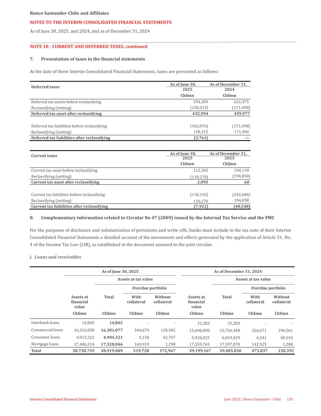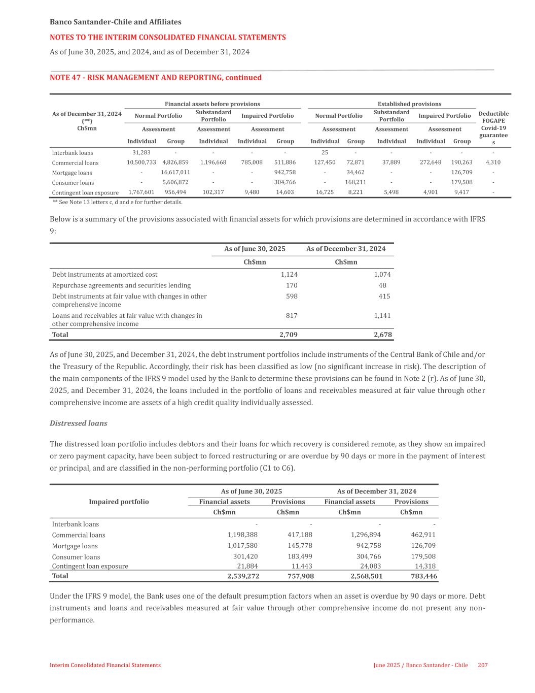 Banco Santander-Chile and Affiliates NOTES TO THE INTERIM CONSOLIDATED FINANCIAL STATEMENTS As of June 30, 2025, and 2024, and as of December 31, 2024 Interim Consolidated Financial Statements June 2025 / Banco Santander - Chile 207 NOTE 47 - RISK MANAGEMENT AND REPORTING, continued As of December 31, 2024 (**) Ch$mn Financial assets before provisions Established provisions Normal Portfolio Substandard Portfolio Impaired Portfolio Normal Portfolio Substandard Portfolio Impaired Portfolio Deductible FOGAPE Covid-19 guarantee s Assessment Assessment Assessment Assessment Assessment Assessment Individual Group Individual Individual Group Individual Group Individual Individual Group Interbank loans 31,283 - - - - 25 - - - - - Commercial loans 10,500,733 4,826,859 1,196,668 785,008 511,886 127,450 72,871 37,889 272,648 190,263 4,310 Mortgage loans - 16,617,011 - - 942,758 - 34,462 - - 126,709 - Consumer loans - 5,606,872 - - 304,766 - 168,211 - - 179,508 - Contingent loan exposure 1,767,601 956,494 102,317 9,480 14,603 16,725 8,221 5,498 4,901 9,417 - ** See Note 13 letters c, d and e for further details. Below is a summary of the provisions associated with financial assets for which provisions are determined in accordance with IFRS 9: As of June 30, 2025 As of December 31, 2024 Ch$mn Ch$mn Debt instruments at amortized cost 1,124 1,074 Repurchase agreements and securities lending 170 48 Debt instruments at fair value with changes in other comprehensive income 598 415 Loans and receivables at fair value with changes in other comprehensive income 817 1,141 Total 2,709 2,678 As of June 30, 2025, and December 31, 2024, the debt instrument portfolios include instruments of the Central Bank of Chile and/or the Treasury of the Republic. Accordingly, their risk has been classified as low (no significant increase in risk). The description of the main components of the IFRS 9 model used by the Bank to determine these provisions can be found in Note 2 (r). As of June 30, 2025, and December 31, 2024, the loans included in the portfolio of loans and receivables measured at fair value through other comprehensive income are assets of a high credit quality individually assessed. Distressed loans The distressed loan portfolio includes debtors and their loans for which recovery is considered remote, as they show an impaired or zero payment capacity, have been subject to forced restructuring or are overdue by 90 days or more in the payment of interest or principal, and are classified in the non-performing portfolio (C1 to C6). As of June 30, 2025 As of December 31, 2024 Impaired portfolio Financial assets Provisions Financial assets Provisions Ch$mn Ch$mn Ch$mn Ch$mn Interbank loans - - - - Commercial loans 1,198,388 417,188 1,296,894 462,911 Mortgage loans 1,017,580 145,778 942,758 126,709 Consumer loans 301,420 183,499 304,766 179,508 Contingent loan exposure 21,884 11,443 24,083 14,318 Total 2,539,272 757,908 2,568,501 783,446 Under the IFRS 9 model, the Bank uses one of the default presumption factors when an asset is overdue by 90 days or more. Debt instruments and loans and receivables measured at fair value through other comprehensive income do not present any non- performance.