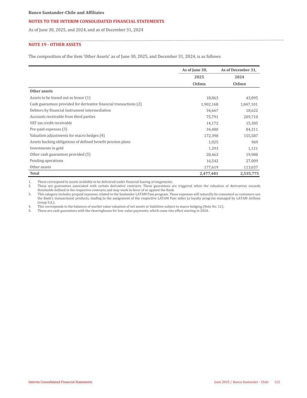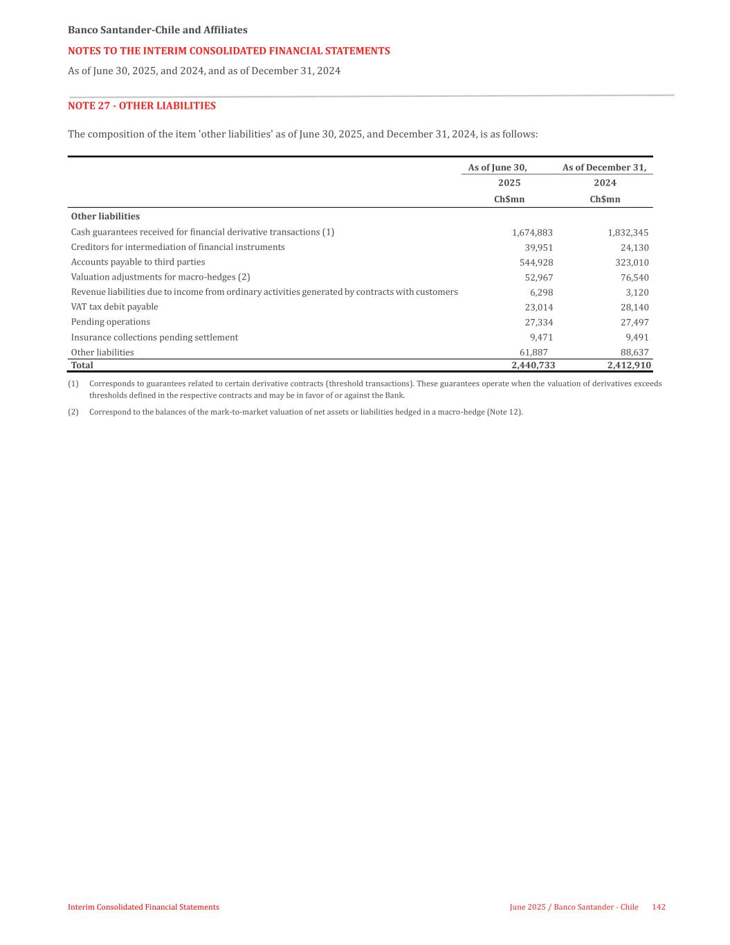 Banco Santander-Chile and Affiliates NOTES TO THE INTERIM CONSOLIDATED FINANCIAL STATEMENTS As of June 30, 2025 and 2024, and as of December 31, 2024 Interim Consolidated Financial Statements June 2025 / Banco Santander - Chile 82 NOTE 12 - FINANCIAL DERIVATIVE CONTRACTS FOR HEDGE ACCOUNTING PURPOSES, continued Notional amount As of December 31, 2024 On demand Up to 1 month Between 1 month and 3 months Between 3 months and 1 year Between 1 year and 3 years Between 3 years and 5 years More than 5 years Total Ch$mn Ch$mn Ch$mn Ch$mn Ch$mn Ch$mn Ch$mn Hedged item Loans and receivables at amortized cost Mortgage loans 377,928 377,928 Commercial loans 2,001,551 2,586,367 1,139,074 218,125 5,945,117 TOTAL 2,001,551 2,586,367 1,139,074 596,053 6,323,045 Hedging instrument Currency and interest rate swaps 451,551 1,736,367 739,074 596,053 3,523,045 Interest rate swaps 1,550,000 850,000 400,000 2,800,000 TOTAL 2,001,551 2,586,367 1,139,074 596,053 6,323,045 As of June 30, 2025, and December 31, 2024, Ch$172,398 million and Ch$155,587 million, respectively, are presented under 'other assets' for the mark-to-market valuation of the net assets or liabilities hedged in a macro hedge (Note 19). Al June 30, 2025, and December 31, 2024, Ch$52,967 million and Ch$76,540 million, respectively, are presented under 'other liabilities' for the mark-to-market valuation of hedged liabilities in a macro hedge (Note 27).
