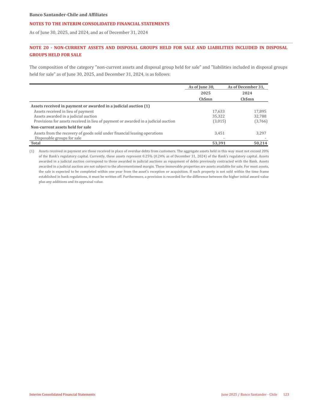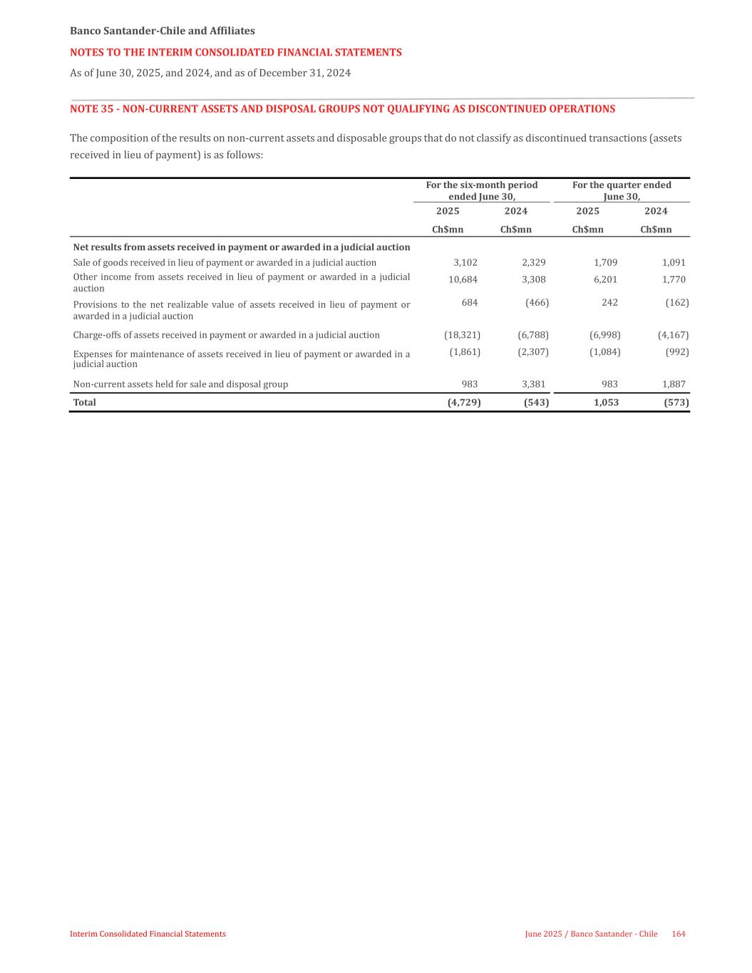 Banco Santander-Chile and Affiliates NOTES TO THE INTERIM CONSOLIDATED FINANCIAL STATEMENTS As of June 30, 2025, and 2024, and as of December 31, 2024 Interim Consolidated Financial Statements June 2025 / Banco Santander - Chile 164 NOTE 35 - NON-CURRENT ASSETS AND DISPOSAL GROUPS NOT QUALIFYING AS DISCONTINUED OPERATIONS The composition of the results on non-current assets and disposable groups that do not classify as discontinued transactions (assets received in lieu of payment) is as follows: For the six-month period ended June 30, For the quarter ended June 30, 2025 2024 2025 2024 Ch$mn Ch$mn Ch$mn Ch$mn Net results from assets received in payment or awarded in a judicial auction Sale of goods received in lieu of payment or awarded in a judicial auction 3,102 2,329 1,709 1,091 Other income from assets received in lieu of payment or awarded in a judicial auction 10,684 3,308 6,201 1,770 Provisions to the net realizable value of assets received in lieu of payment or awarded in a judicial auction 684 (466) 242 (162) Charge-offs of assets received in payment or awarded in a judicial auction (18,321) (6,788) (6,998) (4,167) Expenses for maintenance of assets received in lieu of payment or awarded in a judicial auction (1,861) (2,307) (1,084) (992) Non-current assets held for sale and disposal group 983 3,381 983 1,887 Total (4,729) (543) 1,053 (573)