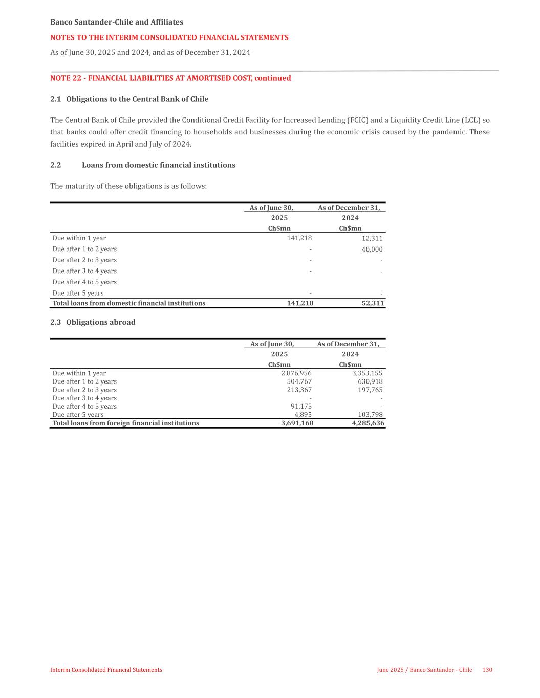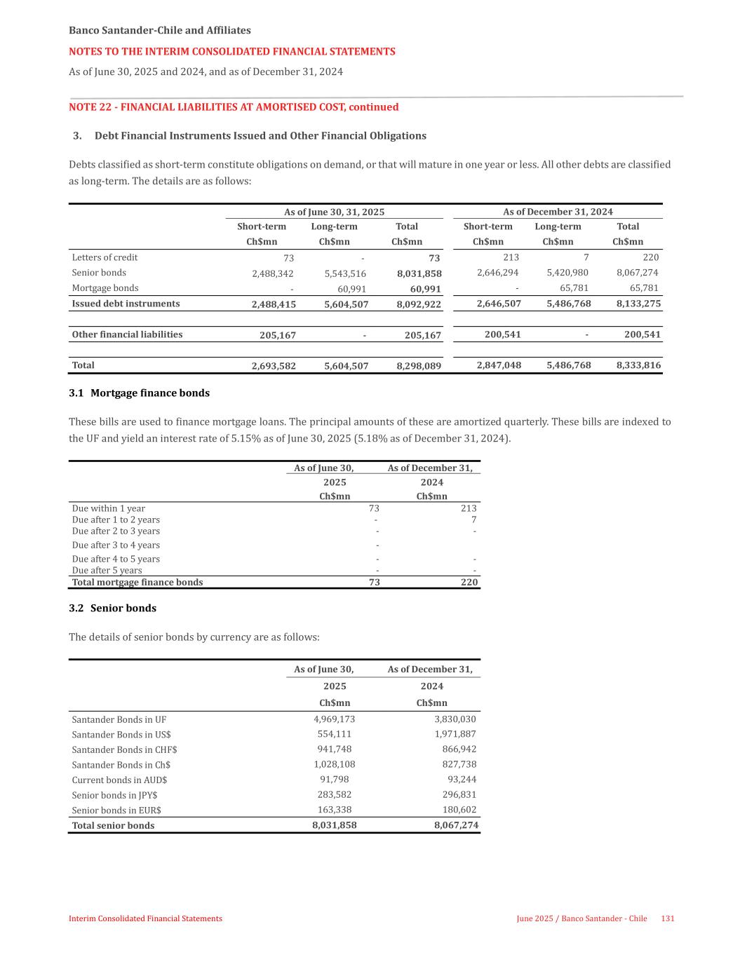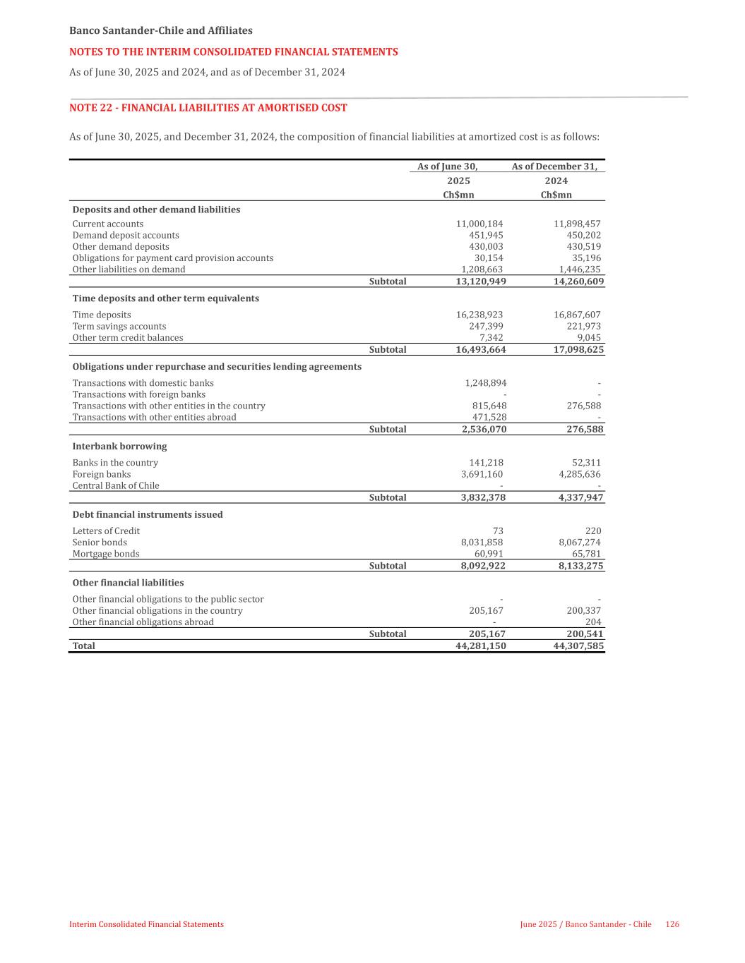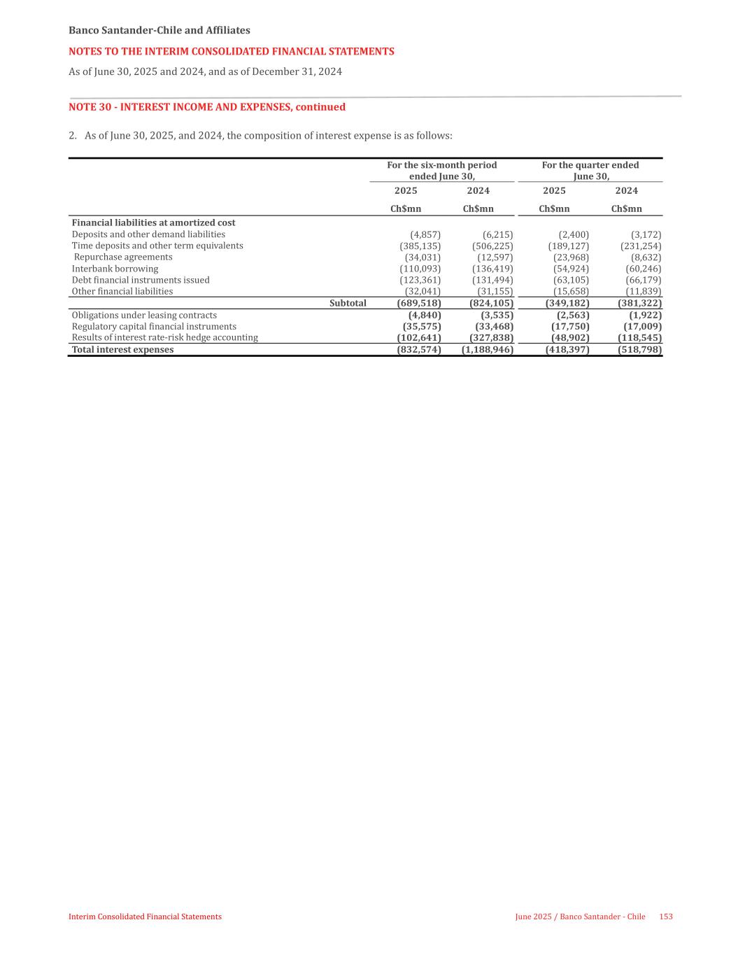 Banco Santander-Chile and Affiliates NOTES TO THE INTERIM CONSOLIDATED FINANCIAL STATEMENTS As of June 30, 2025 and 2024, and as of December 31, 2024 Interim Consolidated Financial Statements June 2025 / Banco Santander - Chile 153 NOTE 30 - INTEREST INCOME AND EXPENSES, continued 2. As of June 30, 2025, and 2024, the composition of interest expense is as follows: For the six-month period ended June 30, For the quarter ended June 30, 2025 2024 2025 2024 Ch$mn Ch$mn Ch$mn Ch$mn Financial liabilities at amortized cost Deposits and other demand liabilities (4,857) (6,215) (2,400) (3,172) Time deposits and other term equivalents (385,135) (506,225) (189,127) (231,254) Repurchase agreements (34,031) (12,597) (23,968) (8,632) Interbank borrowing (110,093) (136,419) (54,924) (60,246) Debt financial instruments issued (123,361) (131,494) (63,105) (66,179) Other financial liabilities (32,041) (31,155) (15,658) (11,839) Subtotal (689,518) (824,105) (349,182) (381,322) Obligations under leasing contracts (4,840) (3,535) (2,563) (1,922) Regulatory capital financial instruments (35,575) (33,468) (17,750) (17,009) Results of interest rate-risk hedge accounting (102,641) (327,838) (48,902) (118,545) Total interest expenses (832,574) (1,188,946) (418,397) (518,798)