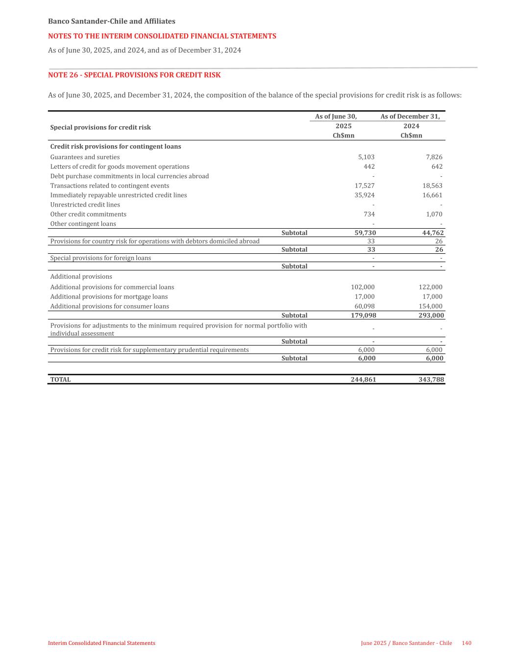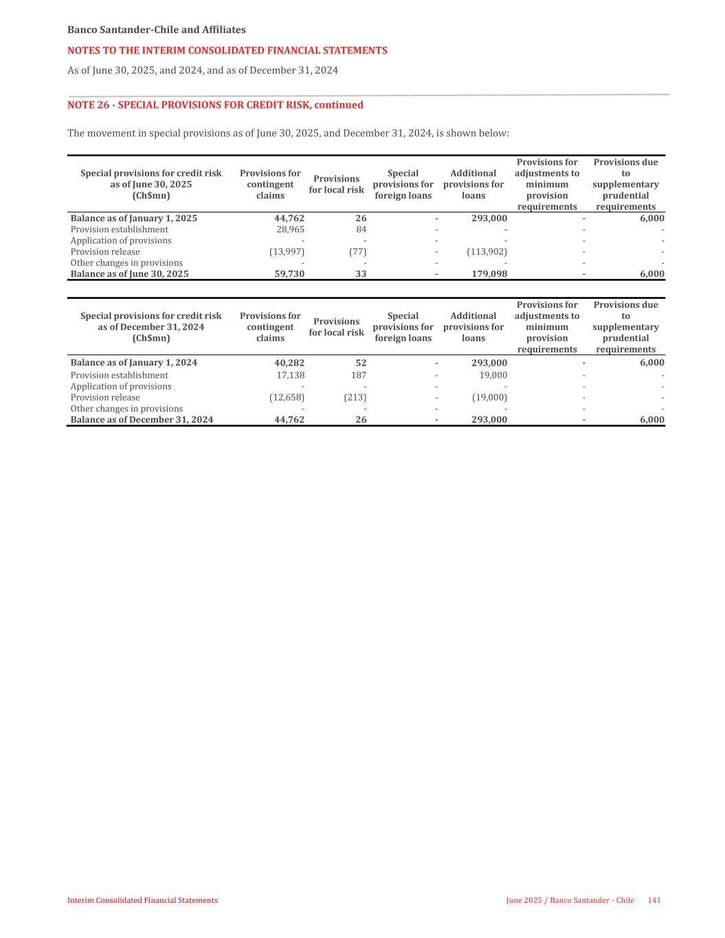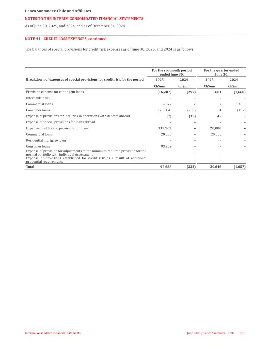 Banco Santander-Chile and Affiliates NOTES TO THE INTERIM CONSOLIDATED FINANCIAL STATEMENTS As of June 30, 2025, and 2024, and as of December 31, 2024 Interim Consolidated Financial Statements June 2025 / Banco Santander - Chile 175 NOTE 41 - CREDIT LOSS EXPENSES, continued The balances of special provisions for credit risk expenses as of June 30, 2025, and 2024 is as follows: For the six-month period ended June 30, For the quarter ended June 30, Breakdown of expenses of special provisions for credit risk for the period 2025 2024 2025 2024 Ch$mn Ch$mn Ch$mn Ch$mn Provision expense for contingent loans (16,207) (297) 601 (1,660) Interbank loans Commercial loans 4,077 2 537 (1,463) Consumer loans (20,284) (299) 64 (197) Expense of provisions for local risk in operations with debtors abroad (7) (35) 45 3 Expense of special provisions for loans abroad Expense of additional provisions for loans 113,902 20,000 Commercial loans 20,000 20,000 Residential mortgage loans Consumer loans 93,902 Expense of provision for adjustments to the minimum required provision for the normal portfolio with individual Assessment Expense of provisions established for credit risk as a result of additional prudential requirements Total 97,688 (332) 20,646 (1,657)