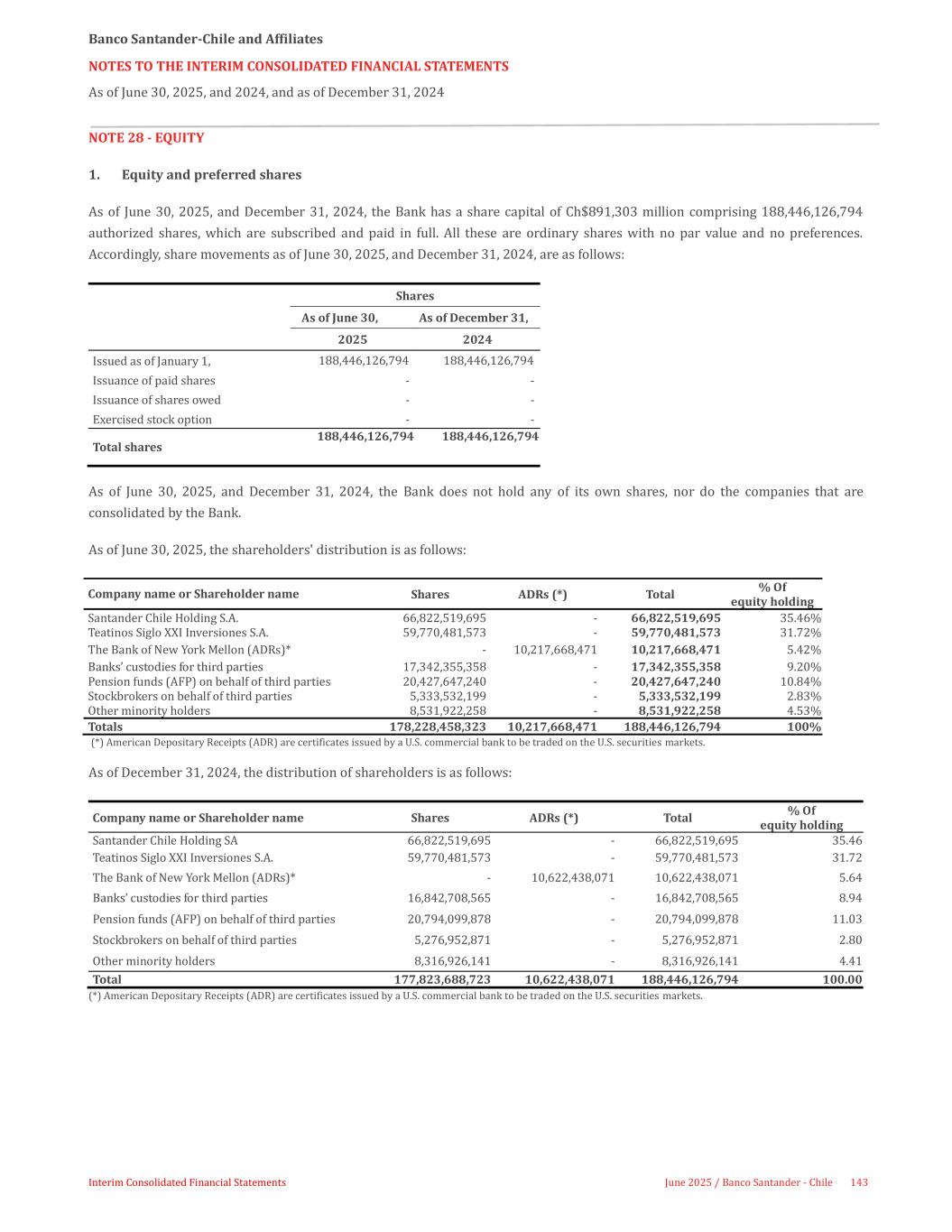 Banco Santander-Chile and Affiliates NOTES TO THE INTERIM CONSOLIDATED FINANCIAL STATEMENTS As of June 30, 2025, and 2024, and as of December 31, 2024 Interim Consolidated Financial Statements June 2025 / Banco Santander - Chile 143 NOTE 28 - EQUITY 1. Equity and preferred shares As of June 30, 2025, and December 31, 2024, the Bank has a share capital of Ch$891,303 million comprising 188,446,126,794 authorized shares, which are subscribed and paid in full. All these are ordinary shares with no par value and no preferences. Accordingly, share movements as of June 30, 2025, and December 31, 2024, are as follows: Shares As of June 30, As of December 31, 2025 2024 Issued as of January 1, 188,446,126,794 188,446,126,794 Issuance of paid shares - - Issuance of shares owed - - Exercised stock option - - Total shares 188,446,126,794 188,446,126,794 As of June 30, 2025, and December 31, 2024, the Bank does not hold any of its own shares, nor do the companies that are consolidated by the Bank. As of June 30, 2025, the shareholders' distribution is as follows: Company name or Shareholder name Shares ADRs (*) Total % Of equity holding Santander Chile Holding S.A. 66,822,519,695 - 66,822,519,695 35.46% Teatinos Siglo XXI Inversiones S.A. 59,770,481,573 - 59,770,481,573 31.72% The Bank of New York Mellon (ADRs)* - 10,217,668,471 10,217,668,471 5.42% 17,342,355,358 - 17,342,355,358 9.20% Pension funds (AFP) on behalf of third parties 20,427,647,240 - 20,427,647,240 10.84% Stockbrokers on behalf of third parties 5,333,532,199 - 5,333,532,199 2.83% Other minority holders 8,531,922,258 - 8,531,922,258 4.53% Totals 178,228,458,323 10,217,668,471 188,446,126,794 100% (*) American Depositary Receipts (ADR) are certificates issued by a U.S. commercial bank to be traded on the U.S. securities markets. As of December 31, 2024, the distribution of shareholders is as follows: Company name or Shareholder name Shares ADRs (*) Total % Of equity holding Santander Chile Holding SA 66,822,519,695 - 66,822,519,695 35.46 Teatinos Siglo XXI Inversiones S.A. 59,770,481,573 - 59,770,481,573 31.72 The Bank of New York Mellon (ADRs)* - 10,622,438,071 10,622,438,071 5.64 16,842,708,565 - 16,842,708,565 8.94 Pension funds (AFP) on behalf of third parties 20,794,099,878 - 20,794,099,878 11.03 Stockbrokers on behalf of third parties 5,276,952,871 - 5,276,952,871 2.80 Other minority holders 8,316,926,141 - 8,316,926,141 4.41 Total 177,823,688,723 10,622,438,071 188,446,126,794 100.00 (*) American Depositary Receipts (ADR) are certificates issued by a U.S. commercial bank to be traded on the U.S. securities markets.