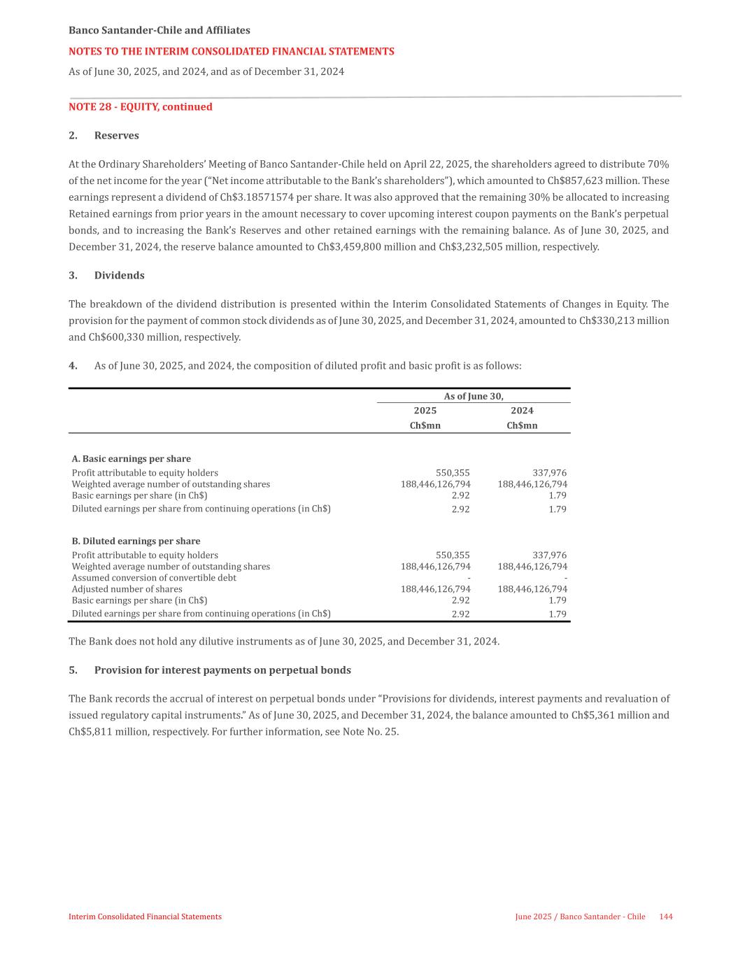 Banco Santander-Chile and Affiliates NOTES TO THE INTERIM CONSOLIDATED FINANCIAL STATEMENTS As of June 30, 2025, and 2024, and as of December 31, 2024 Interim Consolidated Financial Statements June 2025 / Banco Santander - Chile 144 NOTE 28 - EQUITY, continued 2. Reserves A -Chile held on April 22, 2025, the shareholders agreed to distribute 70% Ch$857,623 million. These earnings represent a dividend of Ch$3.18571574 per share. It was also approved that the remaining 30% be allocated to increasing eserves and other retained earnings with the remaining balance. As of June 30, 2025, and December 31, 2024, the reserve balance amounted to Ch$3,459,800 million and Ch$3,232,505 million, respectively. 3. Dividends The breakdown of the dividend distribution is presented within the Interim Consolidated Statements of Changes in Equity. The provision for the payment of common stock dividends as of June 30, 2025, and December 31, 2024, amounted to Ch$330,213 million and Ch$600,330 million, respectively. 4. As of June 30, 2025, and 2024, the composition of diluted profit and basic profit is as follows: As of June 30, 2025 2024 Ch$mn Ch$mn A. Basic earnings per share Profit attributable to equity holders 550,355 337,976 Weighted average number of outstanding shares 188,446,126,794 188,446,126,794 Basic earnings per share (in Ch$) 2.92 1.79 Diluted earnings per share from continuing operations (in Ch$) 2.92 1.79 B. Diluted earnings per share Profit attributable to equity holders 550,355 337,976 Weighted average number of outstanding shares 188,446,126,794 188,446,126,794 Assumed conversion of convertible debt - - Adjusted number of shares 188,446,126,794 188,446,126,794 Basic earnings per share (in Ch$) 2.92 1.79 Diluted earnings per share from continuing operations (in Ch$) 2.92 1.79 The Bank does not hold any dilutive instruments as of June 30, 2025, and December 31, 2024. 5. Provision for interest payments on perpetual bonds n of Ch$5,361 million and Ch$5,811 million, respectively. For further information, see Note No. 25.