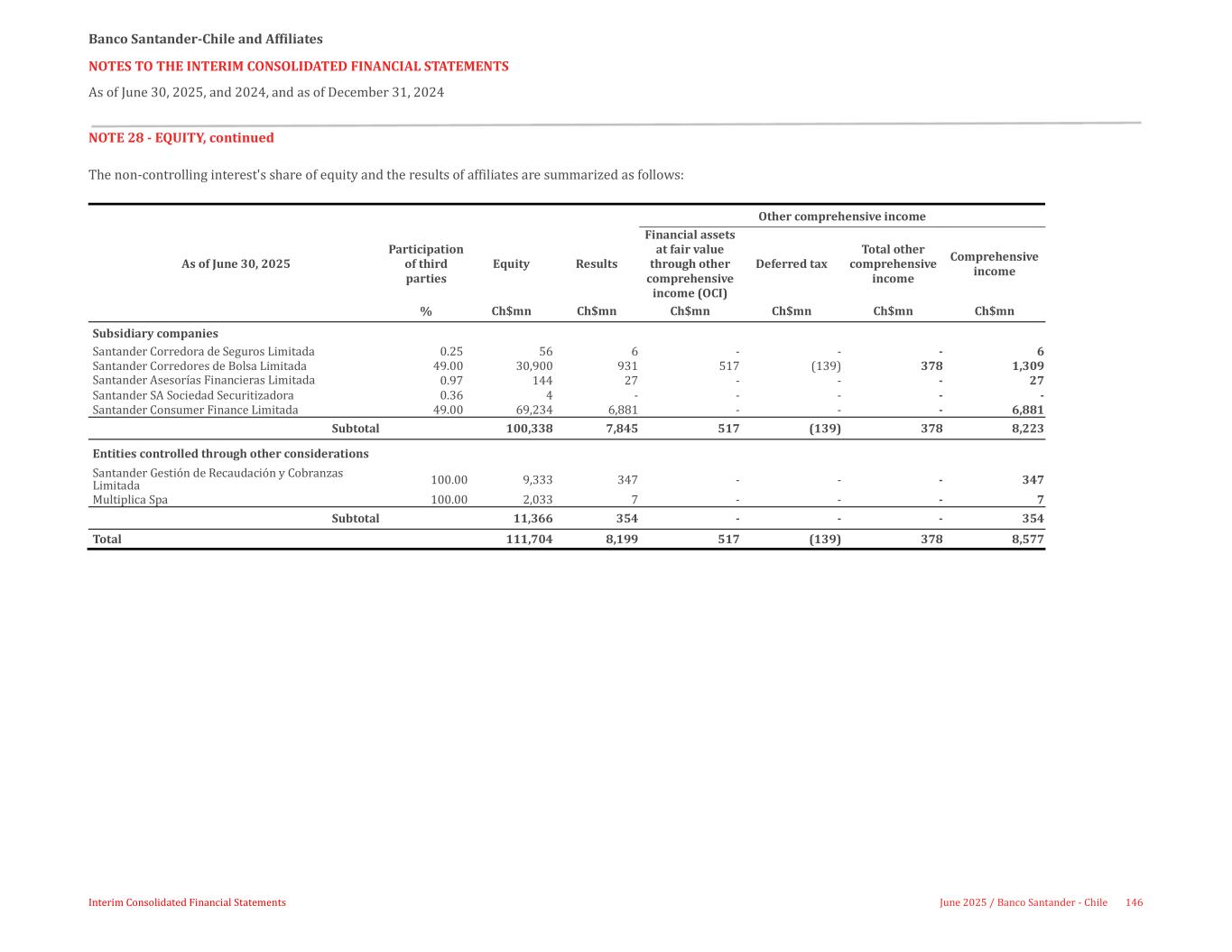 Banco Santander-Chile and Affiliates NOTES TO THE INTERIM CONSOLIDATED FINANCIAL STATEMENTS As of June 30, 2025, and 2024, and as of December 31, 2024 Interim Consolidated Financial Statements June 2025 / Banco Santander - Chile 146 NOTE 28 - EQUITY, continued The non-controlling interest's share of equity and the results of affiliates are summarized as follows: Other comprehensive income As of June 30, 2025 Participation of third parties Equity Results Financial assets at fair value through other comprehensive income (OCI) Deferred tax Total other comprehensive income Comprehensive income % Ch$mn Ch$mn Ch$mn Ch$mn Ch$mn Ch$mn Subsidiary companies Santander Corredora de Seguros Limitada 0.25 56 6 - - - 6 Santander Corredores de Bolsa Limitada 49.00 30,900 931 517 (139) 378 1,309 Santander Asesorías Financieras Limitada 0.97 144 27 - - - 27 Santander SA Sociedad Securitizadora 0.36 4 - - - - - Santander Consumer Finance Limitada 49.00 69,234 6,881 - - - 6,881 Subtotal 100,338 7,845 517 (139) 378 8,223 Entities controlled through other considerations Santander Gestión de Recaudación y Cobranzas Limitada 100.00 9,333 347 - - - 347 Multiplica Spa 100.00 2,033 7 - - - 7 Subtotal 11,366 354 - - - 354 Total 111,704 8,199 517 (139) 378 8,577