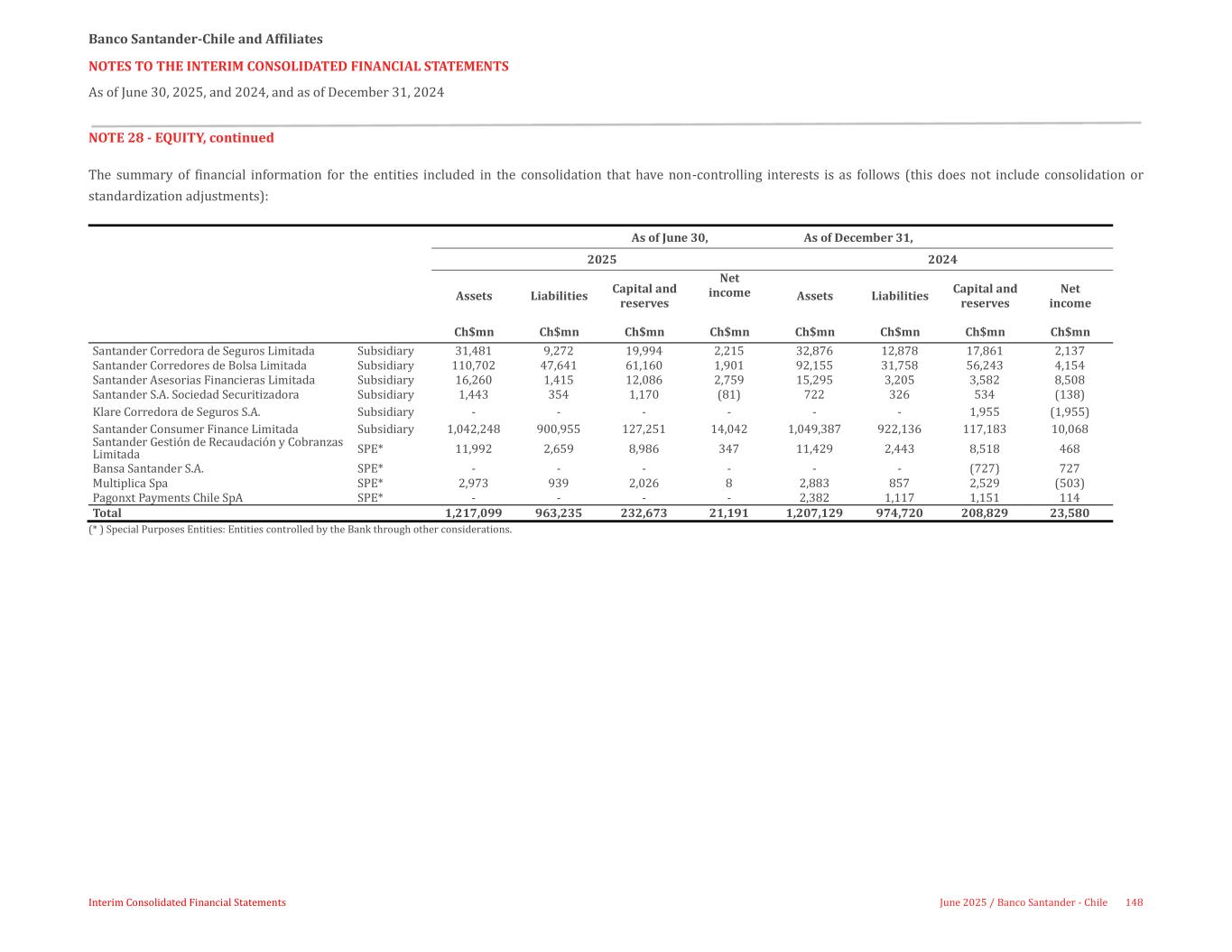 Banco Santander-Chile and Affiliates NOTES TO THE INTERIM CONSOLIDATED FINANCIAL STATEMENTS As of June 30, 2025, and 2024, and as of December 31, 2024 Interim Consolidated Financial Statements June 2025 / Banco Santander - Chile 148 NOTE 28 - EQUITY, continued The summary of financial information for the entities included in the consolidation that have non-controlling interests is as follows (this does not include consolidation or standardization adjustments): As of June 30, As of December 31, 2025 2024 Assets Liabilities Capital and reserves Net income Assets Liabilities Capital and reserves Net income Ch$mn Ch$mn Ch$mn Ch$mn Ch$mn Ch$mn Ch$mn Ch$mn Santander Corredora de Seguros Limitada Subsidiary 31,481 9,272 19,994 2,215 32,876 12,878 17,861 2,137 Santander Corredores de Bolsa Limitada Subsidiary 110,702 47,641 61,160 1,901 92,155 31,758 56,243 4,154 Santander Asesorias Financieras Limitada Subsidiary 16,260 1,415 12,086 2,759 15,295 3,205 3,582 8,508 Santander S.A. Sociedad Securitizadora Subsidiary 1,443 354 1,170 (81) 722 326 534 (138) Klare Corredora de Seguros S.A. Subsidiary - - - - - - 1,955 (1,955) Santander Consumer Finance Limitada Subsidiary 1,042,248 900,955 127,251 14,042 1,049,387 922,136 117,183 10,068 Santander Gestión de Recaudación y Cobranzas Limitada SPE* 11,992 2,659 8,986 347 11,429 2,443 8,518 468 Bansa Santander S.A. SPE* - - - - - - (727) 727 Multiplica Spa SPE* 2,973 939 2,026 8 2,883 857 2,529 (503) Pagonxt Payments Chile SpA SPE* - - - - 2,382 1,117 1,151 114 Total 1,217,099 963,235 232,673 21,191 1,207,129 974,720 208,829 23,580 (* ) Special Purposes Entities: Entities controlled by the Bank through other considerations.
