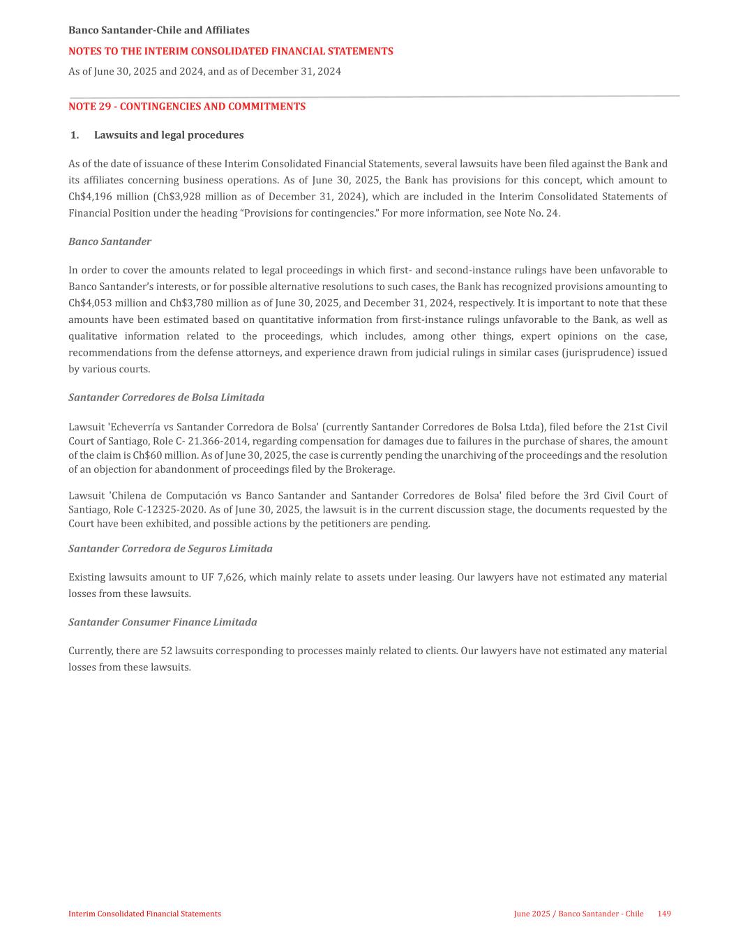 Banco Santander-Chile and Affiliates NOTES TO THE INTERIM CONSOLIDATED FINANCIAL STATEMENTS As of June 30, 2025 and 2024, and as of December 31, 2024 Interim Consolidated Financial Statements June 2025 / Banco Santander - Chile 149 NOTE 29 - CONTINGENCIES AND COMMITMENTS 1. Lawsuits and legal procedures As of the date of issuance of these Interim Consolidated Financial Statements, several lawsuits have been filed against the Bank and its affiliates concerning business operations. As of June 30, 2025, the Bank has provisions for this concept, which amount to Ch$4,196 million (Ch$3,928 million as of December 31, 2024), which are included in the Interim Consolidated Statements of . Banco Santander In order to cover the amounts related to legal proceedings in which first- and second-instance rulings have been unfavorable to ing to Ch$4,053 million and Ch$3,780 million as of June 30, 2025, and December 31, 2024, respectively. It is important to note that these amounts have been estimated based on quantitative information from first-instance rulings unfavorable to the Bank, as well as qualitative information related to the proceedings, which includes, among other things, expert opinions on the case, recommendations from the defense attorneys, and experience drawn from judicial rulings in similar cases (jurisprudence) issued by various courts. Santander Corredores de Bolsa Limitada Lawsuit 'Echeverría vs Santander Corredora de Bolsa' (currently Santander Corredores de Bolsa Ltda), filed before the 21st Civil Court of Santiago, Role C- 21.366-2014, regarding compensation for damages due to failures in the purchase of shares, the amount of the claim is Ch$60 million. As of June 30, 2025, the case is currently pending the unarchiving of the proceedings and the resolution of an objection for abandonment of proceedings filed by the Brokerage. Lawsuit 'Chilena de Computación vs Banco Santander and Santander Corredores de Bolsa' filed before the 3rd Civil Court of Santiago, Role C-12325-2020. As of June 30, 2025, the lawsuit is in the current discussion stage, the documents requested by the Court have been exhibited, and possible actions by the petitioners are pending. Santander Corredora de Seguros Limitada Existing lawsuits amount to UF 7,626, which mainly relate to assets under leasing. Our lawyers have not estimated any material losses from these lawsuits. Santander Consumer Finance Limitada Currently, there are 52 lawsuits corresponding to processes mainly related to clients. Our lawyers have not estimated any material losses from these lawsuits.