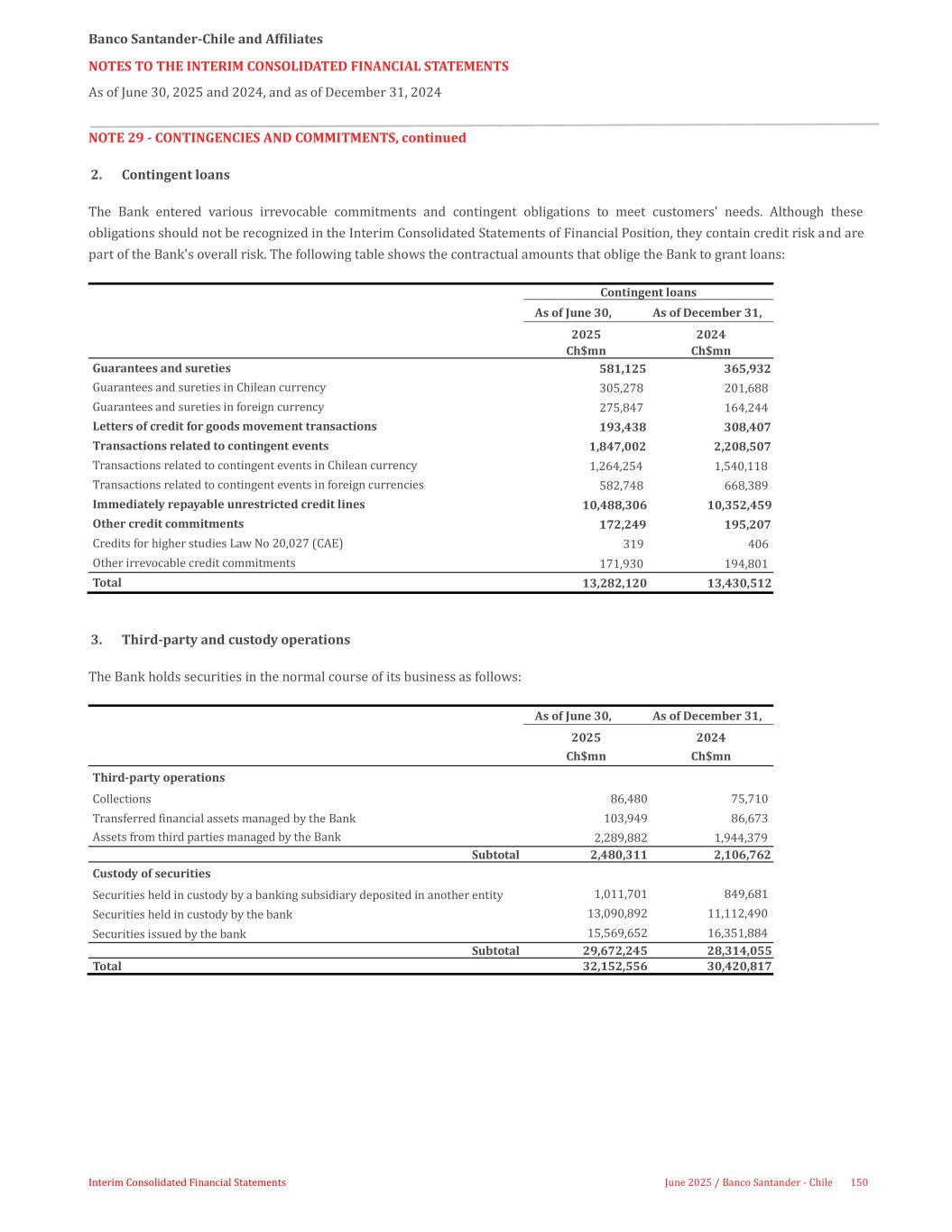 Banco Santander-Chile and Affiliates NOTES TO THE INTERIM CONSOLIDATED FINANCIAL STATEMENTS As of June 30, 2025 and 2024, and as of December 31, 2024 Interim Consolidated Financial Statements June 2025 / Banco Santander - Chile 150 NOTE 29 - CONTINGENCIES AND COMMITMENTS, continued 2. Contingent loans The Bank entered various irrevocable commitments and contingent obligations to meet customers' needs. Although these obligations should not be recognized in the Interim Consolidated Statements of Financial Position, they contain credit risk and are part of the Bank's overall risk. The following table shows the contractual amounts that oblige the Bank to grant loans: Contingent loans As of June 30, As of December 31, 2025 2024 Ch$mn Ch$mn Guarantees and sureties 581,125 365,932 Guarantees and sureties in Chilean currency 305,278 201,688 Guarantees and sureties in foreign currency 275,847 164,244 Letters of credit for goods movement transactions 193,438 308,407 Transactions related to contingent events 1,847,002 2,208,507 Transactions related to contingent events in Chilean currency 1,264,254 1,540,118 Transactions related to contingent events in foreign currencies 582,748 668,389 Immediately repayable unrestricted credit lines 10,488,306 10,352,459 Other credit commitments 172,249 195,207 Credits for higher studies Law No 20,027 (CAE) 319 406 Other irrevocable credit commitments 171,930 194,801 Total 13,282,120 13,430,512 3. Third-party and custody operations The Bank holds securities in the normal course of its business as follows: As of June 30, As of December 31, 2025 2024 Ch$mn Ch$mn Third-party operations Collections 86,480 75,710 Transferred financial assets managed by the Bank 103,949 86,673 Assets from third parties managed by the Bank 2,289,882 1,944,379 Subtotal 2,480,311 2,106,762 Custody of securities Securities held in custody by a banking subsidiary deposited in another entity 1,011,701 849,681 Securities held in custody by the bank 13,090,892 11,112,490 Securities issued by the bank 15,569,652 16,351,884 Subtotal 29,672,245 28,314,055 Total 32,152,556 30,420,817
