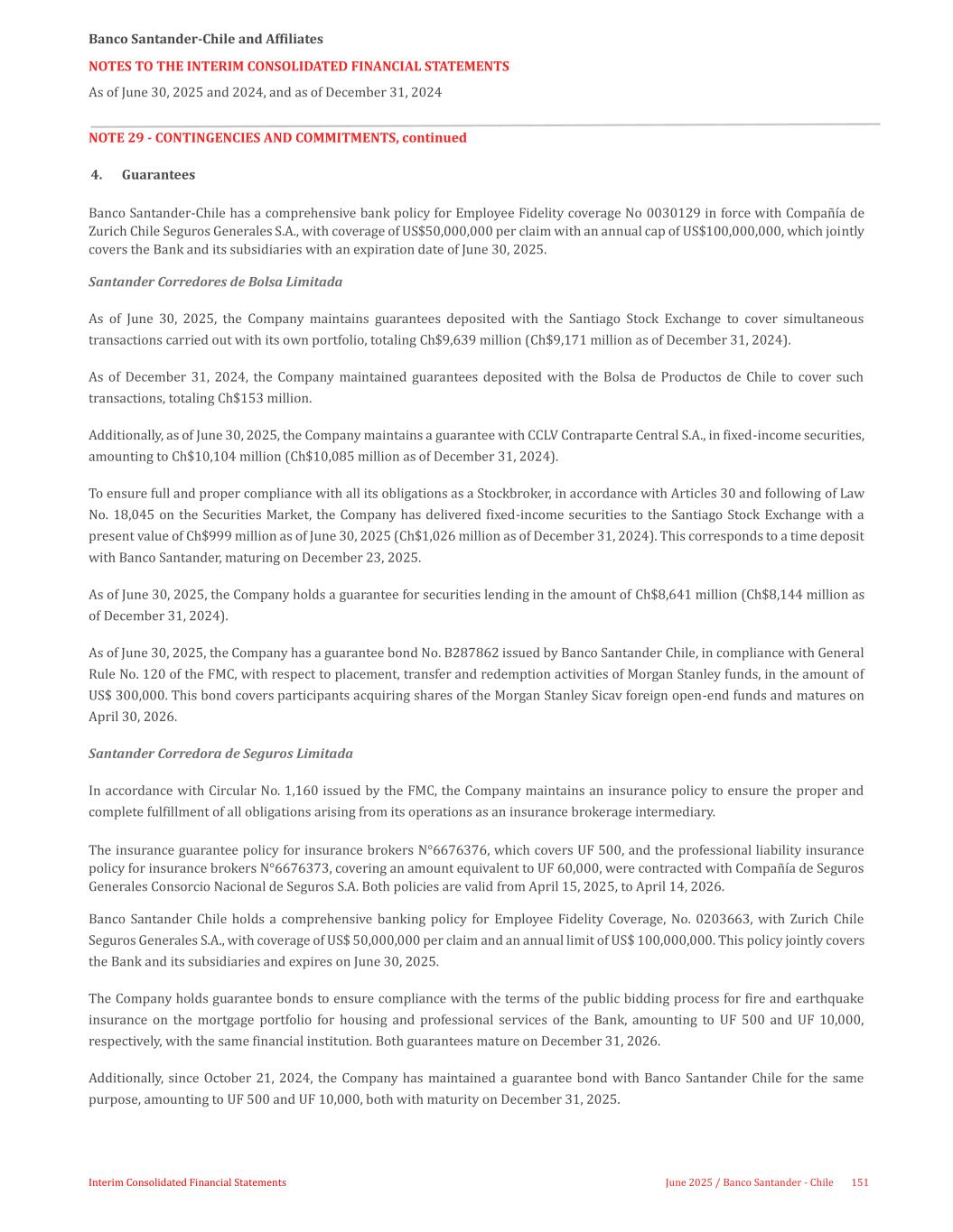 Banco Santander-Chile and Affiliates NOTES TO THE INTERIM CONSOLIDATED FINANCIAL STATEMENTS As of June 30, 2025 and 2024, and as of December 31, 2024 Interim Consolidated Financial Statements June 2025 / Banco Santander - Chile 151 NOTE 29 - CONTINGENCIES AND COMMITMENTS, continued 4. Guarantees Banco Santander-Chile has a comprehensive bank policy for Employee Fidelity coverage No 0030129 in force with Compañía de Zurich Chile Seguros Generales S.A., with coverage of US$50,000,000 per claim with an annual cap of US$100,000,000, which jointly covers the Bank and its subsidiaries with an expiration date of June 30, 2025. Santander Corredores de Bolsa Limitada As of June 30, 2025, the Company maintains guarantees deposited with the Santiago Stock Exchange to cover simultaneous transactions carried out with its own portfolio, totaling Ch$9,639 million (Ch$9,171 million as of December 31, 2024). As of December 31, 2024, the Company maintained guarantees deposited with the Bolsa de Productos de Chile to cover such transactions, totaling Ch$153 million. Additionally, as of June 30, 2025, the Company maintains a guarantee with CCLV Contraparte Central S.A., in fixed-income securities, amounting to Ch$10,104 million (Ch$10,085 million as of December 31, 2024). To ensure full and proper compliance with all its obligations as a Stockbroker, in accordance with Articles 30 and following of Law No. 18,045 on the Securities Market, the Company has delivered fixed-income securities to the Santiago Stock Exchange with a present value of Ch$999 million as of June 30, 2025 (Ch$1,026 million as of December 31, 2024). This corresponds to a time deposit with Banco Santander, maturing on December 23, 2025. As of June 30, 2025, the Company holds a guarantee for securities lending in the amount of Ch$8,641 million (Ch$8,144 million as of December 31, 2024). As of June 30, 2025, the Company has a guarantee bond No. B287862 issued by Banco Santander Chile, in compliance with General Rule No. 120 of the FMC, with respect to placement, transfer and redemption activities of Morgan Stanley funds, in the amount of US$ 300,000. This bond covers participants acquiring shares of the Morgan Stanley Sicav foreign open-end funds and matures on April 30, 2026. Santander Corredora de Seguros Limitada In accordance with Circular No. 1,160 issued by the FMC, the Company maintains an insurance policy to ensure the proper and complete fulfillment of all obligations arising from its operations as an insurance brokerage intermediary. The insurance guarantee policy for insurance brokers N°6676376, which covers UF 500, and the professional liability insurance policy for insurance brokers N°6676373, covering an amount equivalent to UF 60,000, were contracted with Compañía de Seguros Generales Consorcio Nacional de Seguros S.A. Both policies are valid from April 15, 2025, to April 14, 2026. Banco Santander Chile holds a comprehensive banking policy for Employee Fidelity Coverage, No. 0203663, with Zurich Chile Seguros Generales S.A., with coverage of US$ 50,000,000 per claim and an annual limit of US$ 100,000,000. This policy jointly covers the Bank and its subsidiaries and expires on June 30, 2025. The Company holds guarantee bonds to ensure compliance with the terms of the public bidding process for fire and earthquake insurance on the mortgage portfolio for housing and professional services of the Bank, amounting to UF 500 and UF 10,000, respectively, with the same financial institution. Both guarantees mature on December 31, 2026. Additionally, since October 21, 2024, the Company has maintained a guarantee bond with Banco Santander Chile for the same purpose, amounting to UF 500 and UF 10,000, both with maturity on December 31, 2025.