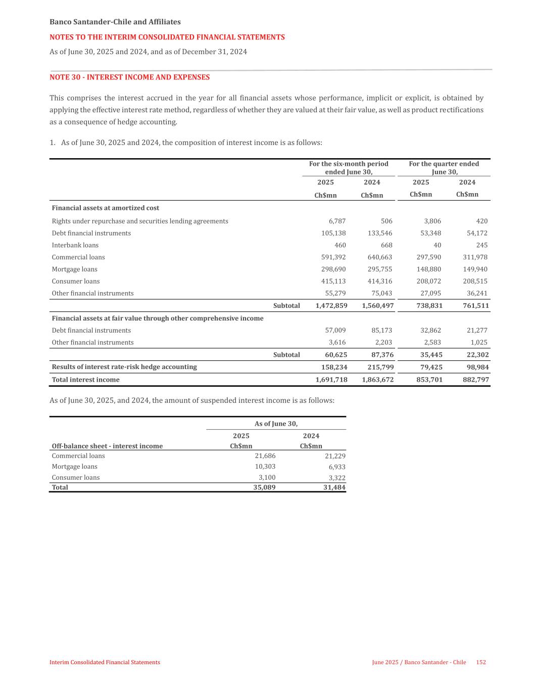 Banco Santander-Chile and Affiliates NOTES TO THE INTERIM CONSOLIDATED FINANCIAL STATEMENTS As of June 30, 2025 and 2024, and as of December 31, 2024 Interim Consolidated Financial Statements June 2025 / Banco Santander - Chile 152 NOTE 30 - INTEREST INCOME AND EXPENSES This comprises the interest accrued in the year for all financial assets whose performance, implicit or explicit, is obtained by applying the effective interest rate method, regardless of whether they are valued at their fair value, as well as product rectifications as a consequence of hedge accounting. 1. As of June 30, 2025 and 2024, the composition of interest income is as follows: For the six-month period ended June 30, For the quarter ended June 30, 2025 2024 2025 2024 Ch$mn Ch$mn Ch$mn Ch$mn Financial assets at amortized cost Rights under repurchase and securities lending agreements 6,787 506 3,806 420 Debt financial instruments 105,138 133,546 53,348 54,172 Interbank loans 460 668 40 245 Commercial loans 591,392 640,663 297,590 311,978 Mortgage loans 298,690 295,755 148,880 149,940 Consumer loans 415,113 414,316 208,072 208,515 Other financial instruments 55,279 75,043 27,095 36,241 Subtotal 1,472,859 1,560,497 738,831 761,511 Financial assets at fair value through other comprehensive income Debt financial instruments 57,009 85,173 32,862 21,277 Other financial instruments 3,616 2,203 2,583 1,025 Subtotal 60,625 87,376 35,445 22,302 Results of interest rate-risk hedge accounting 158,234 215,799 79,425 98,984 Total interest income 1,691,718 1,863,672 853,701 882,797 As of June 30, 2025, and 2024, the amount of suspended interest income is as follows: As of June 30, 2025 2024 Off-balance sheet - interest income Ch$mn Ch$mn Commercial loans 21,686 21,229 Mortgage loans 10,303 6,933 Consumer loans 3,100 3,322 Total 35,089 31,484