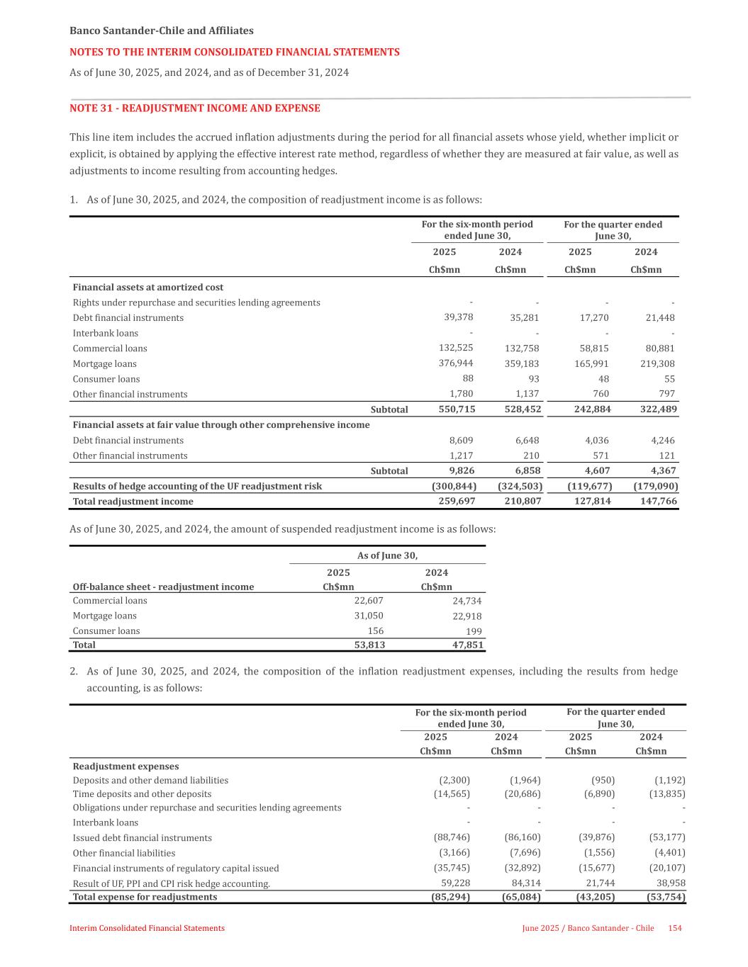 Banco Santander-Chile and Affiliates NOTES TO THE INTERIM CONSOLIDATED FINANCIAL STATEMENTS As of June 30, 2025, and 2024, and as of December 31, 2024 Interim Consolidated Financial Statements June 2025 / Banco Santander - Chile 154 NOTE 31 - READJUSTMENT INCOME AND EXPENSE This line item includes the accrued inflation adjustments during the period for all financial assets whose yield, whether implicit or explicit, is obtained by applying the effective interest rate method, regardless of whether they are measured at fair value, as well as adjustments to income resulting from accounting hedges. 1. As of June 30, 2025, and 2024, the composition of readjustment income is as follows: For the six-month period ended June 30, For the quarter ended June 30, 2025 2024 2025 2024 Ch$mn Ch$mn Ch$mn Ch$mn Financial assets at amortized cost Rights under repurchase and securities lending agreements - - - - Debt financial instruments 39,378 35,281 17,270 21,448 Interbank loans - - - - Commercial loans 132,525 132,758 58,815 80,881 Mortgage loans 376,944 359,183 165,991 219,308 Consumer loans 88 93 48 55 Other financial instruments 1,780 1,137 760 797 Subtotal 550,715 528,452 242,884 322,489 Financial assets at fair value through other comprehensive income Debt financial instruments 8,609 6,648 4,036 4,246 Other financial instruments 1,217 210 571 121 Subtotal 9,826 6,858 4,607 4,367 Results of hedge accounting of the UF readjustment risk (300,844) (324,503) (119,677) (179,090) Total readjustment income 259,697 210,807 127,814 147,766 As of June 30, 2025, and 2024, the amount of suspended readjustment income is as follows: As of June 30, 2025 2024 Off-balance sheet - readjustment income Ch$mn Ch$mn Commercial loans 22,607 24,734 Mortgage loans 31,050 22,918 Consumer loans 156 199 Total 53,813 47,851 2. As of June 30, 2025, and 2024, the composition of the inflation readjustment expenses, including the results from hedge accounting, is as follows: For the six-month period ended June 30, For the quarter ended June 30, 2025 2024 2025 2024 Ch$mn Ch$mn Ch$mn Ch$mn Readjustment expenses Deposits and other demand liabilities (2,300) (1,964) (950) (1,192) Time deposits and other deposits (14,565) (20,686) (6,890) (13,835) Obligations under repurchase and securities lending agreements - - - - Interbank loans - - - - Issued debt financial instruments (88,746) (86,160) (39,876) (53,177) Other financial liabilities (3,166) (7,696) (1,556) (4,401) Financial instruments of regulatory capital issued (35,745) (32,892) (15,677) (20,107) Result of UF, PPI and CPI risk hedge accounting. 59,228 84,314 21,744 38,958 Total expense for readjustments (85,294) (65,084) (43,205) (53,754)