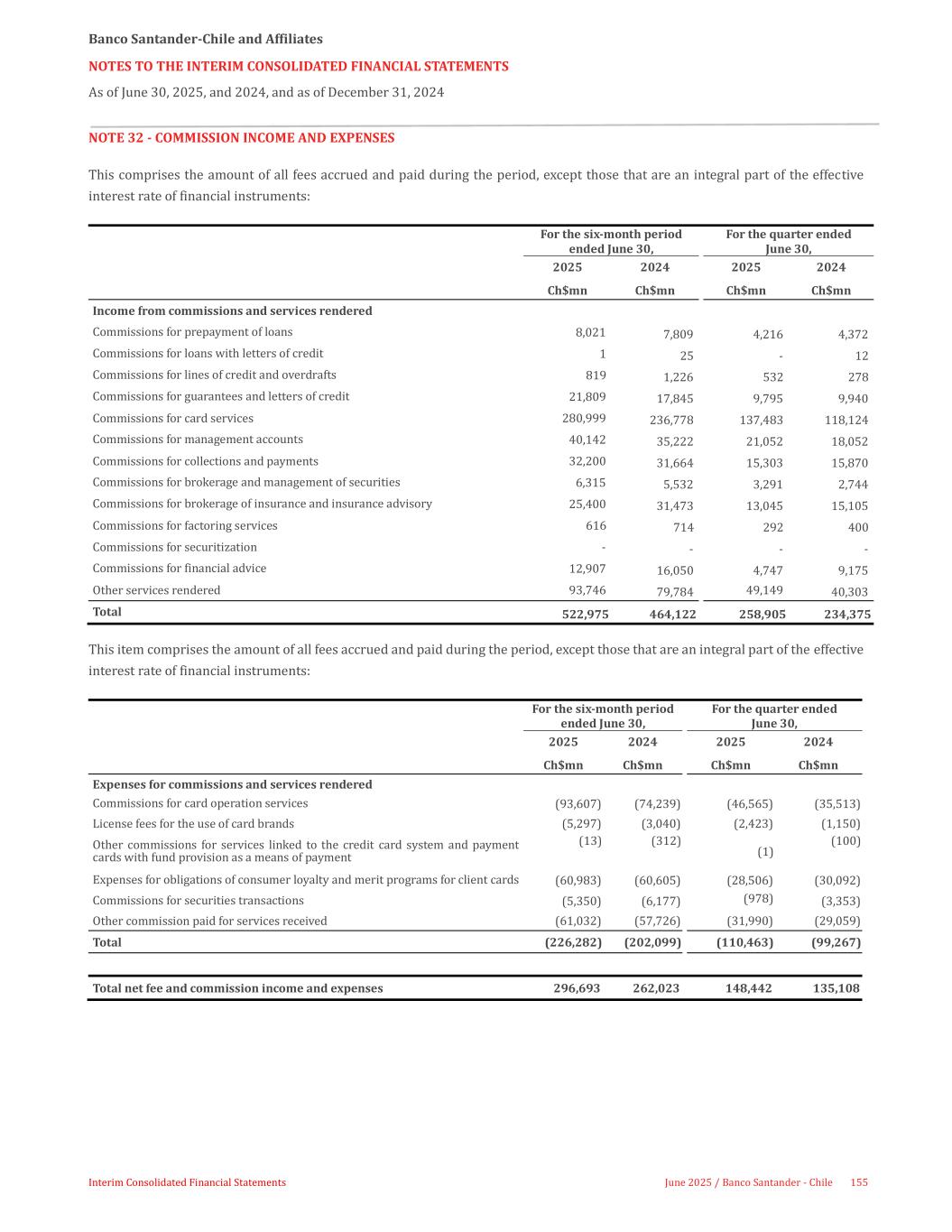 Banco Santander-Chile and Affiliates NOTES TO THE INTERIM CONSOLIDATED FINANCIAL STATEMENTS As of June 30, 2025, and 2024, and as of December 31, 2024 Interim Consolidated Financial Statements June 2025 / Banco Santander - Chile 155 NOTE 32 - COMMISSION INCOME AND EXPENSES This comprises the amount of all fees accrued and paid during the period, except those that are an integral part of the effective interest rate of financial instruments: For the six-month period ended June 30, For the quarter ended June 30, 2025 2024 2025 2024 Ch$mn Ch$mn Ch$mn Ch$mn Income from commissions and services rendered Commissions for prepayment of loans 8,021 7,809 4,216 4,372 Commissions for loans with letters of credit 1 25 - 12 Commissions for lines of credit and overdrafts 819 1,226 532 278 Commissions for guarantees and letters of credit 21,809 17,845 9,795 9,940 Commissions for card services 280,999 236,778 137,483 118,124 Commissions for management accounts 40,142 35,222 21,052 18,052 Commissions for collections and payments 32,200 31,664 15,303 15,870 Commissions for brokerage and management of securities 6,315 5,532 3,291 2,744 Commissions for brokerage of insurance and insurance advisory 25,400 31,473 13,045 15,105 Commissions for factoring services 616 714 292 400 Commissions for securitization - - - - Commissions for financial advice 12,907 16,050 4,747 9,175 Other services rendered 93,746 79,784 49,149 40,303 Total 522,975 464,122 258,905 234,375 This item comprises the amount of all fees accrued and paid during the period, except those that are an integral part of the effective interest rate of financial instruments: For the six-month period ended June 30, For the quarter ended June 30, 2025 2024 2025 2024 Ch$mn Ch$mn Ch$mn Ch$mn Expenses for commissions and services rendered Commissions for card operation services (93,607) (74,239) (46,565) (35,513) License fees for the use of card brands (5,297) (3,040) (2,423) (1,150) Other commissions for services linked to the credit card system and payment cards with fund provision as a means of payment (13) (312) (1) (100) Expenses for obligations of consumer loyalty and merit programs for client cards (60,983) (60,605) (28,506) (30,092) Commissions for securities transactions (5,350) (6,177) (978) (3,353) Other commission paid for services received (61,032) (57,726) (31,990) (29,059) Total (226,282) (202,099) (110,463) (99,267) Total net fee and commission income and expenses 296,693 262,023 148,442 135,108