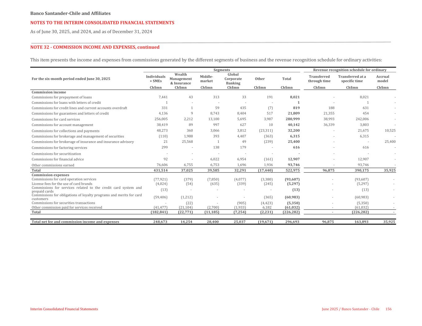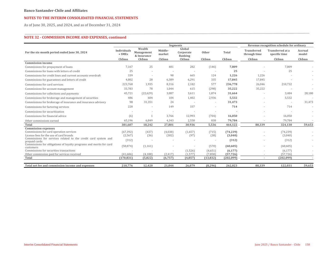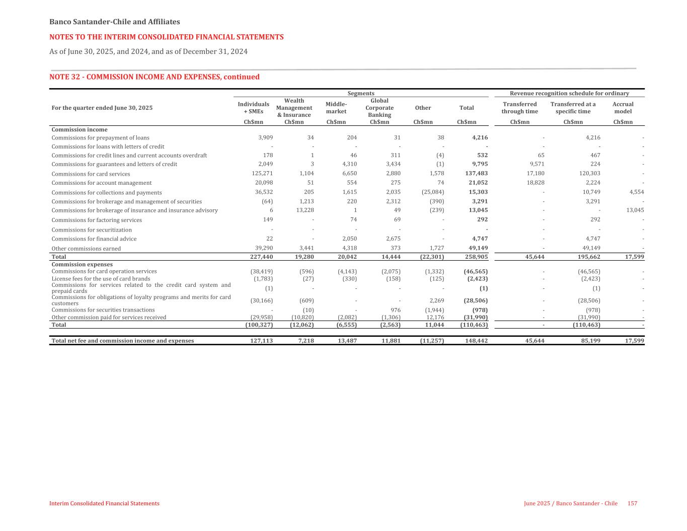 Banco Santander-Chile and Affiliates NOTES TO THE INTERIM CONSOLIDATED FINANCIAL STATEMENTS As of June 30, 2025, and 2024, and as of December 31, 2024 Interim Consolidated Financial Statements June 2025 / Banco Santander - Chile 157 NOTE 32 - COMMISSION INCOME AND EXPENSES, continued Segments Revenue recognition schedule for ordinary For the quarter ended June 30, 2025 Individuals + SMEs Wealth Management & Insurance Middle- market Global Corporate Banking Other Total Transferred through time Transferred at a specific time Accrual model Ch$mn Ch$mn Ch$mn Ch$mn Ch$mn Ch$mn Ch$mn Ch$mn Ch$mn Commission income Commissions for prepayment of loans 3,909 34 204 31 38 4,216 - 4,216 - Commissions for loans with letters of credit - - - - - - - - - Commissions for credit lines and current accounts overdraft 178 1 46 311 (4) 532 65 467 - Commissions for guarantees and letters of credit 2,049 3 4,310 3,434 (1) 9,795 9,571 224 - Commissions for card services 125,271 1,104 6,650 2,880 1,578 137,483 17,180 120,303 - Commissions for account management 20,098 51 554 275 74 21,052 18,828 2,224 - Commissions for collections and payments 36,532 205 1,615 2,035 (25,084) 15,303 - 10,749 4,554 Commissions for brokerage and management of securities (64) 1,213 220 2,312 (390) 3,291 - 3,291 - Commissions for brokerage of insurance and insurance advisory 6 13,228 1 49 (239) 13,045 - - 13,045 Commissions for factoring services 149 - 74 69 - 292 - 292 - Commissions for securitization - - - - - - - - - Commissions for financial advice 22 - 2,050 2,675 - 4,747 - 4,747 - Other commissions earned 39,290 3,441 4,318 373 1,727 49,149 - 49,149 - Total 227,440 19,280 20,042 14,444 (22,301) 258,905 45,644 195,662 17,599 Commission expenses Commissions for card operation services (38,419) (596) (4,143) (2,075) (1,332) (46,565) - (46,565) - License fees for the use of card brands (1,783) (27) (330) (158) (125) (2,423) - (2,423) - Commissions for services related to the credit card system and prepaid cards (1) - - - - (1) - (1) - Commissions for obligations of loyalty programs and merits for card customers (30,166) (609) - - 2,269 (28,506) - (28,506) - Commissions for securities transactions - (10) - 976 (1,944) (978) - (978) - Other commission paid for services received (29,958) (10,820) (2,082) (1,306) 12,176 (31,990) - (31,990) - Total (100,327) (12,062) (6,555) (2,563) 11,044 (110,463) - (110,463) - Total net fee and commission income and expenses 127,113 7,218 13,487 11,881 (11,257) 148,442 45,644 85,199 17,599