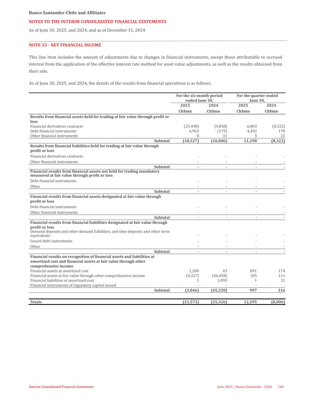 Banco Santander-Chile and Affiliates NOTES TO THE INTERIM CONSOLIDATED FINANCIAL STATEMENTS As of June 30, 2025, and 2024, and as of December 31, 2024 Interim Consolidated Financial Statements June 2025 / Banco Santander - Chile 160 NOTE 33 - NET FINANCIAL INCOME This line item includes the amount of adjustments due to changes in financial instruments, except those attributable to accrued interest from the application of the effective interest rate method for asset value adjustments, as well as the results obtained from their sale. As of June 30, 2025, and 2024, the details of the results from financial operations is as follows: For the six-month period ended June 30, For the quarter ended June 30, 2025 2024 2025 2024 Ch$mn Ch$mn Ch$mn Ch$mn Results from financial assets held for trading at fair value through profit or loss Financial derivatives contracts (25,498) (9,858) 6,803 (8,522) Debt financial instruments 6,963 (179) 4,492 178 Other financial instruments 8 31 3 22 Subtotal (18,527) (10,006) 11,298 (8,322) Results from financial liabilities held for trading at fair value through profit or loss Financial derivatives contracts - - - - Other financial instruments - - - - Subtotal - - - - Financial results from financial assets not held for trading mandatory measured at fair value through profit or loss Debt financial instruments - - - - Other - - - - Subtotal - - - - Financial results from financial assets designated at fair value through profit or loss Debt financial instruments - - - - Other financial instruments - - - - Subtotal - - - - Financial results from financial liabilities designated at fair value through profit or loss Demand deposits and other demand liabilities, and time deposits and other term equivalents - - - - Issued debt instruments - - - - Other - - - - Subtotal - - - - Financial results on recognition of financial assets and liabilities at amortized cost and financial assets at fair value through other comprehensive income Financial assets at amortized cost 1,280 43 891 174 Financial assets at fair value through other comprehensive income (4,327) (46,458) 105 111 Financial liabilities at amortized cost 1 1,095 1 31 Financial instruments of regulatory capital issued - - - - Subtotal (3,046) (45,320) 997 316 Totals (21,573) (55,326) 12,295 (8,006)