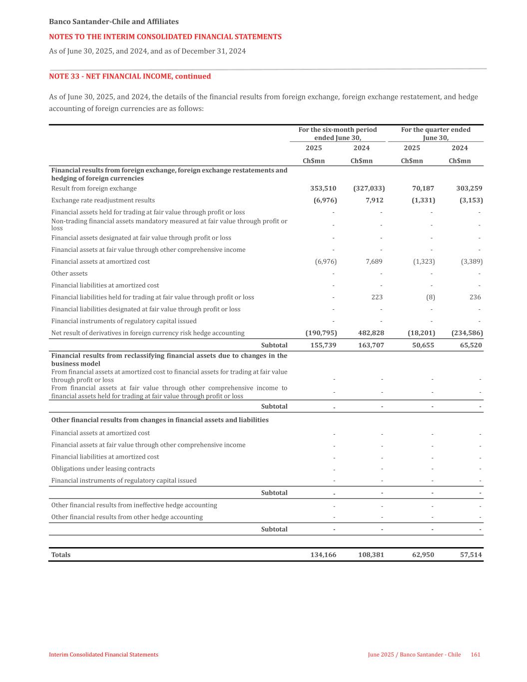 Banco Santander-Chile and Affiliates NOTES TO THE INTERIM CONSOLIDATED FINANCIAL STATEMENTS As of June 30, 2025, and 2024, and as of December 31, 2024 Interim Consolidated Financial Statements June 2025 / Banco Santander - Chile 161 NOTE 33 - NET FINANCIAL INCOME, continued As of June 30, 2025, and 2024, the details of the financial results from foreign exchange, foreign exchange restatement, and hedge accounting of foreign currencies are as follows: For the six-month period ended June 30, For the quarter ended June 30, 2025 2024 2025 2024 Ch$mn Ch$mn Ch$mn Ch$mn Financial results from foreign exchange, foreign exchange restatements and hedging of foreign currencies Result from foreign exchange 353,510 (327,033) 70,187 303,259 Exchange rate readjustment results (6,976) 7,912 (1,331) (3,153) Financial assets held for trading at fair value through profit or loss - - - - Non-trading financial assets mandatory measured at fair value through profit or loss - - - - Financial assets designated at fair value through profit or loss - - - - Financial assets at fair value through other comprehensive income - - - - Financial assets at amortized cost (6,976) 7,689 (1,323) (3,389) Other assets - - - - Financial liabilities at amortized cost - - - - Financial liabilities held for trading at fair value through profit or loss - 223 (8) 236 Financial liabilities designated at fair value through profit or loss - - - - Financial instruments of regulatory capital issued - - - - Net result of derivatives in foreign currency risk hedge accounting (190,795) 482,828 (18,201) (234,586) Subtotal 155,739 163,707 50,655 65,520 Financial results from reclassifying financial assets due to changes in the business model From financial assets at amortized cost to financial assets for trading at fair value through profit or loss - - - - From financial assets at fair value through other comprehensive income to financial assets held for trading at fair value through profit or loss - - - - Subtotal - - - - Other financial results from changes in financial assets and liabilities Financial assets at amortized cost - - - - Financial assets at fair value through other comprehensive income - - - - Financial liabilities at amortized cost - - - - Obligations under leasing contracts - - - - Financial instruments of regulatory capital issued - - - - Subtotal - - - - Other financial results from ineffective hedge accounting - - - - Other financial results from other hedge accounting - - - - Subtotal - - - - Totals 134,166 108,381 62,950 57,514