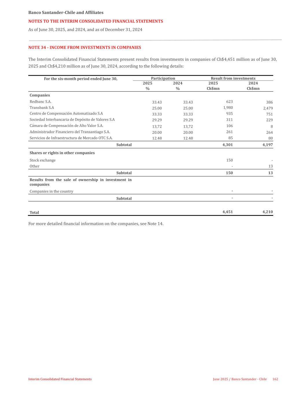 Banco Santander-Chile and Affiliates NOTES TO THE INTERIM CONSOLIDATED FINANCIAL STATEMENTS As of June 30, 2025, and 2024, and as of December 31, 2024 Interim Consolidated Financial Statements June 2025 / Banco Santander - Chile 162 NOTE 34 - INCOME FROM INVESTMENTS IN COMPANIES The Interim Consolidated Financial Statements present results from investments in companies of Ch$4,451 million as of June 30, 2025 and Ch$4,210 million as of June 30, 2024, according to the following details: For the six-month period ended June 30, Participation Result from investments 2025 2024 2025 2024 % % Ch$mn Ch$mn Companies Redbanc S.A. 33.43 33.43 623 386 Transbank S.A 25.00 25.00 1,980 2,479 Centro de Compensación Automatizado S.A 33.33 33.33 935 751 Sociedad Interbancaria de Depósito de Valores S.A 29.29 29.29 311 229 Cámara de Compensación de Alto Valor S.A. 13,72 13,72 106 8 Administrador Financiero del Transantiago S.A. 20.00 20.00 261 264 Servicios de Infraestructura de Mercado OTC S.A. 12.48 12.48 85 80 Subtotal 4,301 4,197 Shares or rights in other companies Stock exchange 150 - Other - 13 Subtotal 150 13 Results from the sale of ownership in investment in companies Companies in the country - - Subtotal - - Total 4,451 4,210 For more detailed financial information on the companies, see Note 14.