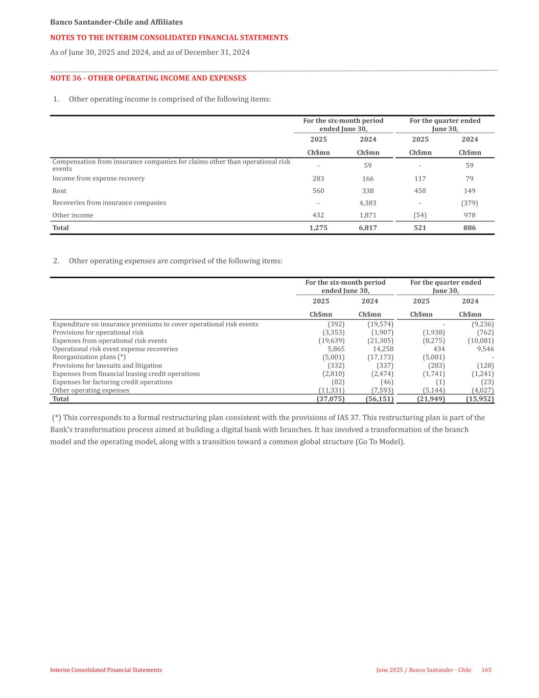 Banco Santander-Chile and Affiliates NOTES TO THE INTERIM CONSOLIDATED FINANCIAL STATEMENTS As of June 30, 2025 and 2024, and as of December 31, 2024 Interim Consolidated Financial Statements June 2025 / Banco Santander - Chile 165 NOTE 36 - OTHER OPERATING INCOME AND EXPENSES 1. Other operating income is comprised of the following items: For the six-month period ended June 30, For the quarter ended June 30, 2025 2024 2025 2024 Ch$mn Ch$mn Ch$mn Ch$mn Compensation from insurance companies for claims other than operational risk events - 59 - 59 Income from expense recovery 283 166 117 79 Rent 560 338 458 149 Recoveries from insurance companies - 4,383 - (379) Other income 432 1,871 (54) 978 Total 1,275 6,817 521 886 2. Other operating expenses are comprised of the following items: For the six-month period ended June 30, For the quarter ended June 30, 2025 2024 2025 2024 Ch$mn Ch$mn Ch$mn Ch$mn Expenditure on insurance premiums to cover operational risk events (392) (19,574) - (9,236) Provisions for operational risk (3,353) (1,907) (1,938) (762) Expenses from operational risk events (19,639) (21,305) (8,275) (10,081) Operational risk event expense recoveries 5,865 14,258 434 9,546 Reorganization plans (*) (5,001) (17,173) (5,001) - Provisions for lawsuits and litigation (332) (337) (283) (128) Expenses from financial leasing credit operations (2,810) (2,474) (1,741) (1,241) Expenses for factoring credit operations (82) (46) (1) (23) Other operating expenses (11,331) (7,593) (5,144) (4,027) Total (37,075) (56,151) (21,949) (15,952) (*) This corresponds to a formal restructuring plan consistent with the provisions of IAS 37. This restructuring plan is part of the h model and the operating model, along with a transition toward a common global structure (Go To Model).